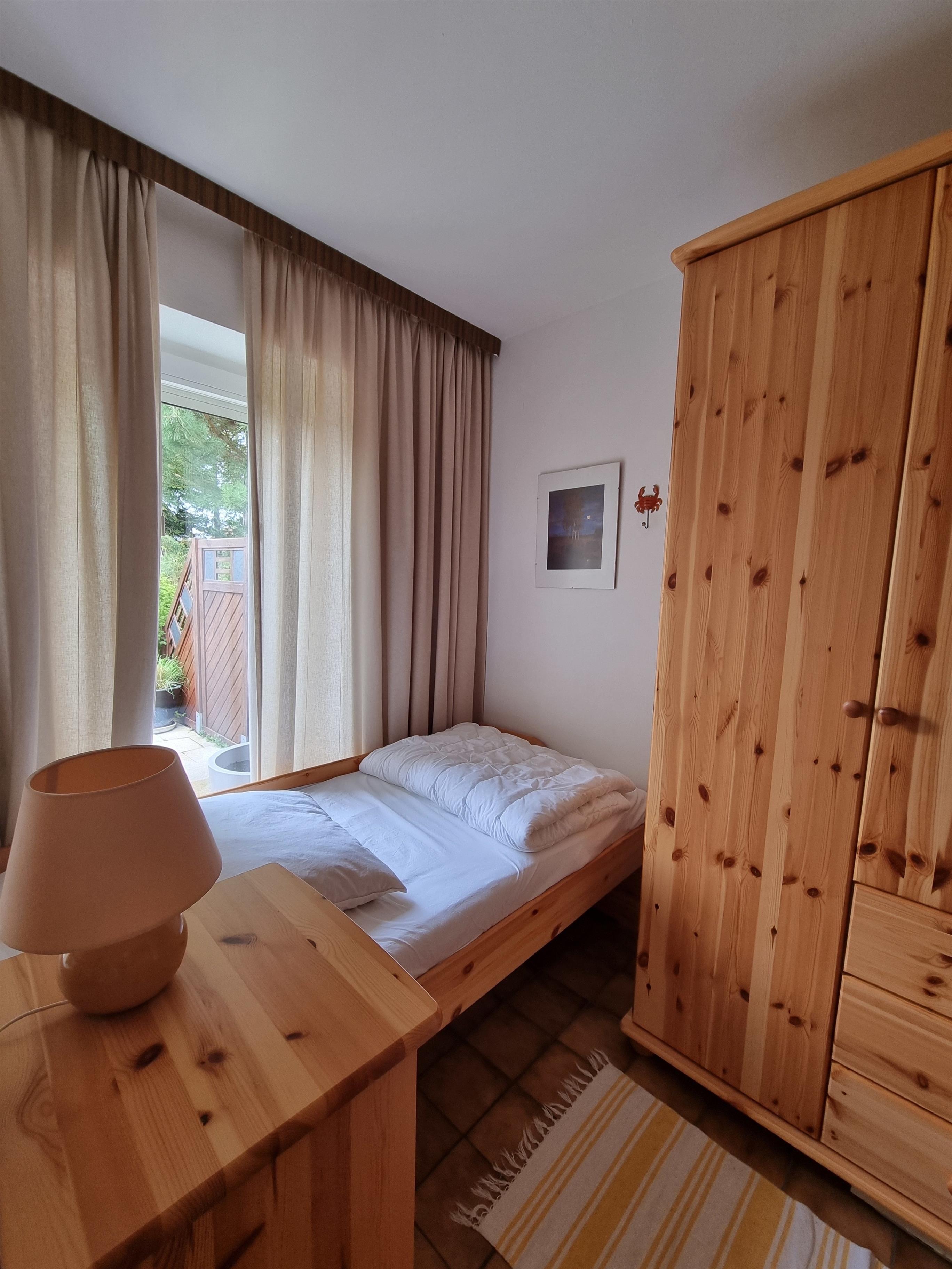 In der gemütlichen 34 m² großen Ferienwohnung in Kellenhusen gelangt man über den Flur in die kleine Küche, von da aus kommen Sie in das helle Wohnzimmer, welches mit einer gemütlichen Couch und einem einladenden Essbereich ausgestattet ist. Von da aus gelangen Sie auf die große Terrasse und in den bepflanzten Garten. Ebenfalls hat das Wohnzimmer ein Radio und einen Fernseher zu bieten. Das Schlafzimmer kann man vom Wohnzimmer aus erreichen, dort stehen 2x Einzelbetten für Sie bereit. Vom Flur aus führt der Weg in ein kleines Badeszimmer. Zudem bietet die Ferienwohnung kostenlose Parkmöglichkeit und einen Fahrradabstellraum, der bei Bedarf genutz werden kann