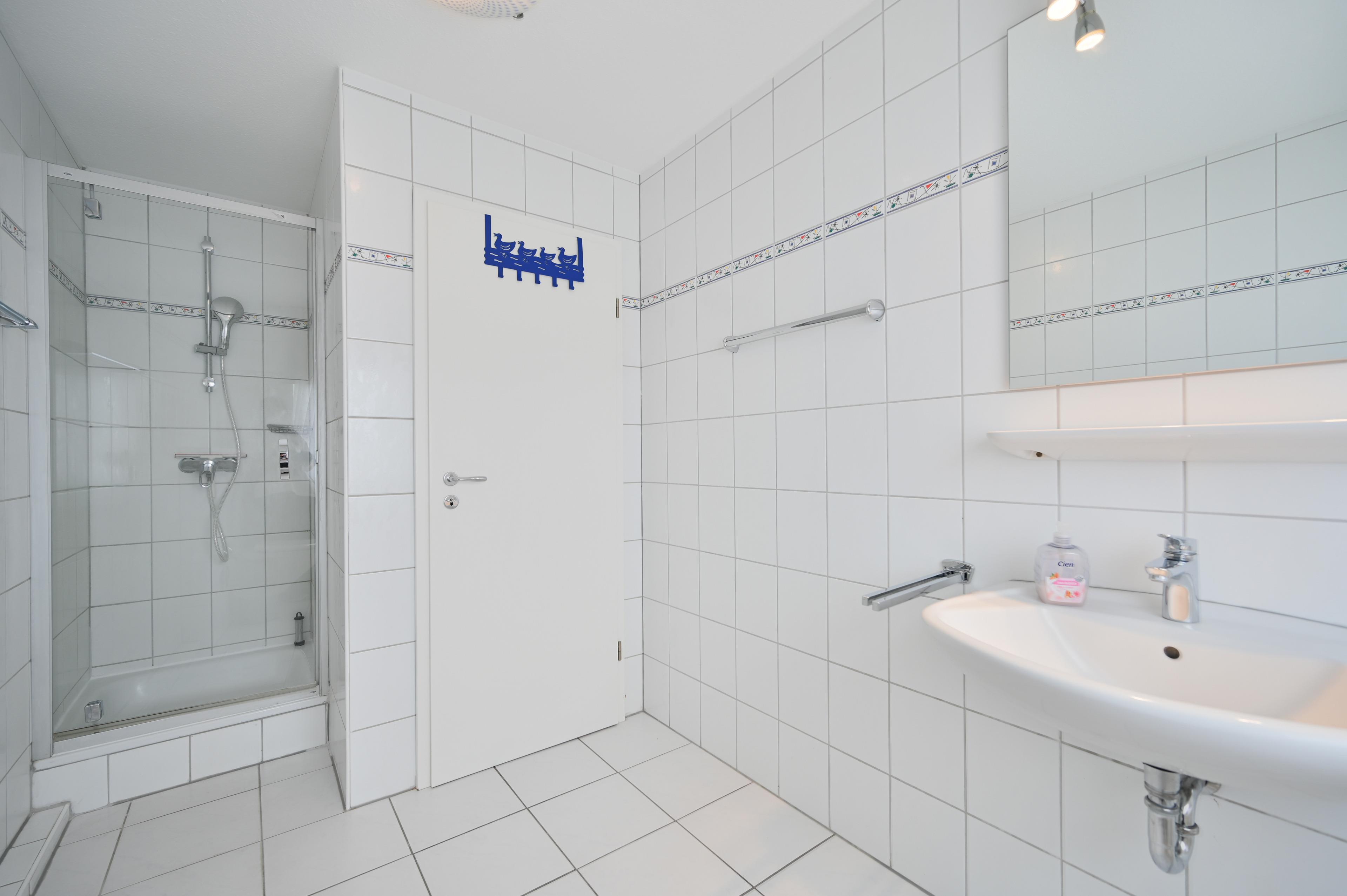 Das Badezimmer verfügt über eine Dusche und ein WC.