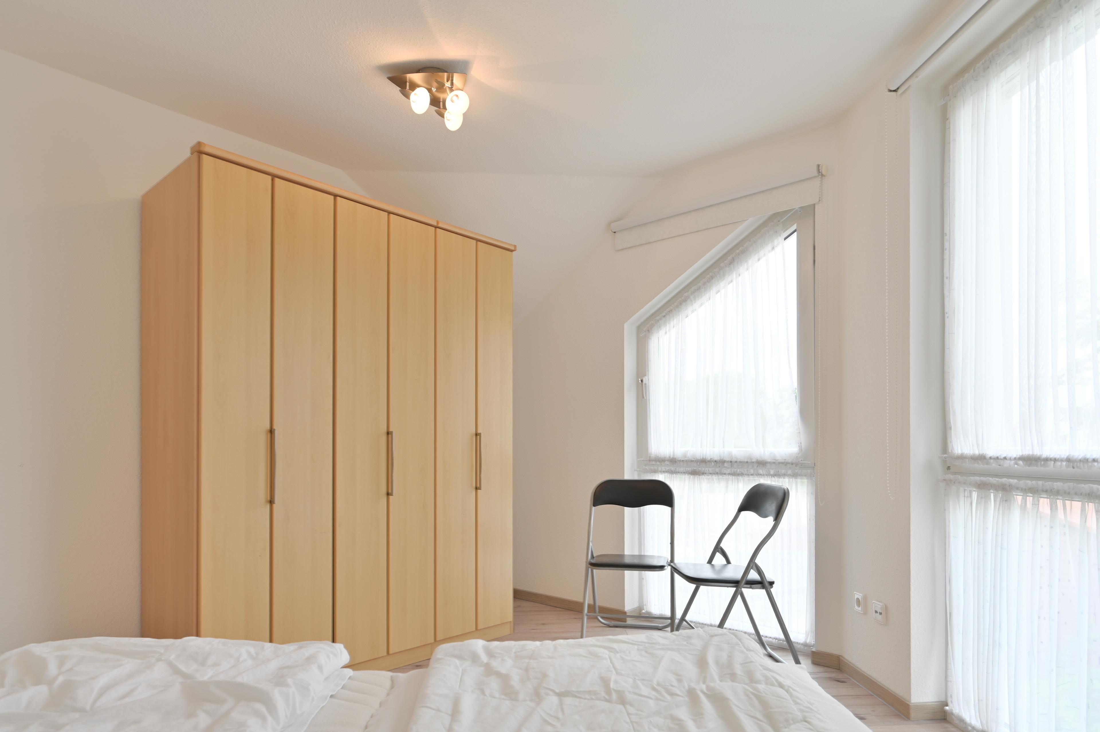 Das separate Schlafzimmer ist mit einem komfortablen Doppelbett, Nachttischen, Leseleuchten und einem geräumigen Kleiderschrank ausgestattet - hier finden Sie alles, was Sie für eine erholsame Nachtruhe benötigen.