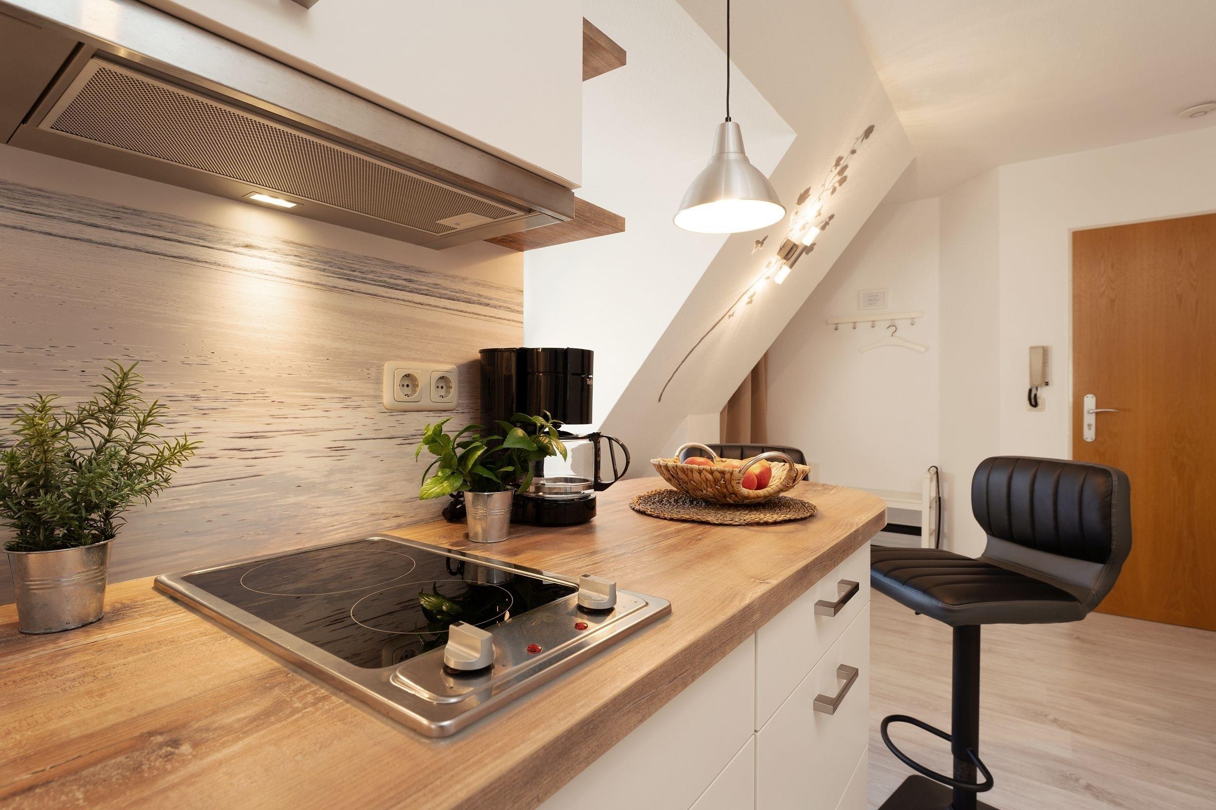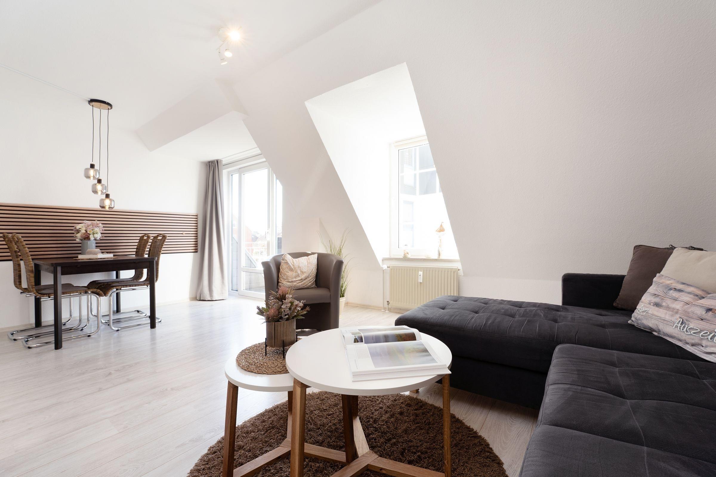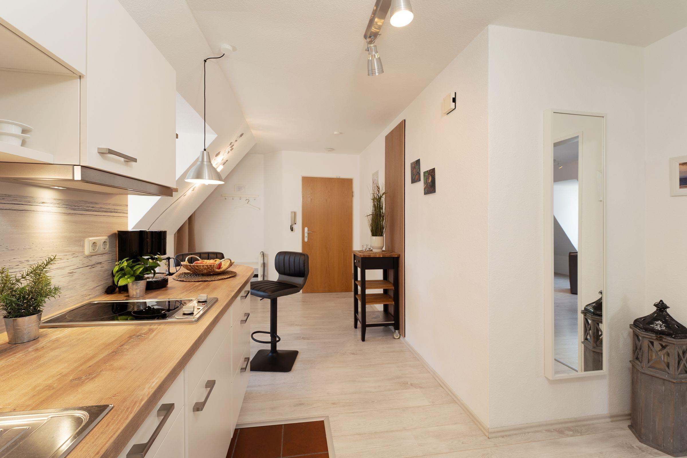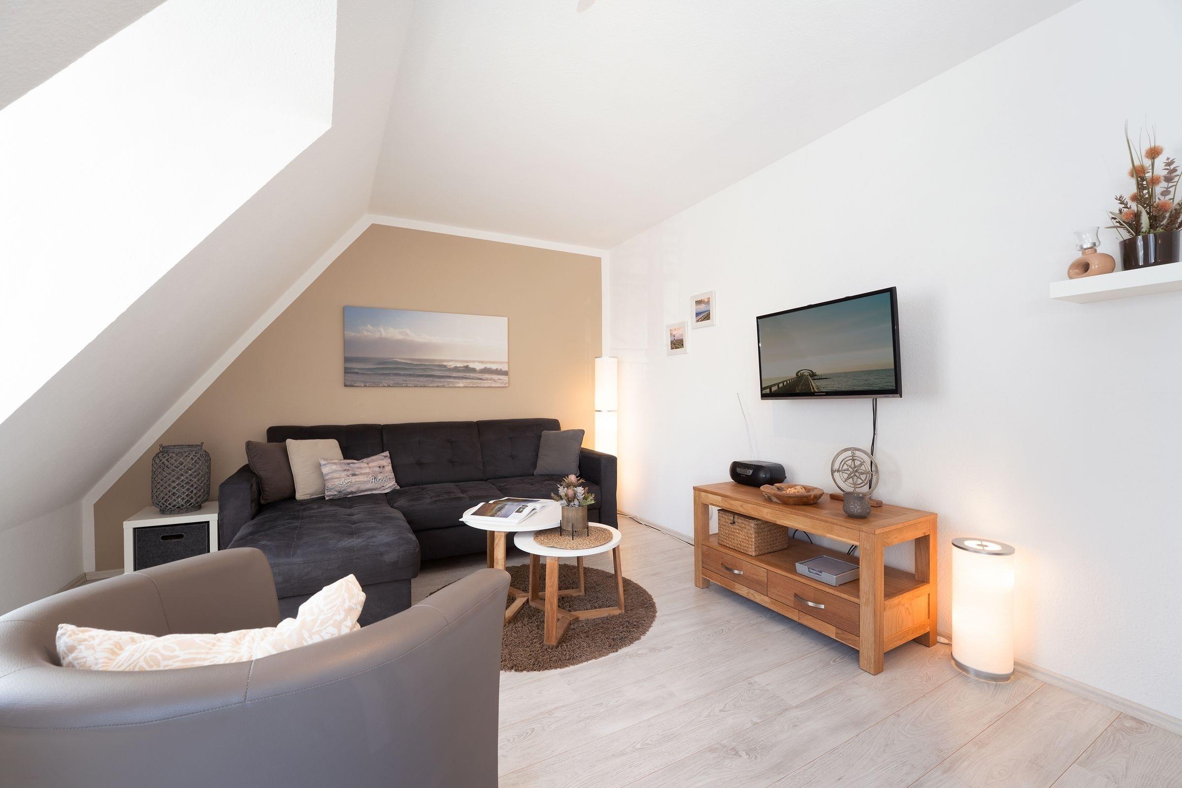 Sie möchten einfach mal abschalten und die Seele baumeln lassen? Dann sind Sie in dieser zauberhaften Ferienwohnung Moby Dick im Haus Gorch Fock genau richtig. Die durchdachte Raumaufteilung sowie die liebevoll ausgesuchte Einrichtung machen das Objekt zu einem echten Schmuckstück. Der Wohn-/Ess-Bereich begrüßt Sie mit einer kuscheligen Sofa-Landschaft, die Dachschrägen sorgen dabei für ein gemütliches Ambiente. Hier können Sie kuschelige Abende vor dem TV-Gerät verbringen. Für die Nacht lässt sich das Sofa mit wenigen Handgriffen in ein Doppelbett (ca. 150x200 cm) verwandeln. Im selben Raum befindet sich auch eine helle, schicke Ess-Ecke. Hier können Sie Ihre Mahlzeiten genießen oder auch lustige Spiele-Abende veranstalten. Und Sie können von hier aus auch den möblierten Balkon betreten und in der Sonne sitzen. Die gut ausgestattete Küche mit Geschirrspüler befindet sich separat im Flurbereich und hat einen raffinierten Tresen, an dem Sie auch gut verweilen können. Im geräumigen Schafzimmer steht ein Doppelbett bereit, in dem Sie sicher traumhaft schlafen werden. Das moderne Duschbad mit Fenster lässt keine Wünsche offen. Eine lauschige Kaminecke im Gemeinschaftsraum des Hauses rundet das Angebot ab.