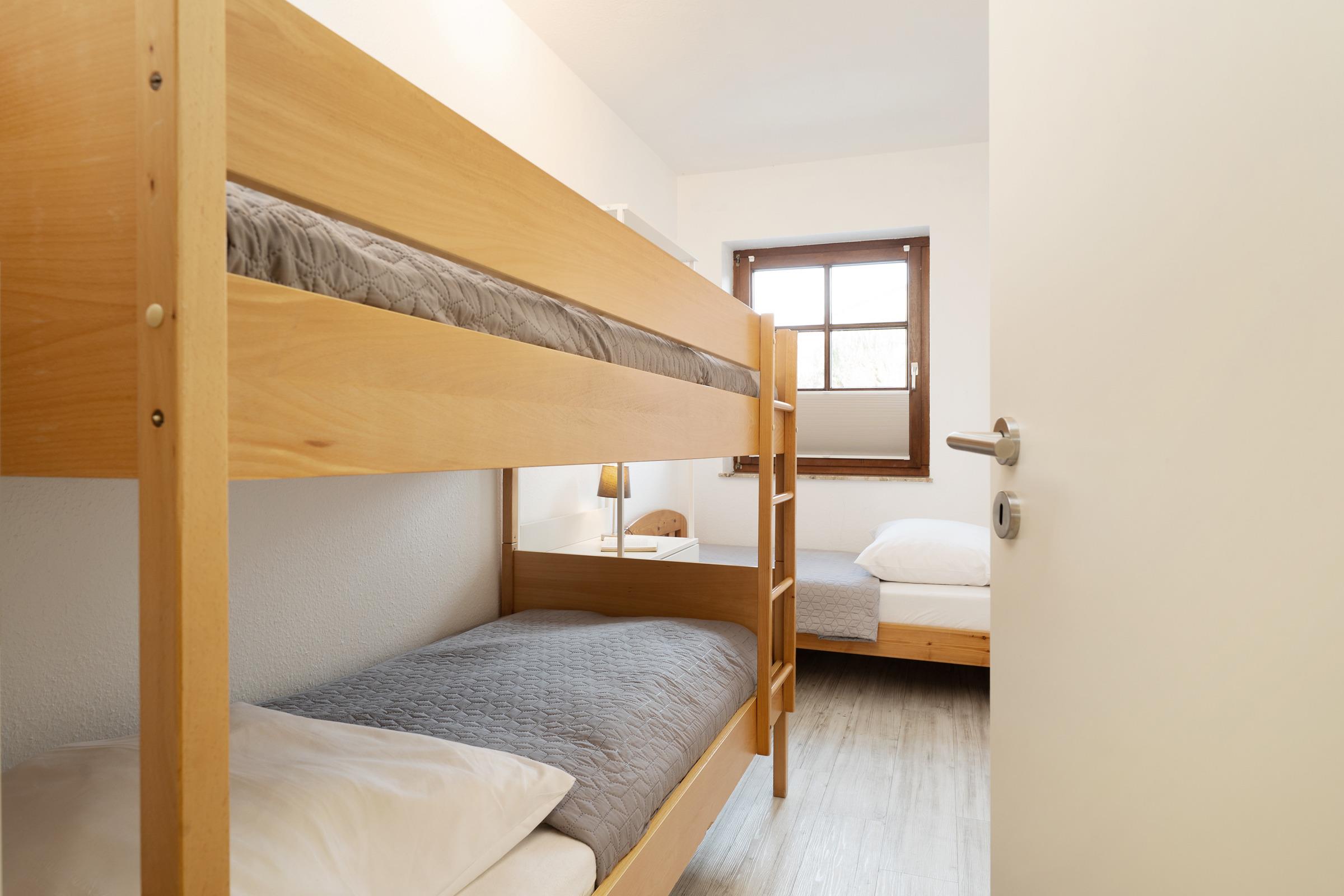 Schlafzimmer 2: 1 Etagenbett (2x 90x200cm), 1 Einzelbett (90x170cm), Kleiderschrank, Verdunkelung (Rollo)