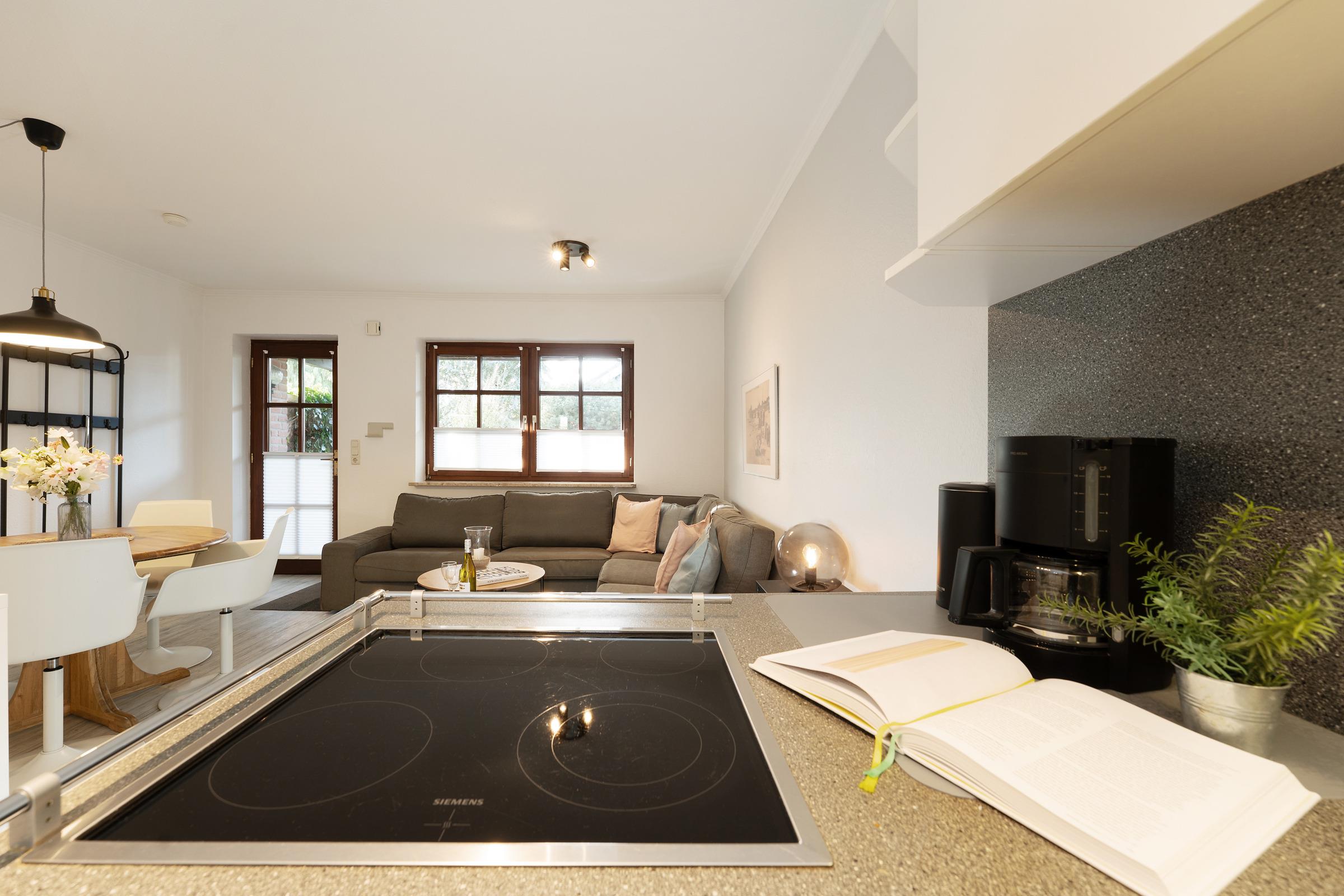 Sie suchen Ruhe und Erholung? Dann sind Sie hier genau richtig. Die schöne Ferienwohnung besticht durch ihre gemütliche und durchdachte Aufteilung im Wohnbereich: Sie haben die Wahl zwischen einer großen, kuscheligen Sofalandschaft und einer stylischen Essecke. Ein TV-Gerät sorgt für Unterhaltung. Auf der möblierten Süd-Terrasse können Sie Ihre wohl verdiente Auszeit bei Sonnenschein genießen. Zurück im Wohnbereich: Die offene, moderne Küche mit Spülmaschine und heller Front bietet alles, was Sie für eine Selbstversorgung im Urlaub brauchen. Wunderbar schlafen werden Sie sicherlich in den beiden Schlafzimmern: Ein Raum ist mit einem Doppelbett (180x200 cm) und einem Kleiderschrank ausgestattet. In dem anderen Raum befinden sich ein Etagenbett (je 90x200 cm), ein einzelnes Kinderbett (90x170 cm) und ein Kleiderschrank. Das schicke, komfortable Duschbad mit Handtuchwärmer garantiert einen guten Start in den den neuen Urlaubstag.