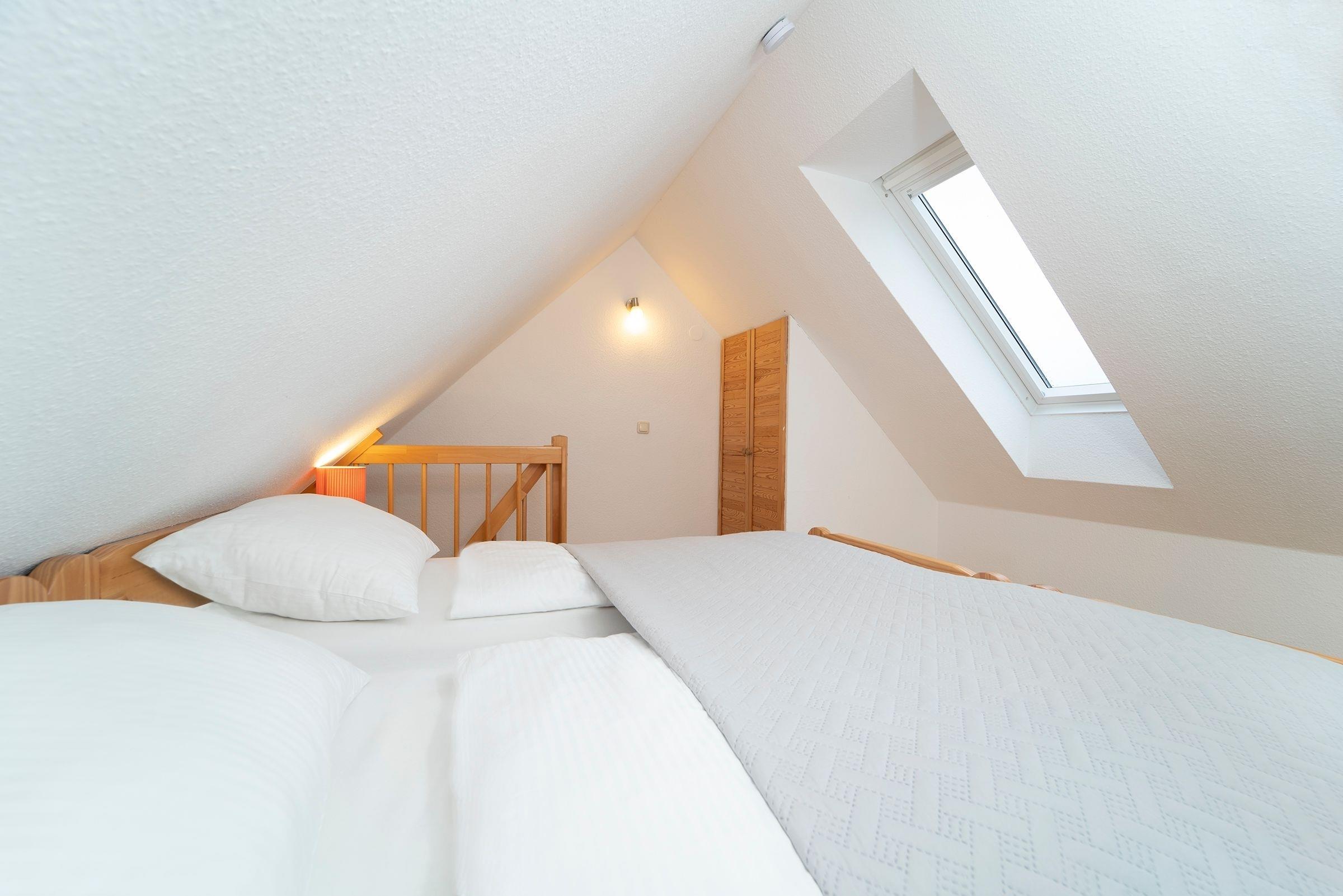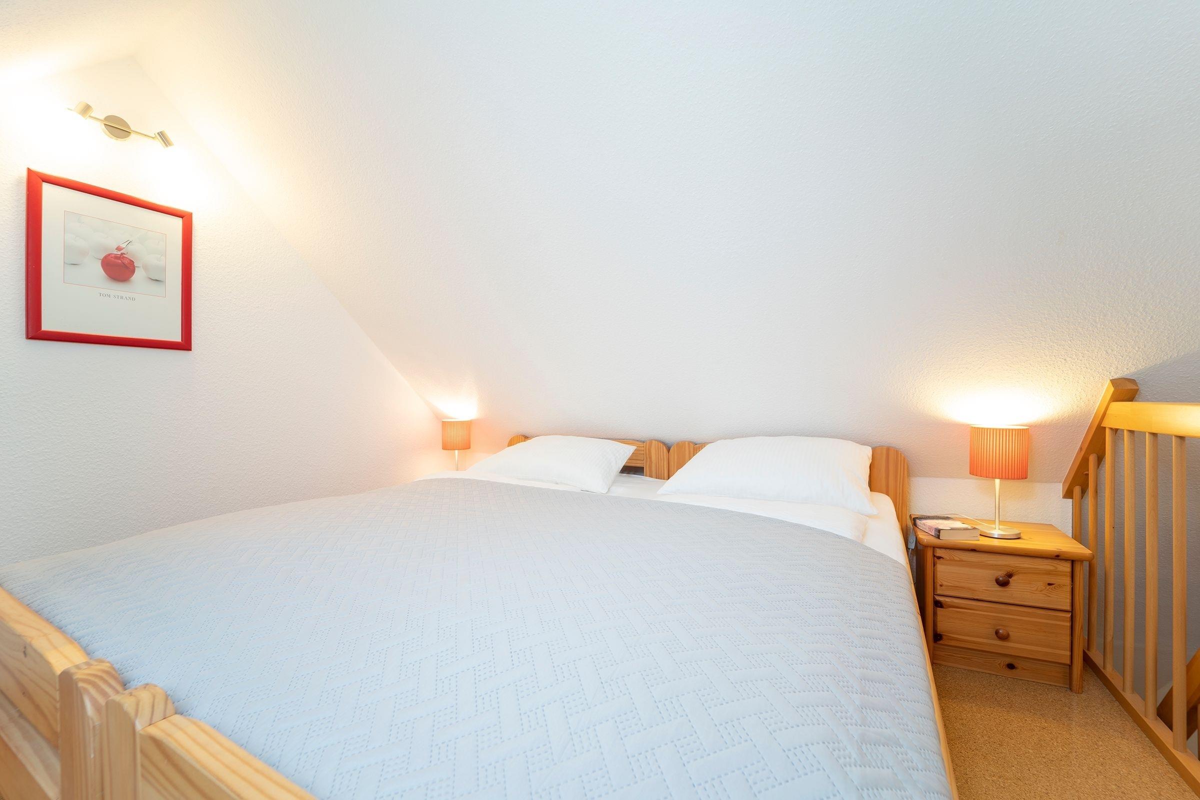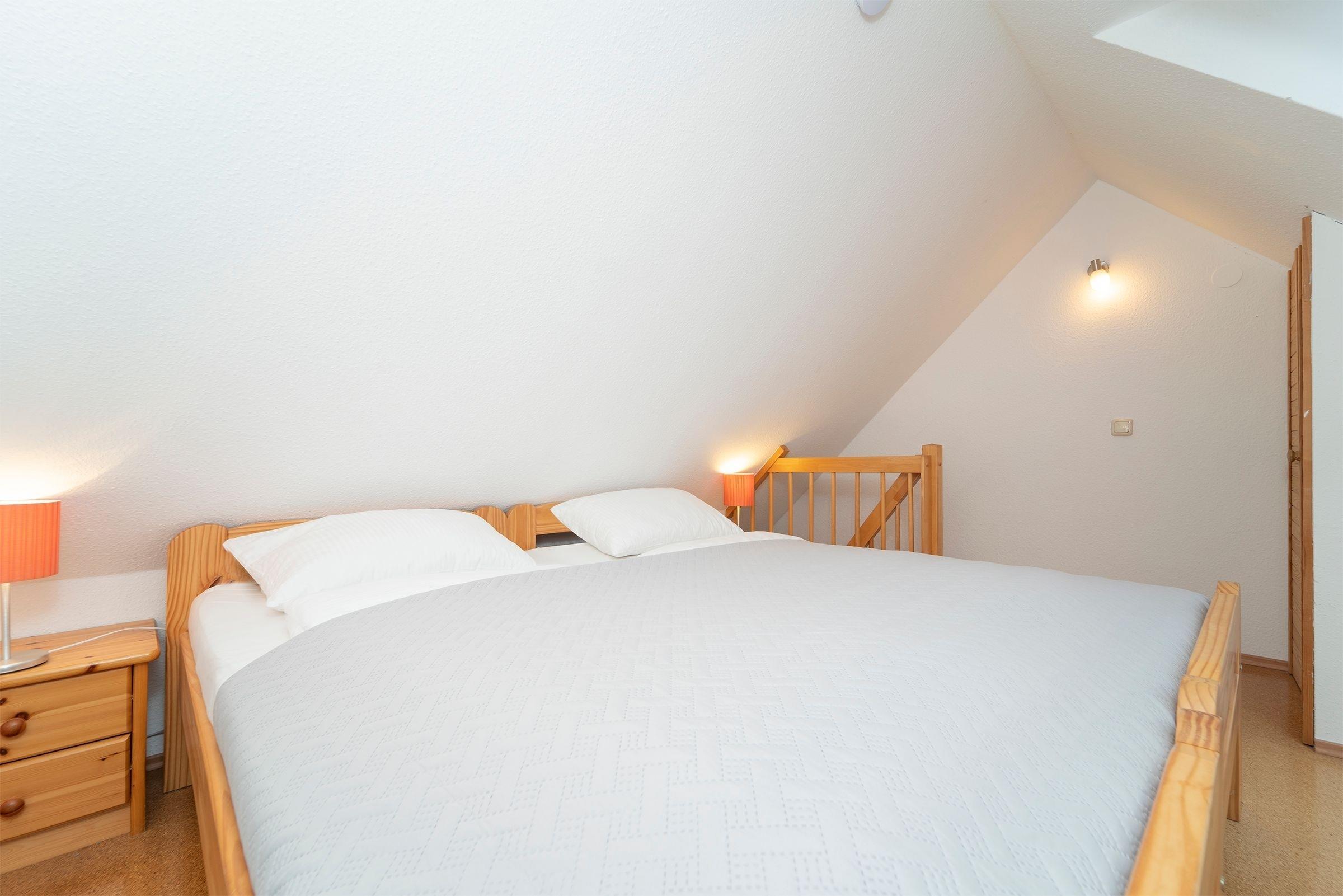 Machen Sie es sich im hell gestalteten Wohnbereich im Dachgeschoss des Hauses so richtig gemütlich und genießen Sie zahlreiche Sonnenstunden auf dem möblierten Balkon. Die offene Küche ist mit allen Annehmlichkeiten wie z.B. Geschirrspüler, Backofen und Mikrowelle ausgestattet und lädt zum Kochen ein. Angrenzend finden Sie einen gemütlichen Essplatz. Ein Schlafzimmer mit 2 Einzelbetten (je 90x200 cm) befindet sich auf dieser Ebene. Das zweite Schlafzimmer mit einem Doppelbett (2x 90x200 cm) erreichen Sie über eine Treppe vom Wohnbereich aus. Im modernen, geräumigen Duschbad starten Sie erfrischt in den neuen Urlaubstag.
