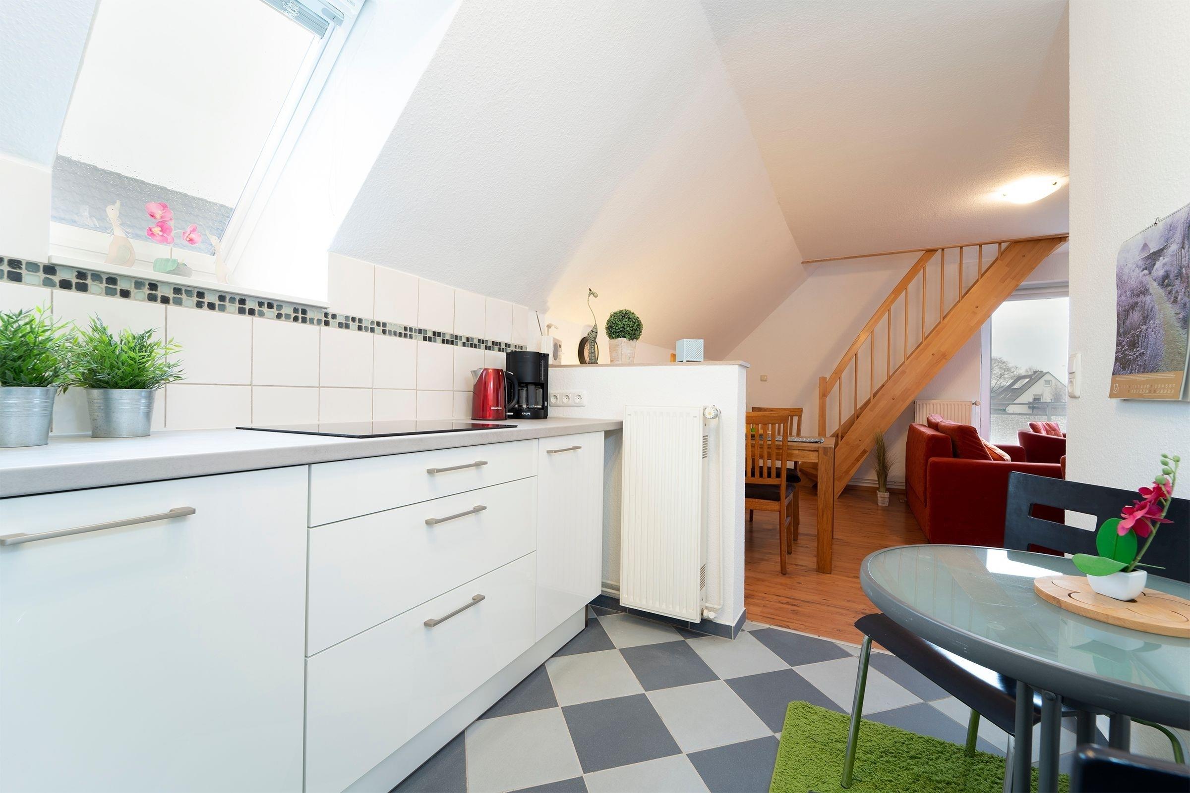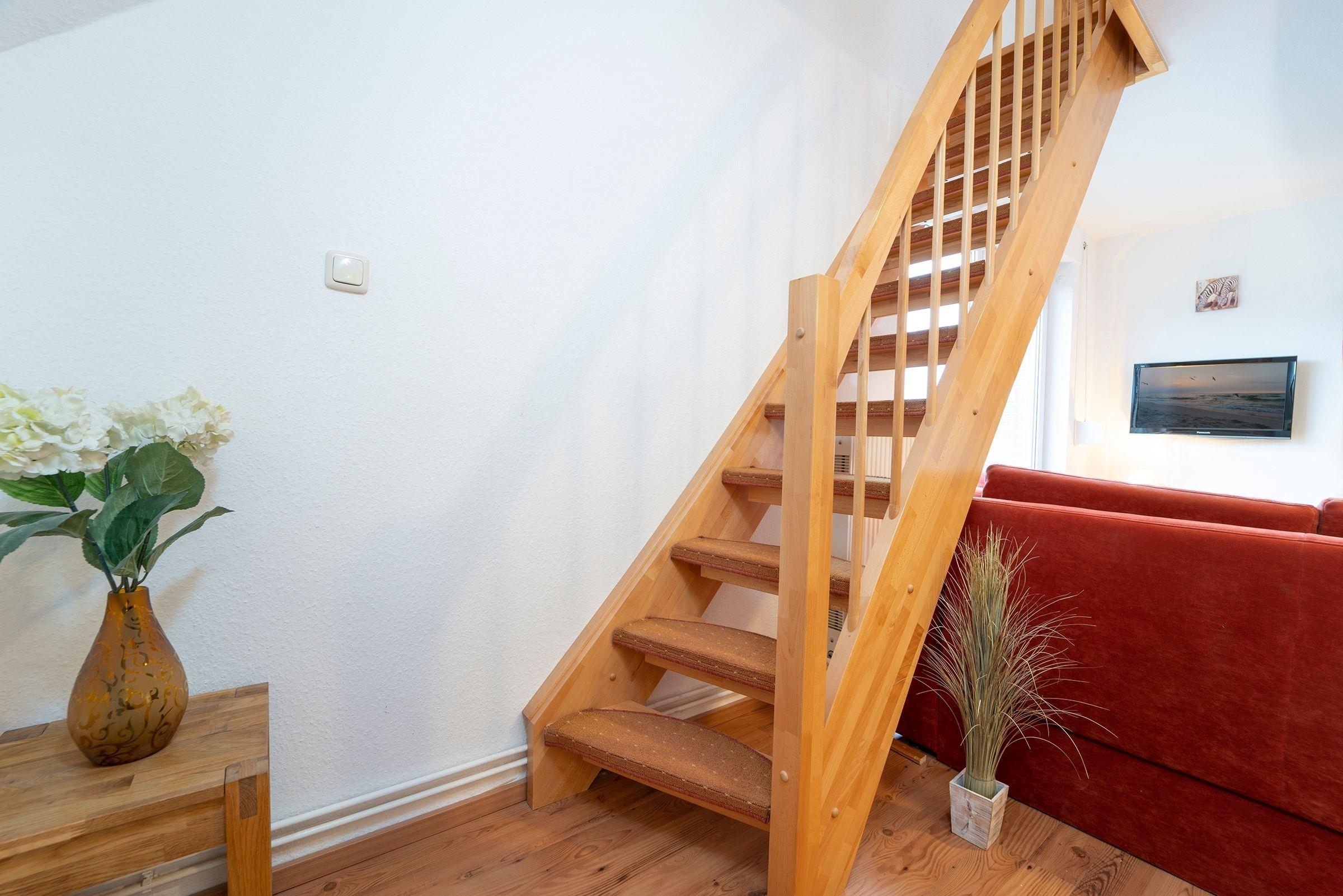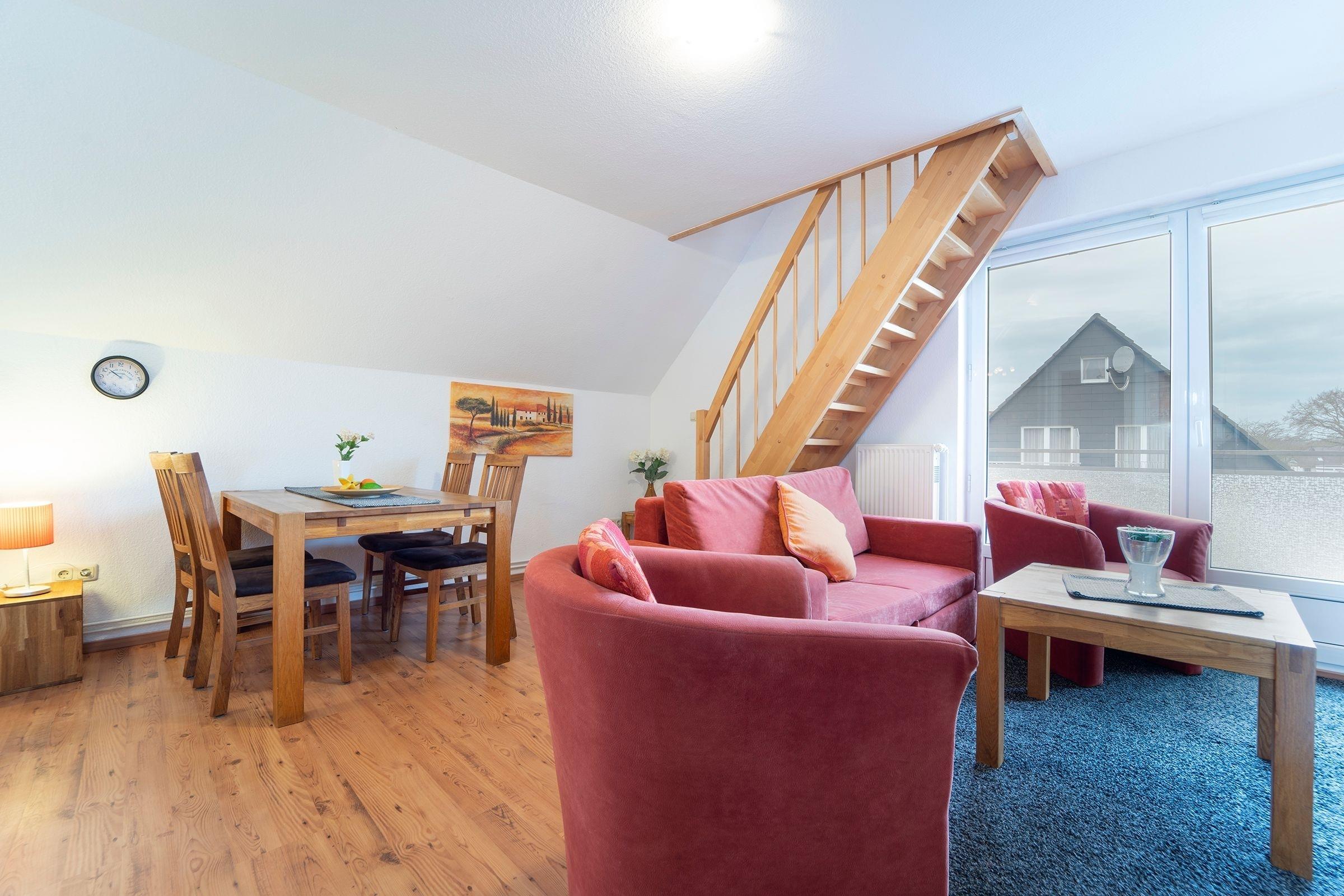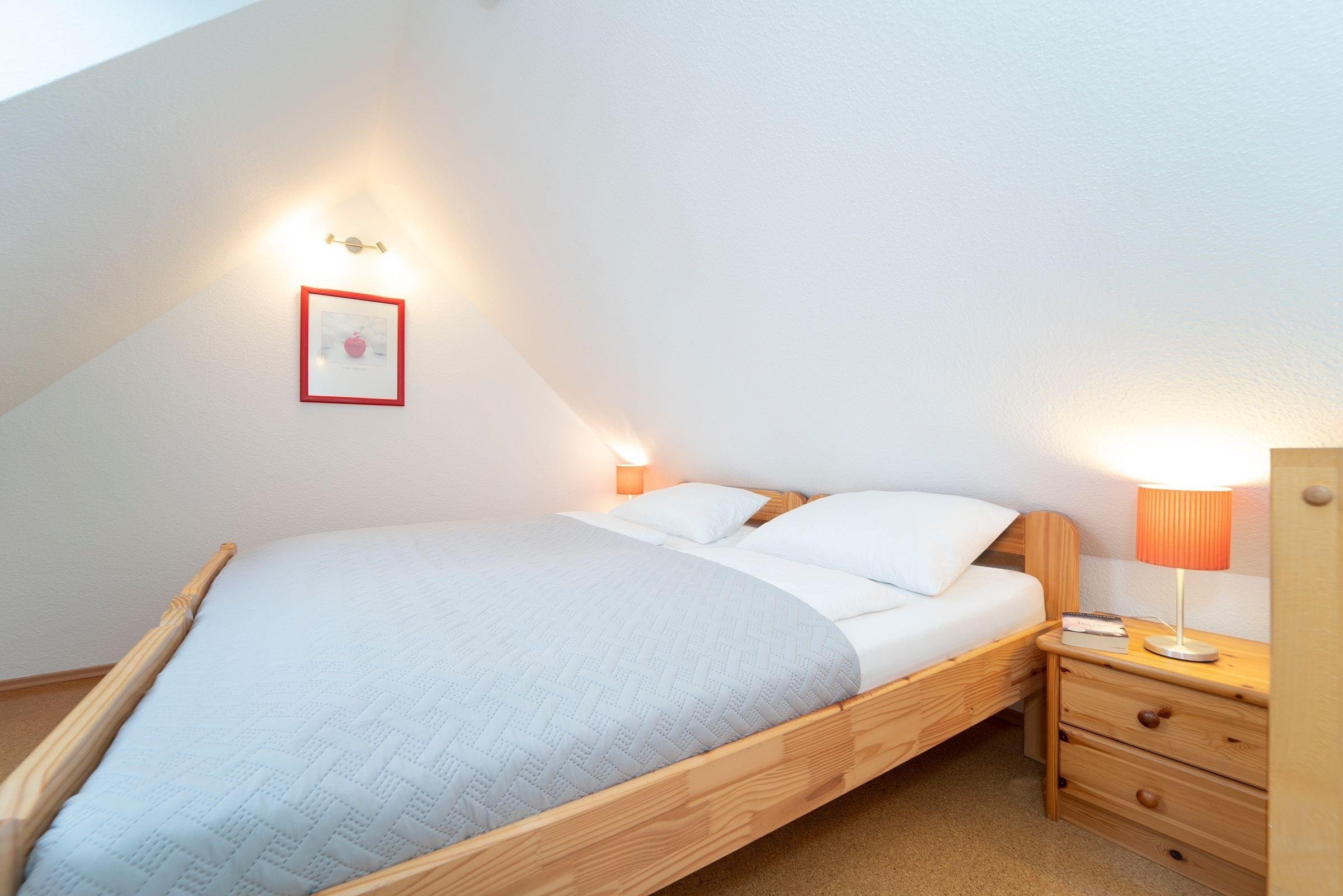 Machen Sie es sich im hell gestalteten Wohnbereich im Dachgeschoss des Hauses so richtig gemütlich und genießen Sie zahlreiche Sonnenstunden auf dem möblierten Balkon. Die offene Küche ist mit allen Annehmlichkeiten wie z.B. Geschirrspüler, Backofen und Mikrowelle ausgestattet und lädt zum Kochen ein. Angrenzend finden Sie einen gemütlichen Essplatz. Ein Schlafzimmer mit 2 Einzelbetten (je 90x200 cm) befindet sich auf dieser Ebene. Das zweite Schlafzimmer mit einem Doppelbett (2x 90x200 cm) erreichen Sie über eine Treppe vom Wohnbereich aus. Im modernen, geräumigen Duschbad starten Sie erfrischt in den neuen Urlaubstag.