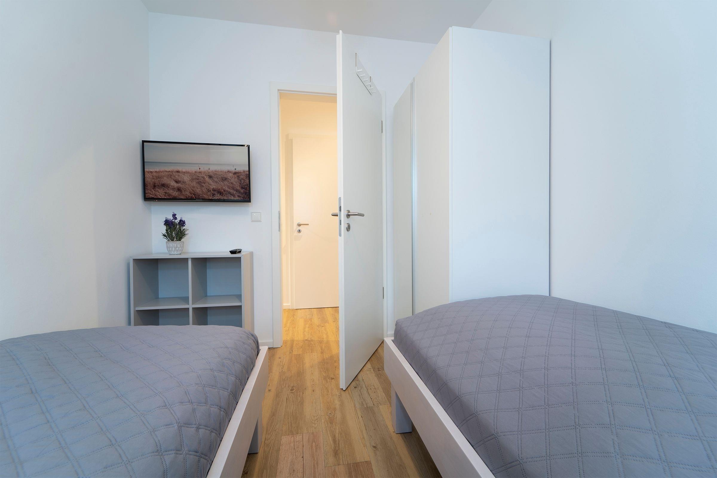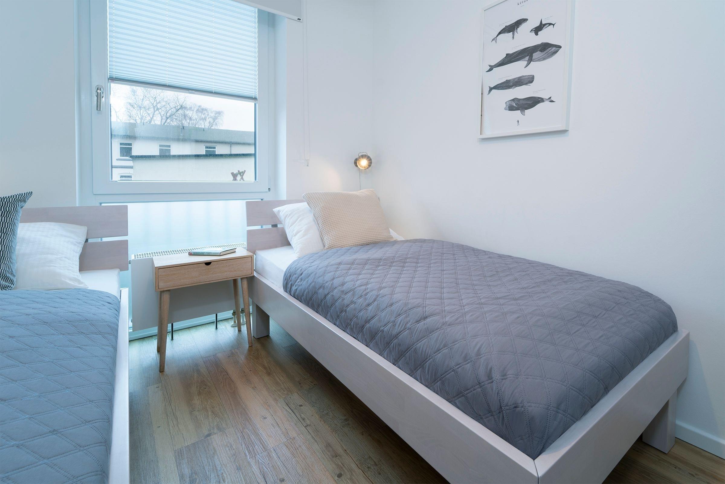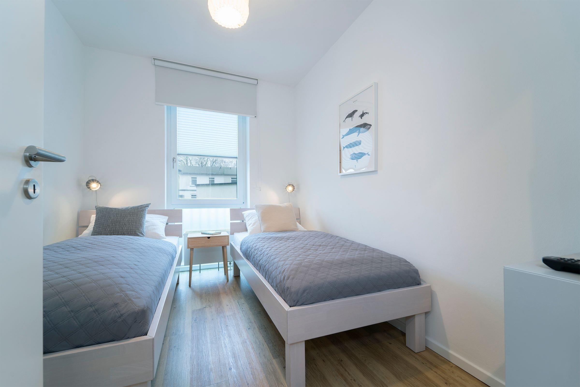 Zurück im Wohnraum erwartet Sie eine offene Küche mit Tresen. Die Ausstattung mit Induktionsherd und Spülmaschine bietet alles, was man zum leidenschaftlichen Kochen braucht. Bei einem Glas Wein kann man hier gemeinsam seine Menüs zaubern und nimmt dann in der angrenzender Essecke Platz. Das fühlt sich wie Urlaub an. Wunderbar zur Ruhe kommen Sie in den beiden separaten Schlafräumen: Ein Schlafzimmer verfügt über ein Doppelbett (180x200 cm) und das zweite Schlafzimmer über 2 Einzelbetten (je 90x200 cm) sowie einem zusätzlichem Smart-TV. Passend zur gesamten Einrichtung der Wohnung lässt auch das Duschbad mit Handtuchwärmer und Fußbodenheizung keine Wünsche offen.