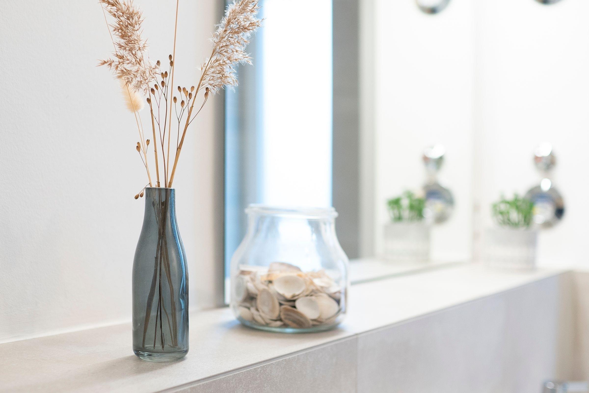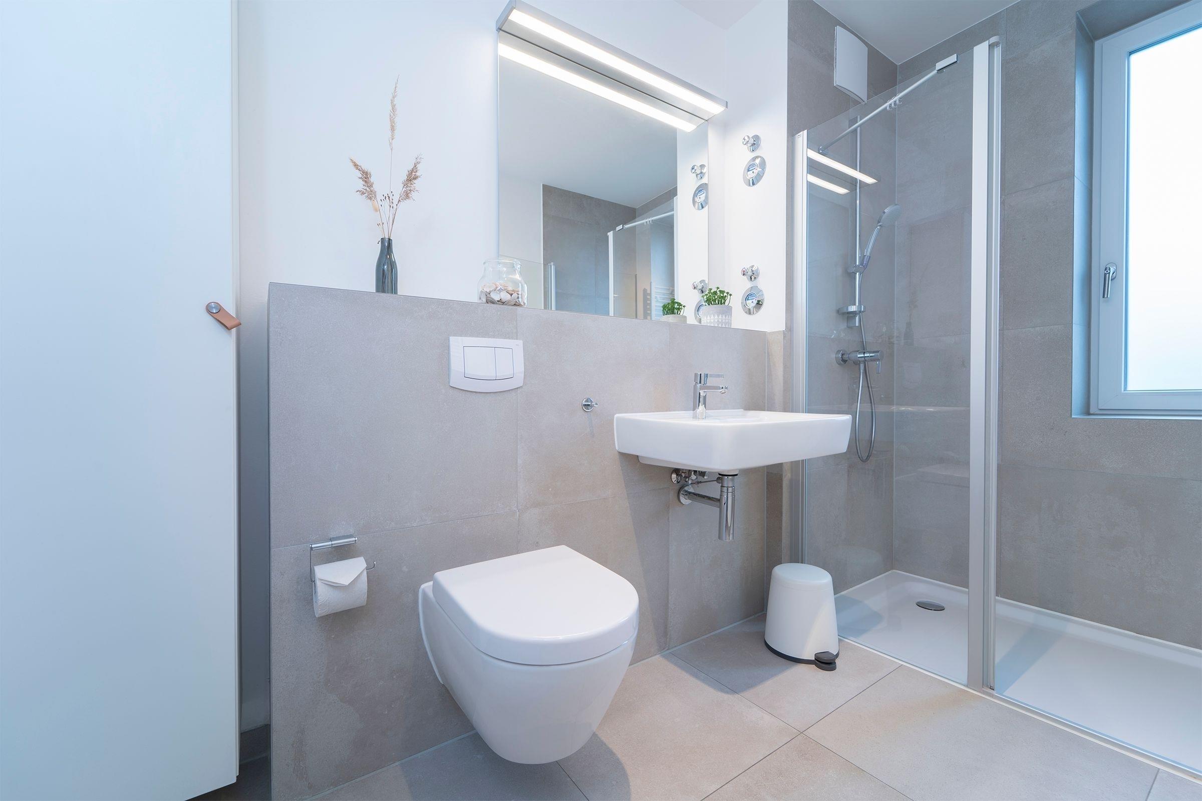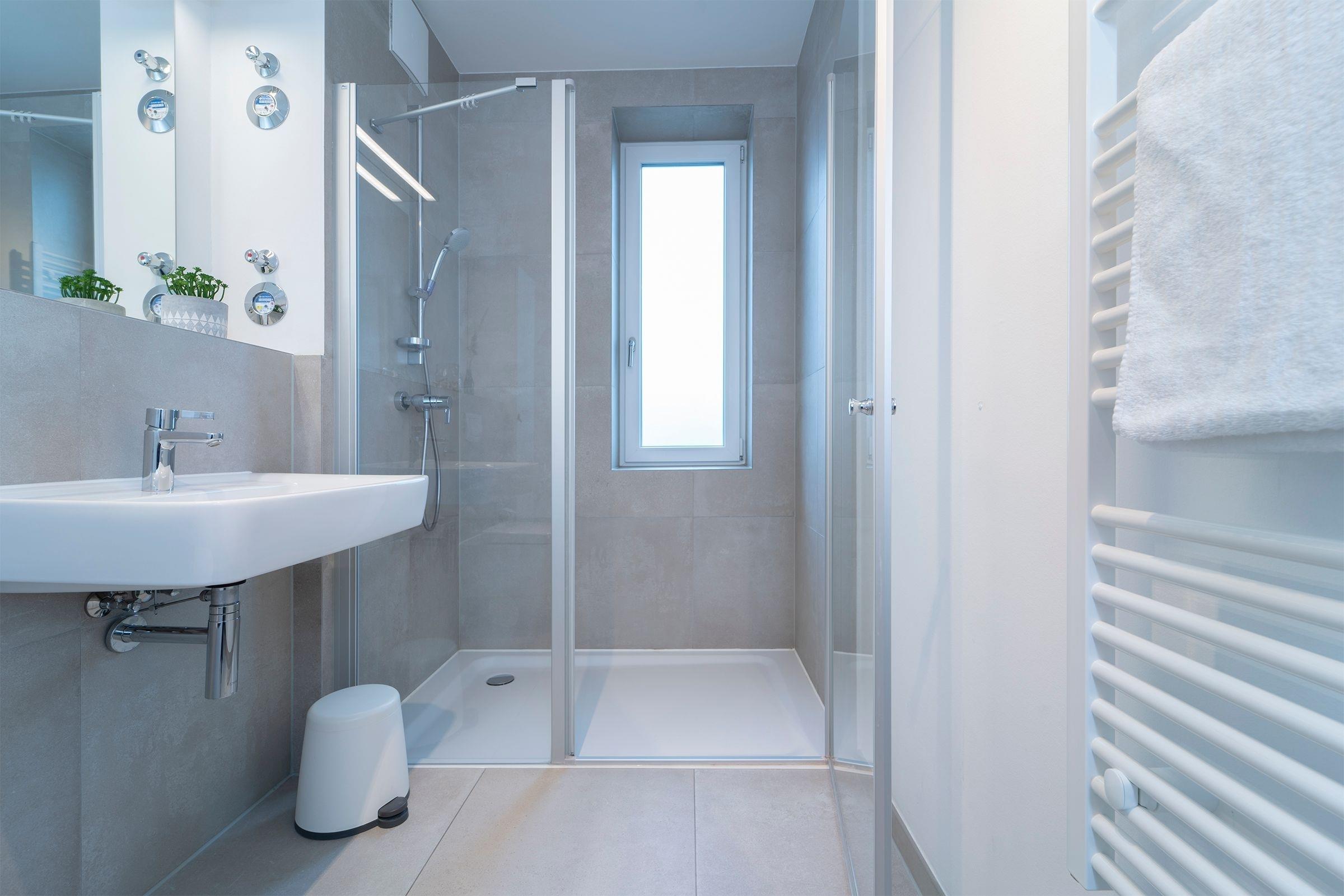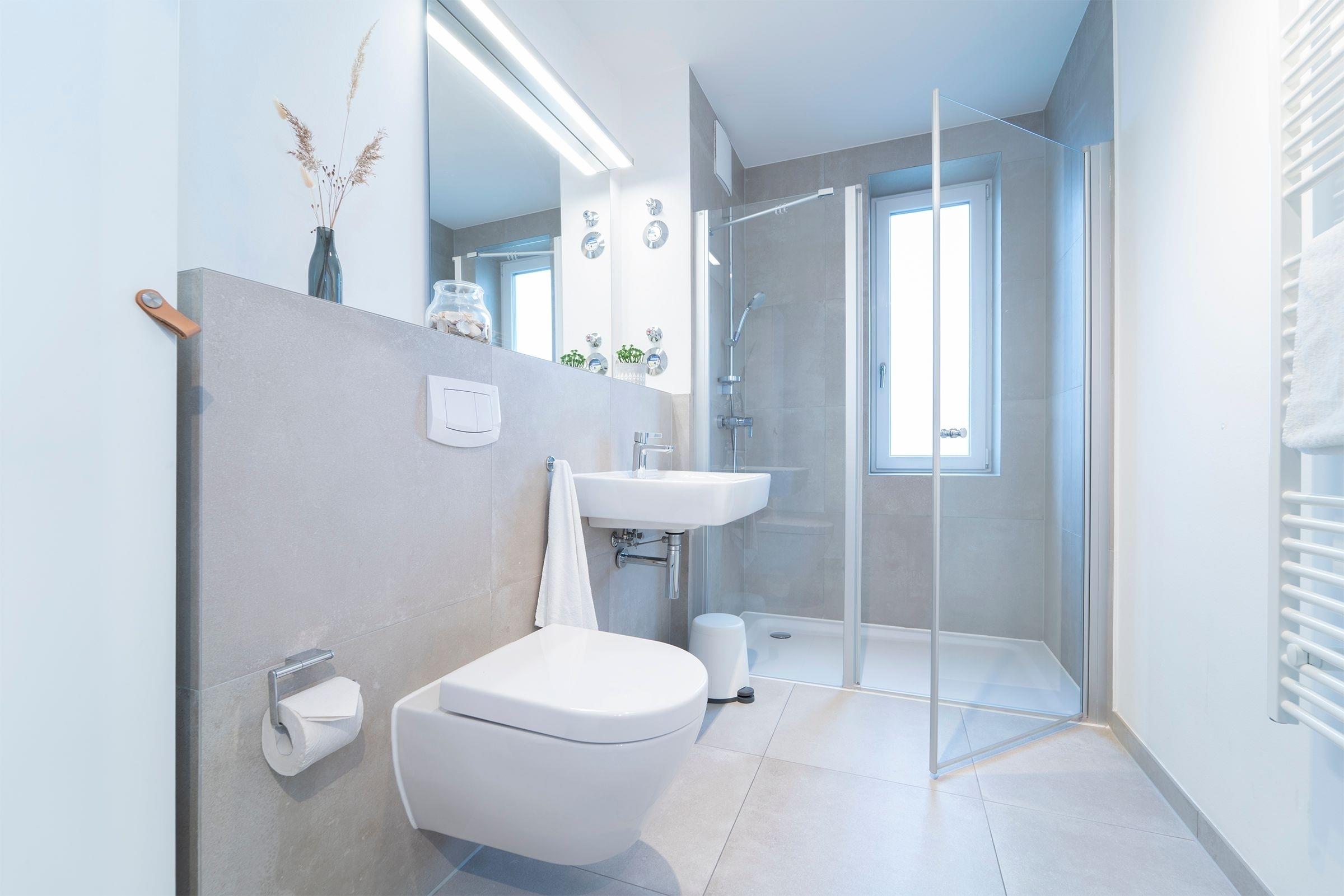 Zurück im Wohnraum erwartet Sie eine offene Küche mit Tresen. Die Ausstattung mit Induktionsherd und Spülmaschine bietet alles, was man zum leidenschaftlichen Kochen braucht. Bei einem Glas Wein kann man hier gemeinsam seine Menüs zaubern und nimmt dann in der angrenzender Essecke Platz. Das fühlt sich wie Urlaub an. Wunderbar zur Ruhe kommen Sie in den beiden separaten Schlafräumen: Ein Schlafzimmer verfügt über ein Doppelbett (180x200 cm) und das zweite Schlafzimmer über 2 Einzelbetten (je 90x200 cm) sowie einem zusätzlichem Smart-TV. Passend zur gesamten Einrichtung der Wohnung lässt auch das Duschbad mit Handtuchwärmer und Fußbodenheizung keine Wünsche offen.