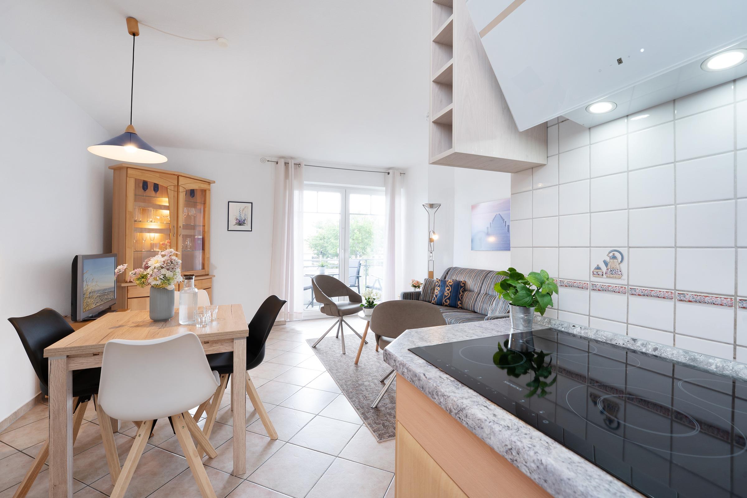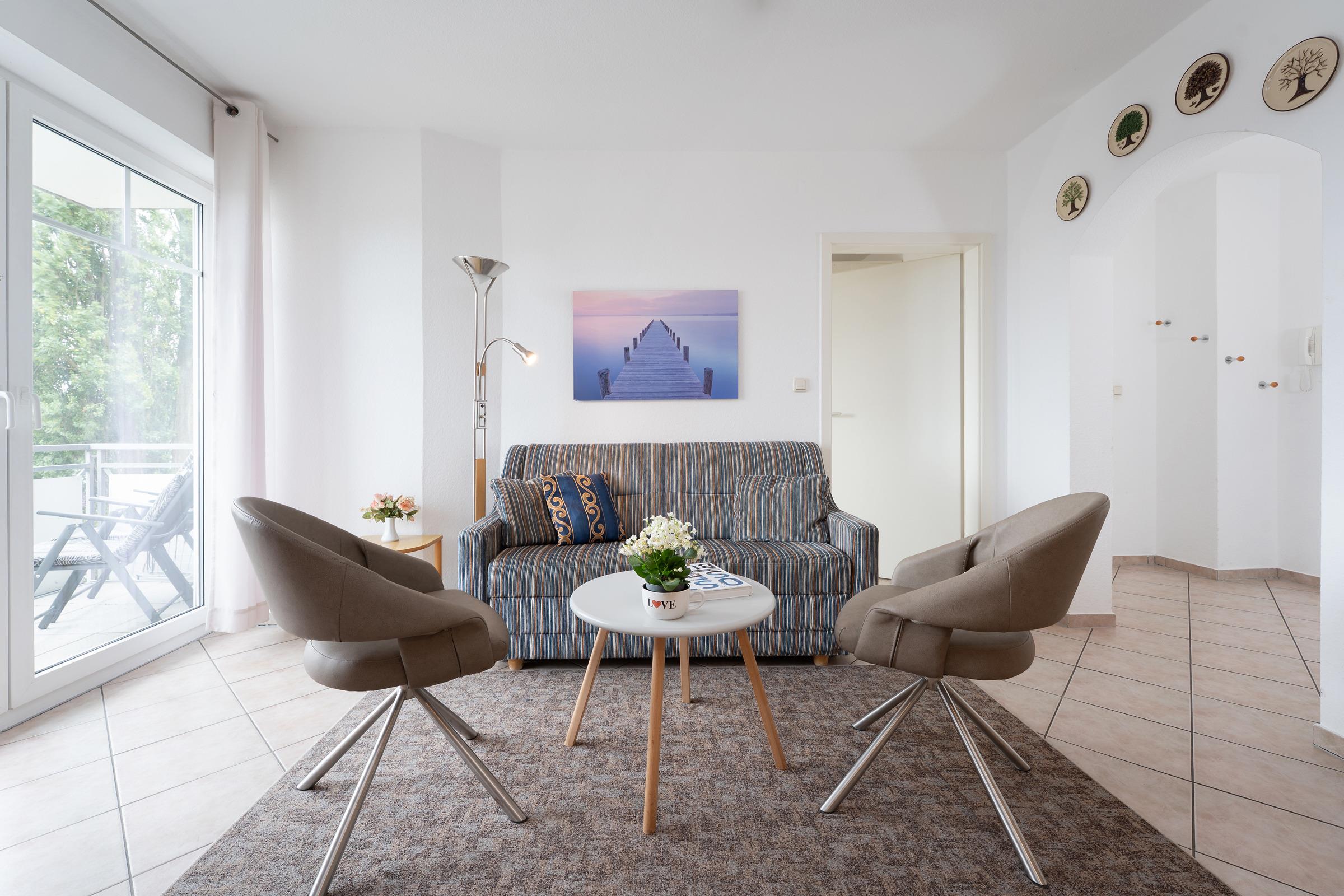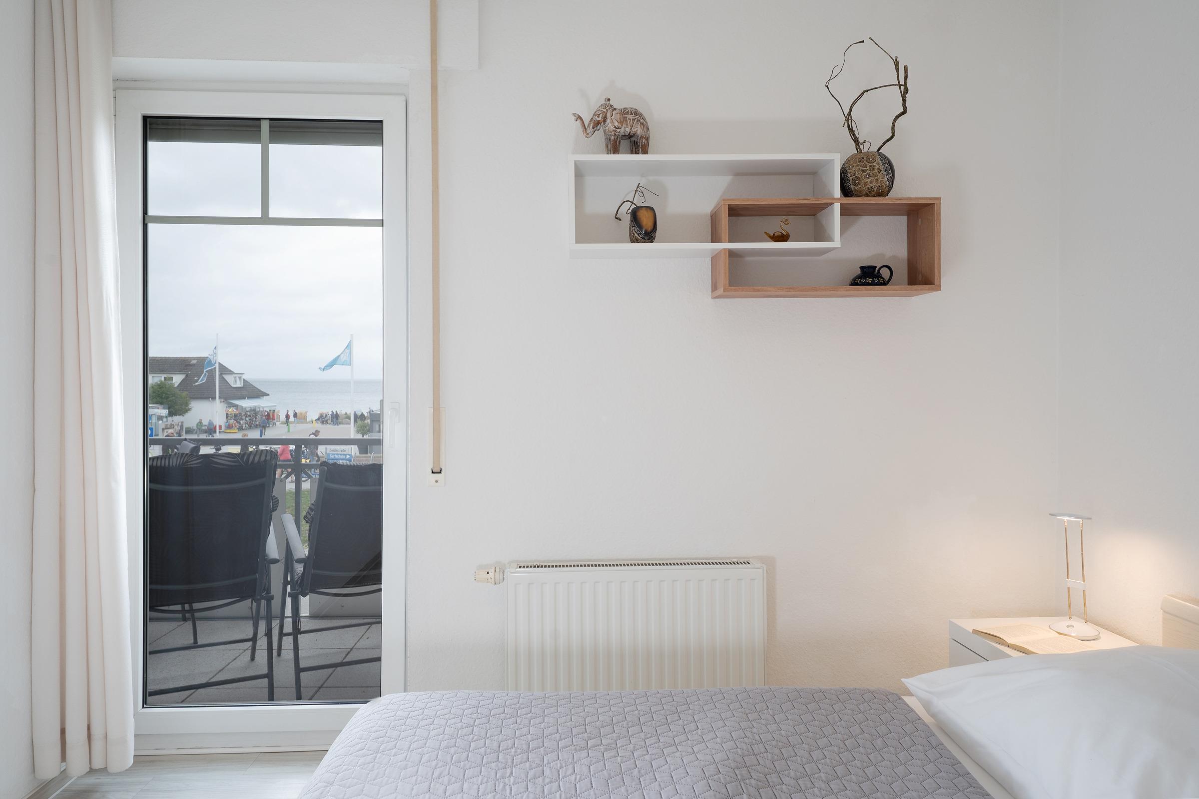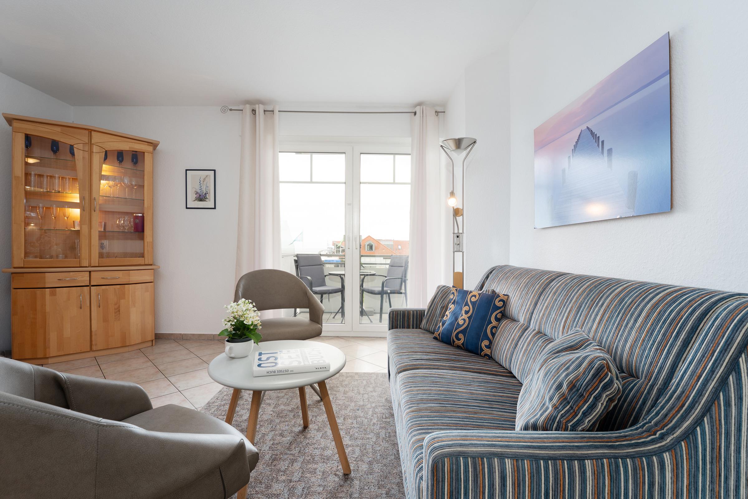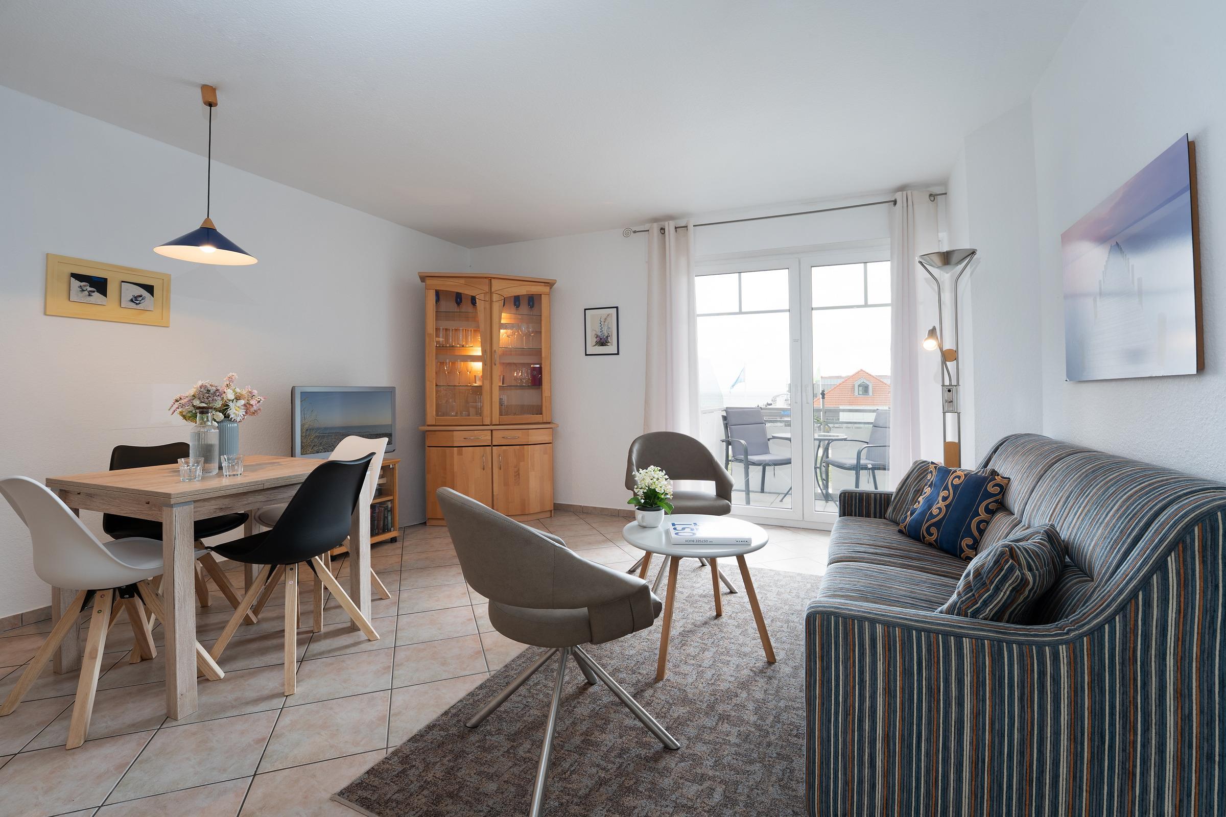 Hier erwarten Sie die besten Aussichten – vom Balkon haben Sie einen tollen Blick auf die Seebrücke und die Ostsee. Was will man mehr? Kommen Sie herein in den liebevoll eingerichteten Wohn-/Ess-Bereich. Das Sofa und die beiden Sessel versprechen gemütliche Stunden vor dem TV-Gerät. Noch besser "fernsehen" können Sie natürlich vom Balkon aus – schauen Sie in die Ferne und entdecken Sie, was die Ostsee und die Umgebung so zu bieten hat. Bei dem Sofa handelt es sich um eine Doppelbettcouch, die sich mit wenigen Handgriffen in einen gemütlichen Schlafplatz (140x200 cm) umfunktionieren lässt. Im Wohn-/Ess-Bereich präsentiert sich auch die offene, moderne Küche mit Kochfeld und guter Ausstattung. Gleich nebenan können Sie Ihre Lieblings-Menüs in der stylischen Ess-Ecke genießen. Für die Nacht steht Ihnen ein Doppelbett (2x 90x200 cm) im separaten Schlafzimmer zur Verfügung. Das Besondere: Auch von hier aus haben Sie Zutritt auf den Balkon. Das Duschbad ist hell gefliest und lässt Sie gut in den Tag starten.