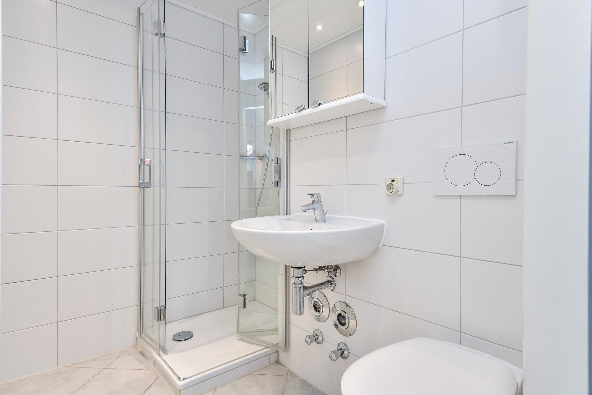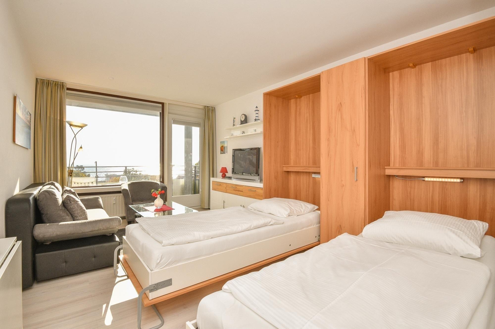 Mehr Meer geht kaum. Diese traumhafte Wohnung im Haus Meeresblick verwöhnt Sie mit Strandnähe und tollem Ostseeblick. Kommen Sie rein, Ihr Urlaub kann beginnen. Der gemütliche Wohn-/Schlafbereich präsentiert sich mit einer kuscheligen Couchgarnitur mit TV-Gerät vor der großen Fensterfront, einem gemütlichen Essplatz sowie mit 2 getrennt ausklappbaren Betten (je 90x200 cm). Die gute Ostseeluft mit tollem Blick können Sie wunderbar auf dem möblierten Balkon genießen. Die moderne, offene Küche verfügt über eine gute Grundausstattung. Und das innenliegende Duschbad lässt Sie erfrischt in den neuen Tag starten.