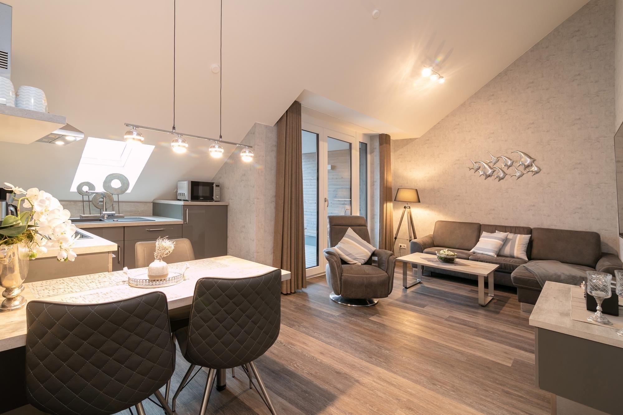 Hereinspaziert – die schicke Wohnung Esprit heißt Sie herzlich Willkommen. Die exklusive Einrichtung und die gemütlichen Dachschrägen verleihen dem Objekt eine ganz besondere Atmosphäre. Nehmen Sie sich eine Auszeit auf dem bequemen Sofa, das bei Bedarf auch als Schlafsofa (ca. 160x200 cm) genutzt werden kann. Oder genießen Sie auf der großzügigen, halb überdachten Balkon-Logia die Ostseeluft. Gemütlich eingekuschelt lässt es sich hier auch mal bei nicht so gutem Wetter prima aushalten. Das wird bestimmt Ihr neuer Lieblingsplatz. Zurück im Wohn-/Essbereich wartet eine gut ausgestattete Küchenzeile mit Induktionsherd und Geschirrspüler auf Sie. Zaubern Sie hier gemeinsam Ihre Urlaubs-Menüs und sitzen Sie anschließen bei einem Glas Wein am schicken Esstisch. Nach einem tollen Urlaubstag finden Sie die richtige Erholung in dem Boxspringbett (180x200 cm) im Schlafzimmer, wo auch ein weiteres TV-Gerät bereit steht. Das moderne Duschbad verfügt über eine Sauna, die auch an kalten Tagen Wärme und Entspannung verspricht. Ein bequemes Plus ist der Personenaufzug im Hause.