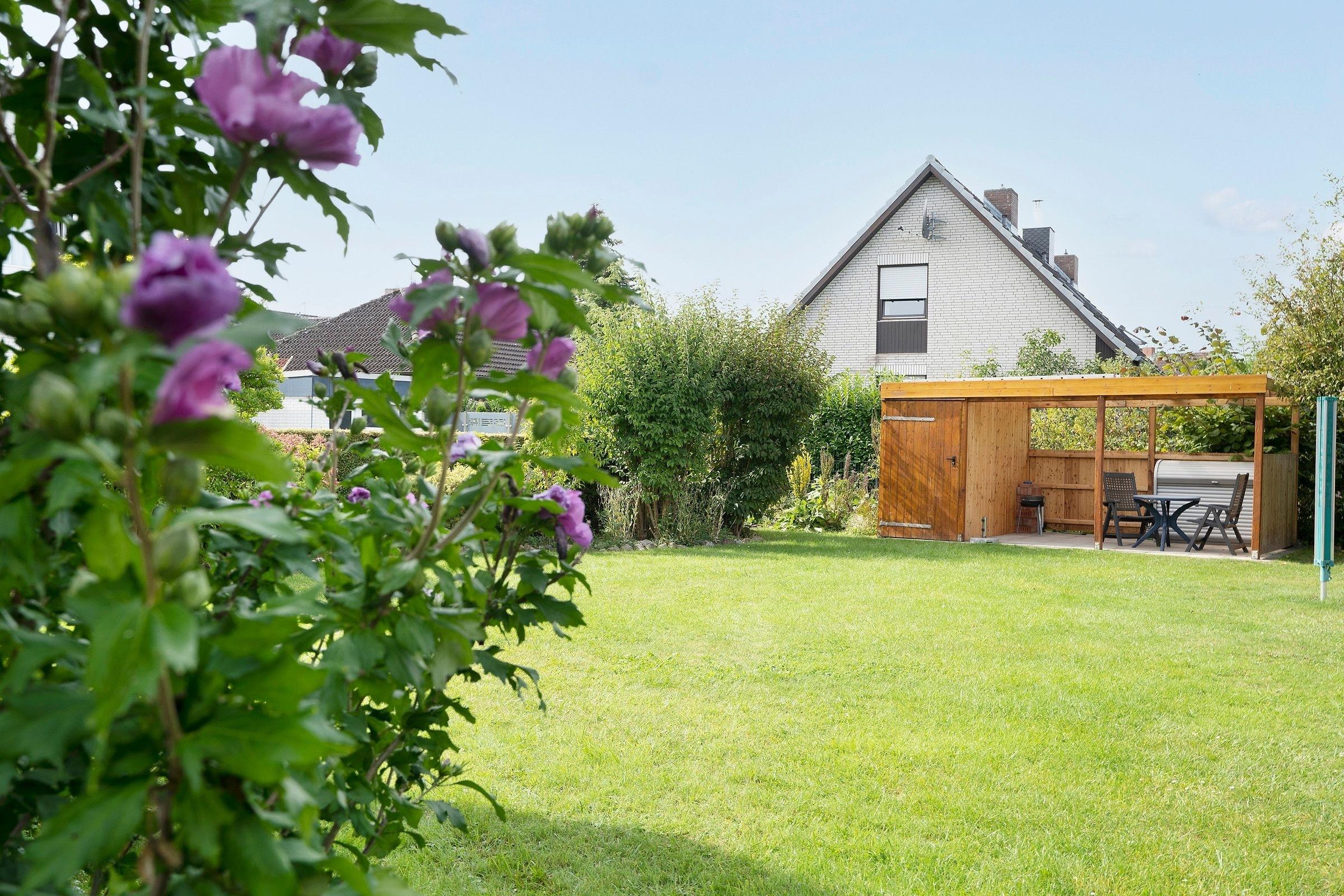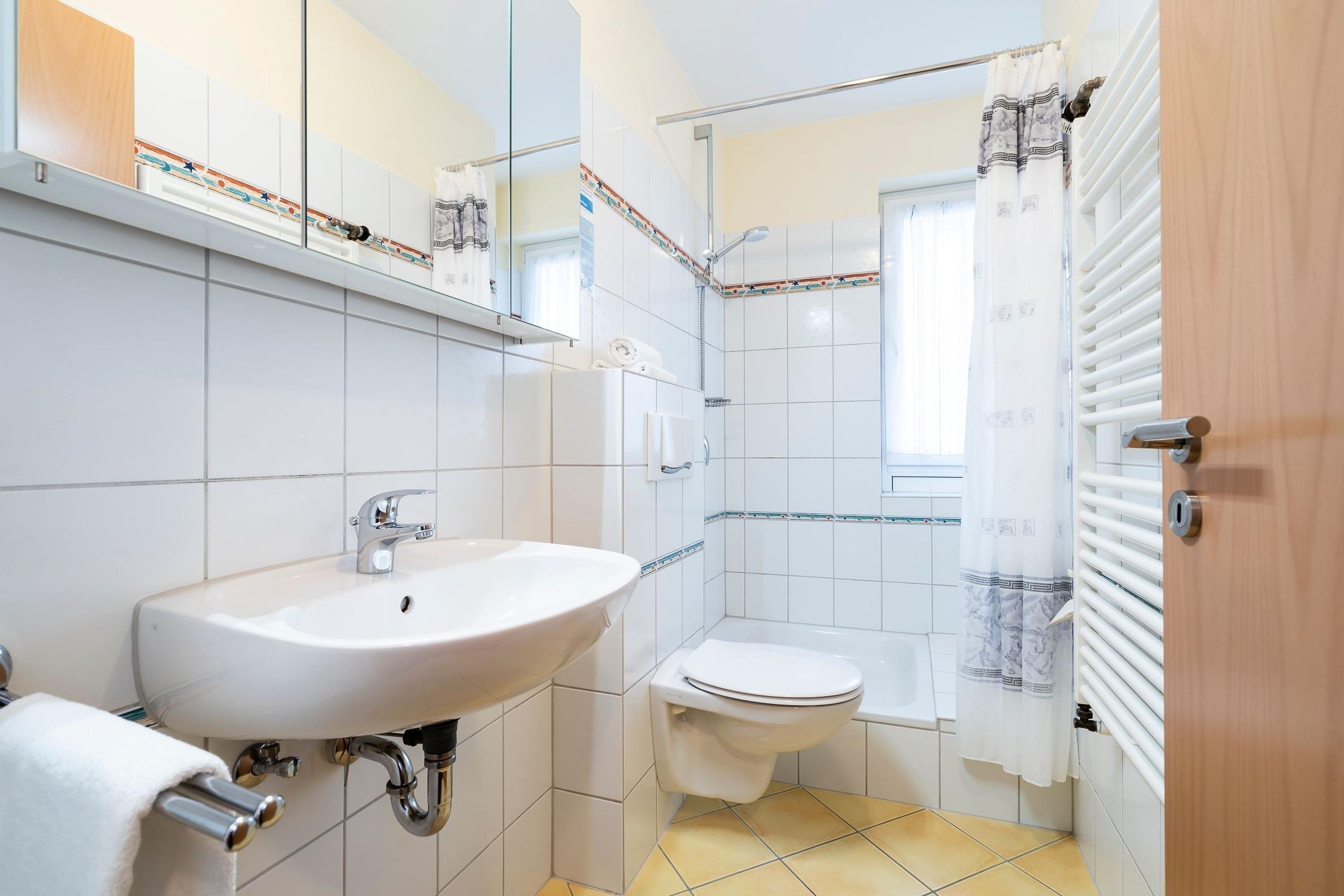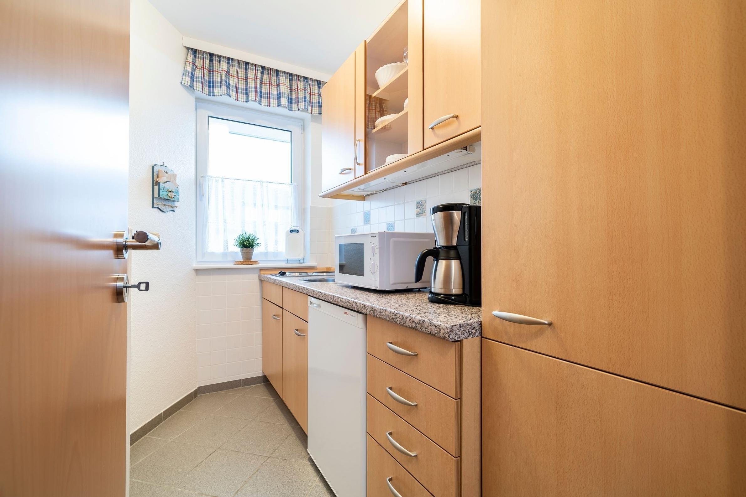 Im gemütlichen Wohn- und Essbereich können Sie entspannt die Füße hochlegen oder den Urlaubstag bei einem leckeren Essen Revue passieren lassen. Dank Flachbild-TV müssen Sie auch im Urlaub auf Ihre Lieblingsserie nicht verzichten. Für den dritten Urlaubsgast lässt sich das Sofa in eine kuschelige Schlafstätte verwandeln (ca. 150x200 cm). An lauschigen Abenden können Sie bei einem guten Glas Wein auf der möblierten Terrasse sitzen. Diese ist natürlich mit Gartenmöbeln und Sonnenschirm ausgestattet. Im Gemeinschaftsgarten steht allen Gästen des Hauses darüber hinaus ein Kohlegrill zur Verfügung. Über den kostenlosen WLAN-Anschluss bleiben Sie auch im Urlaub erreichbar und können Ihre Lieben daheim mit Urlaubsfotos versorgen. Die helle Küche eignet sich perfekt, um Restaurantbesuche und Selbstverpflegung im Urlaub zu kombinieren. Kleine Gerichte und Snacks lassen sich hier problemlos zubereiten. Im separaten Schlafzimmer mit Kleiderschrank wartet ein komfortables Doppelbett auf Sie (2x 90x190 cm). Im Tageslichtbad mit Dusche und Spiegelschrank starten Sie erfrischt in den Tag.