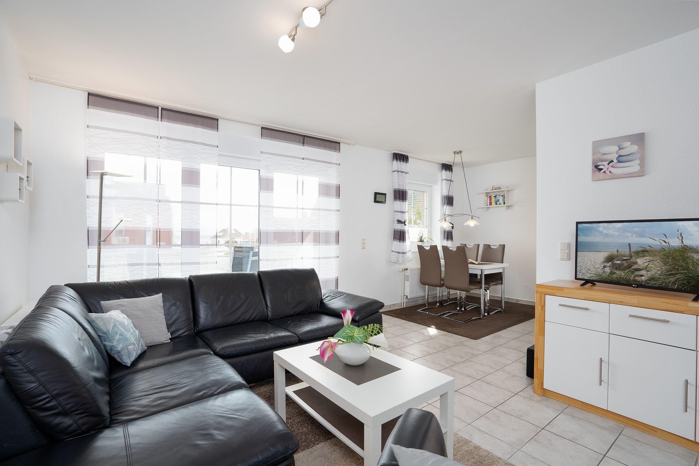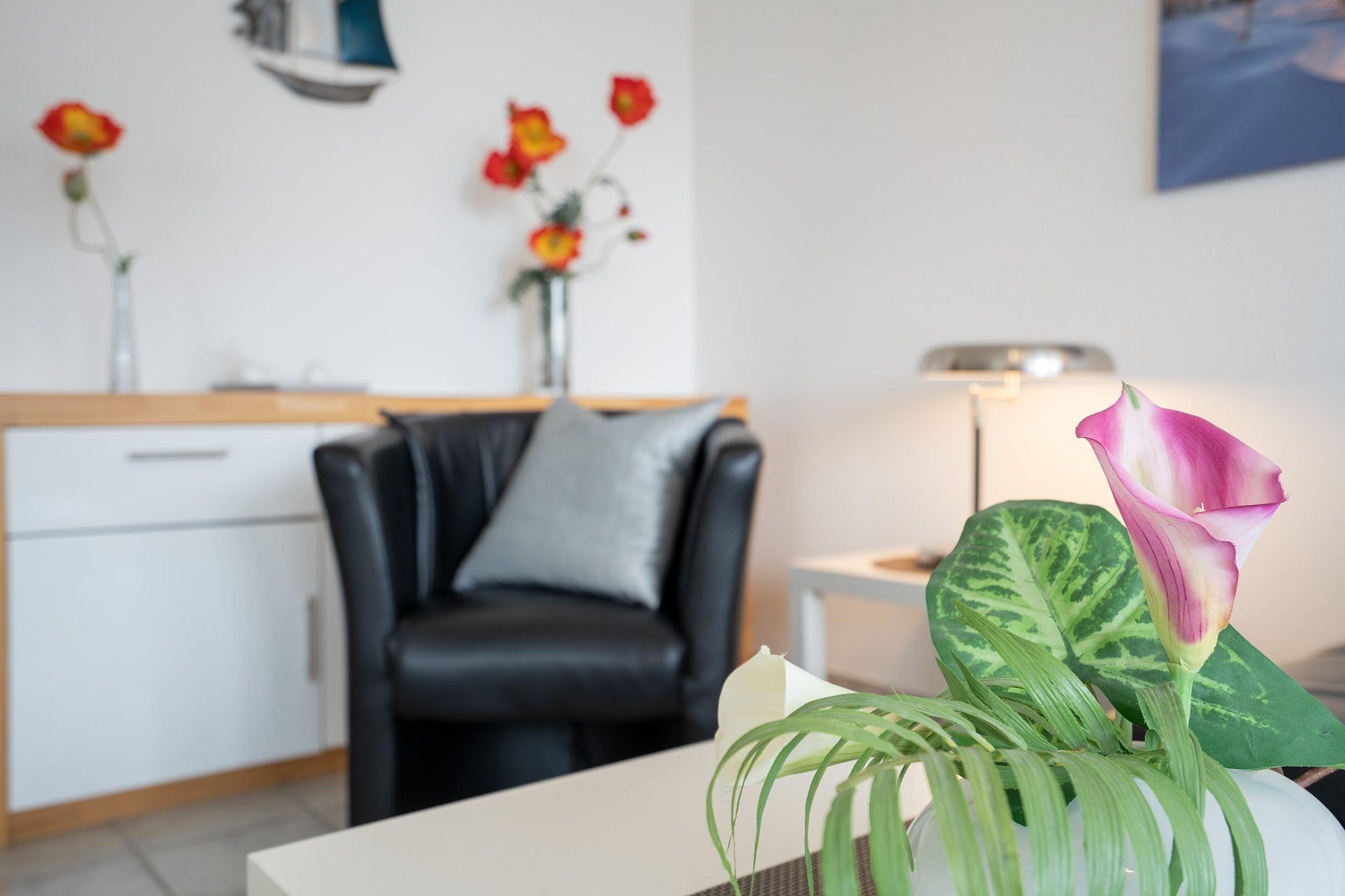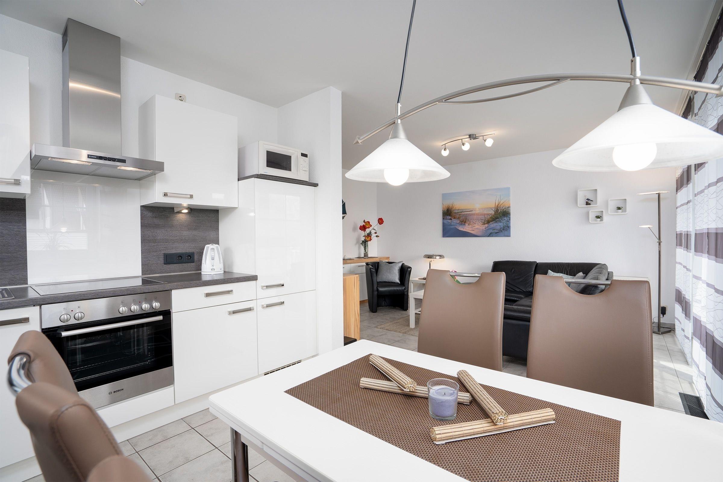 Der offene Wohnbereich empfängt Sie mit gemütlicher Sitzecke, Flat-TV, Essbereich und gut ausgestatteter Küche, hier ist alles harmonisch aufeinander abgestimmt! Vom Wohnbereich aus geht es direkt nach draußen - von Ihrem überdachten Balkon mit Südost-Ausrichtung haben Sie einen wunderschönen Blick auf die Ostsee. Zwei Schlafzimmer