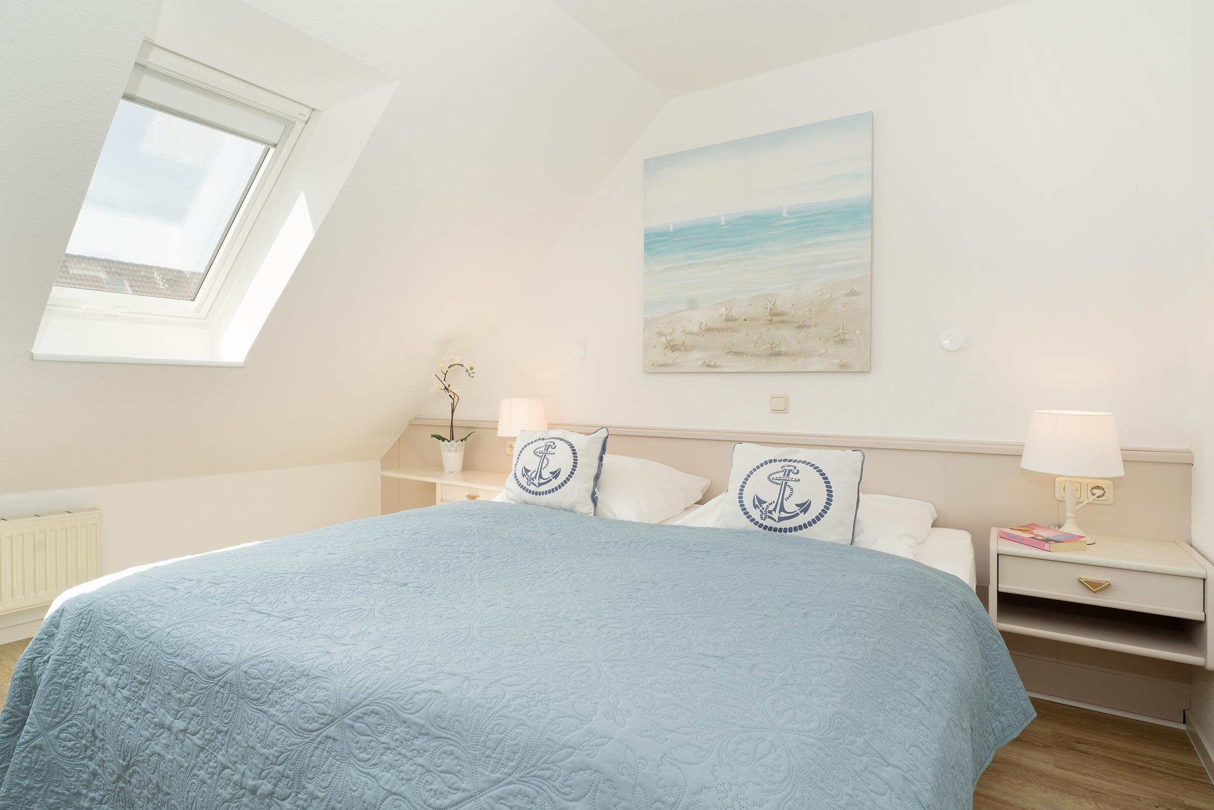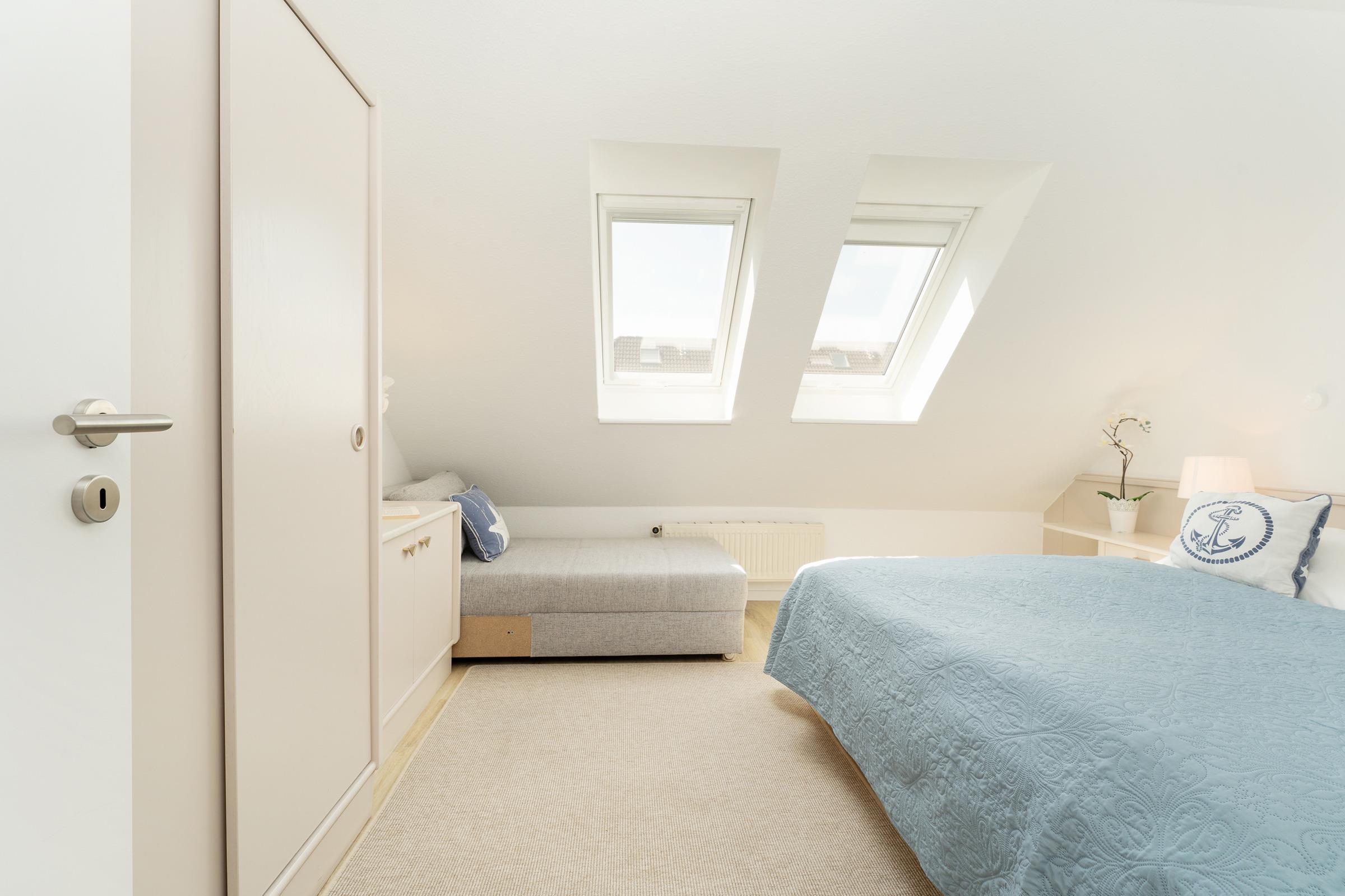 Schlafzimmer 1 (OG): 1 Doppelbett (180 x 200 cm), Kleiderschrank, kleines Sofa für Kleinkind (ohne Rausfallschutz), Platz für Babybett, Verdunkelung: Jalousie und Rollos