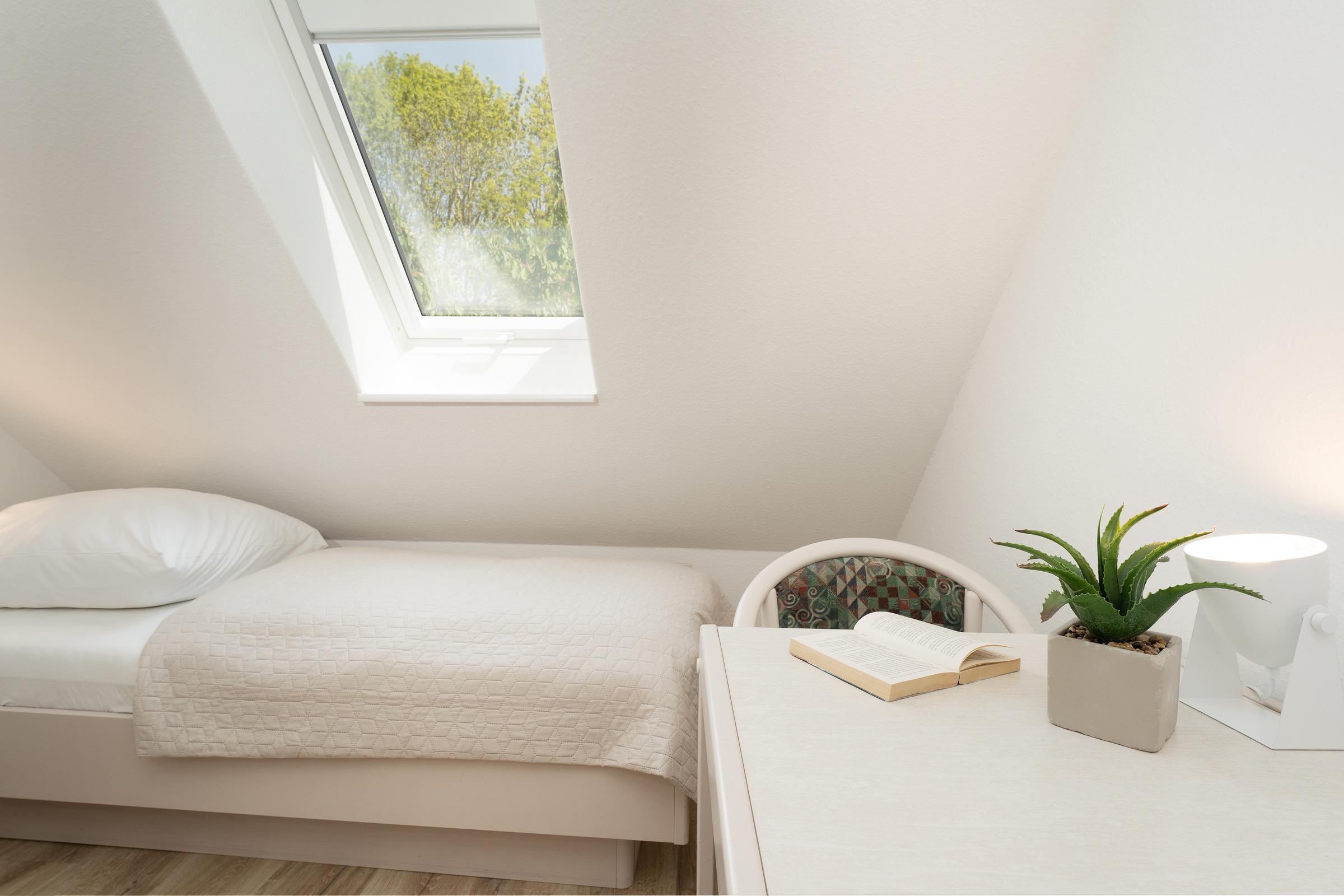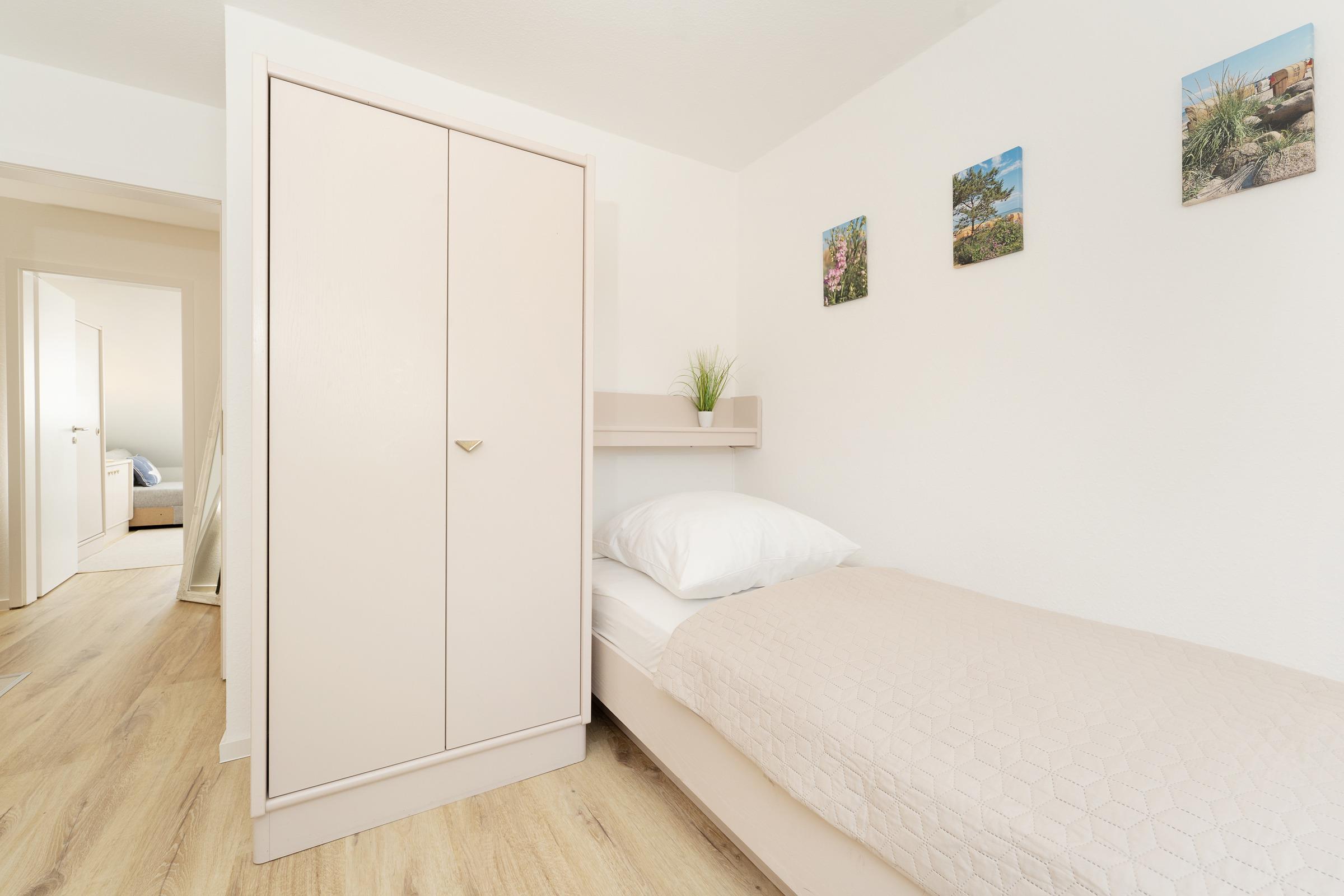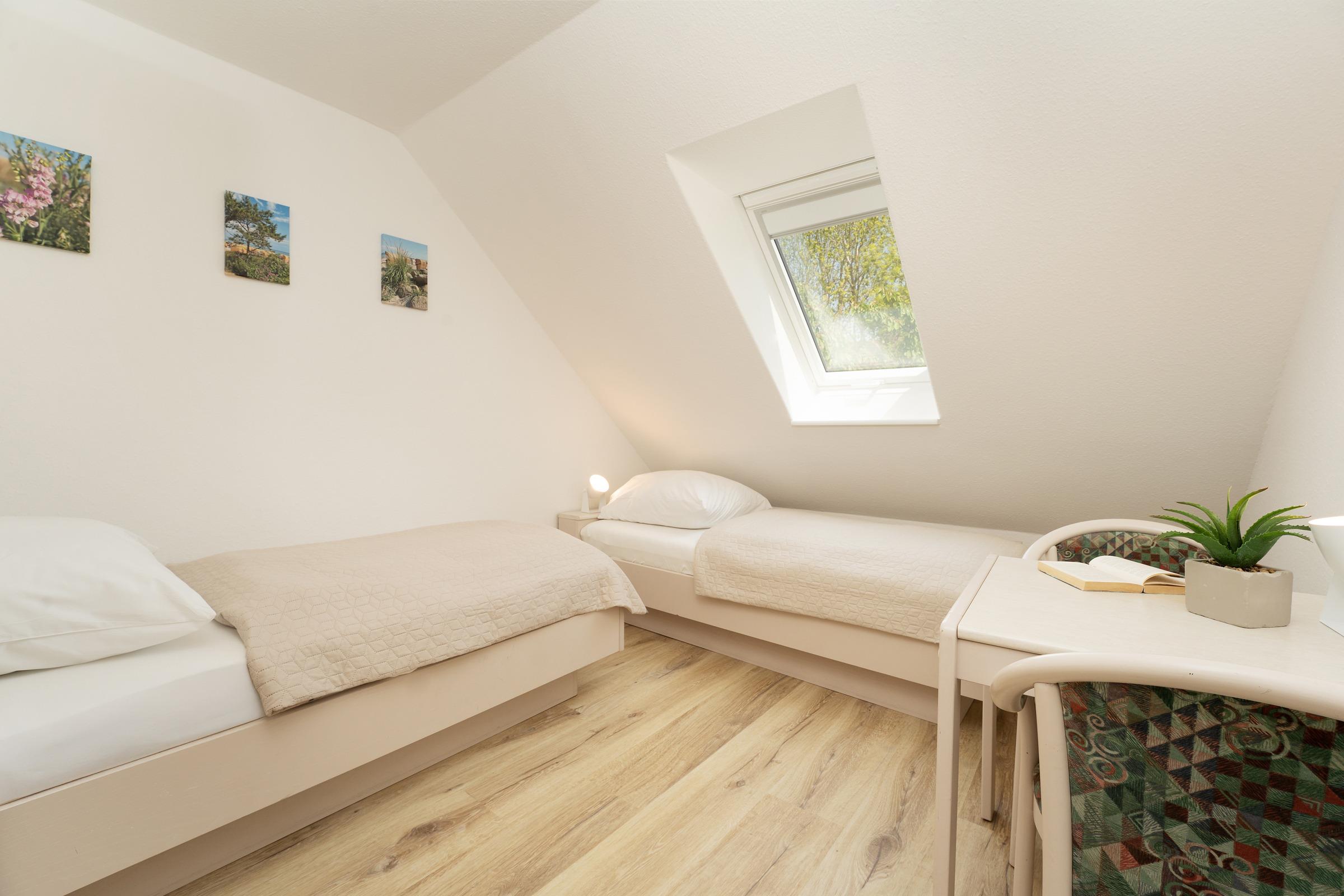 Schlafzimmer 2 (OG): 2 Einzelbetten (2x 990x200 cm), Kleiderschrank, kein Platz für Babybett, Verdunkelung: Jalousie und Rollos