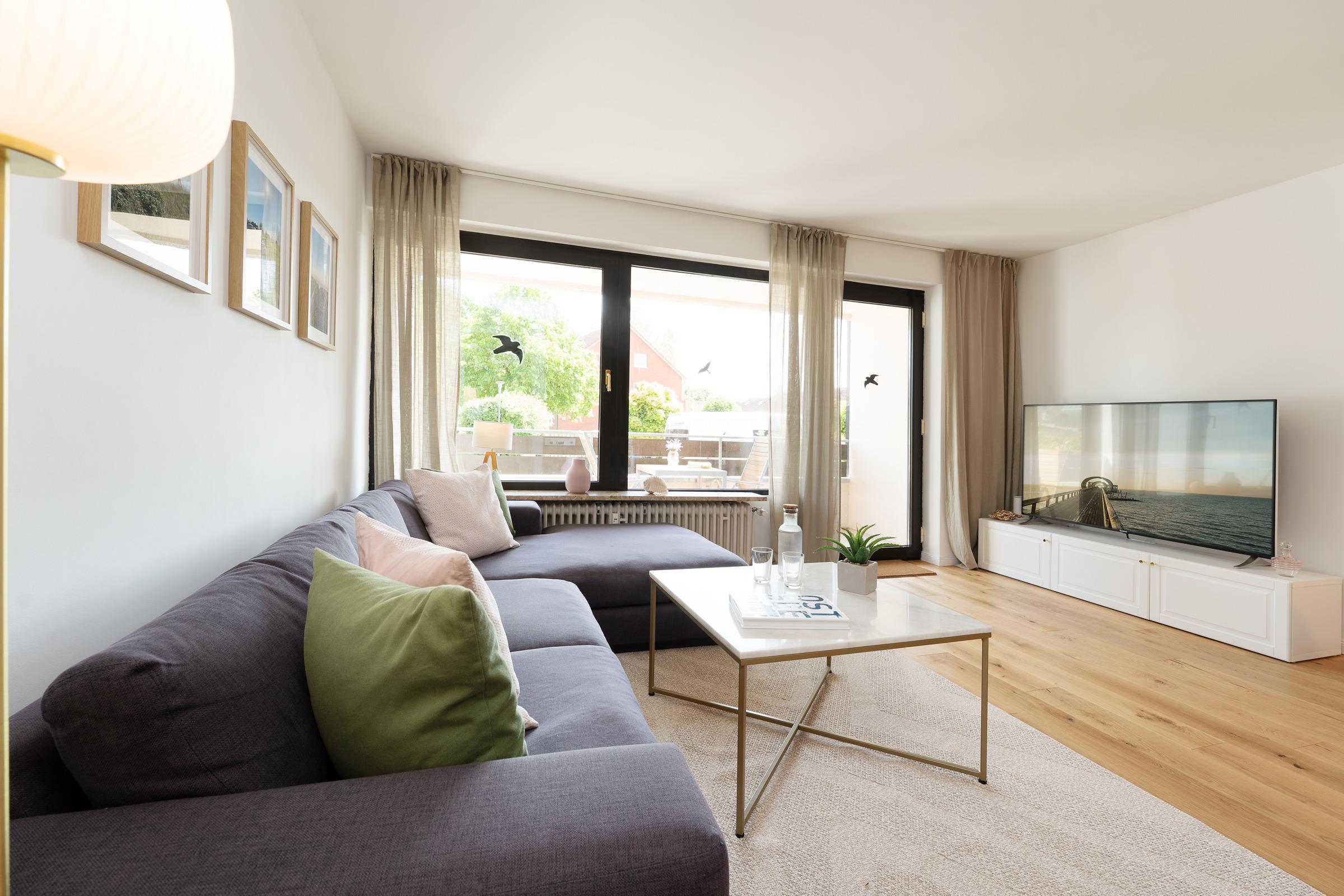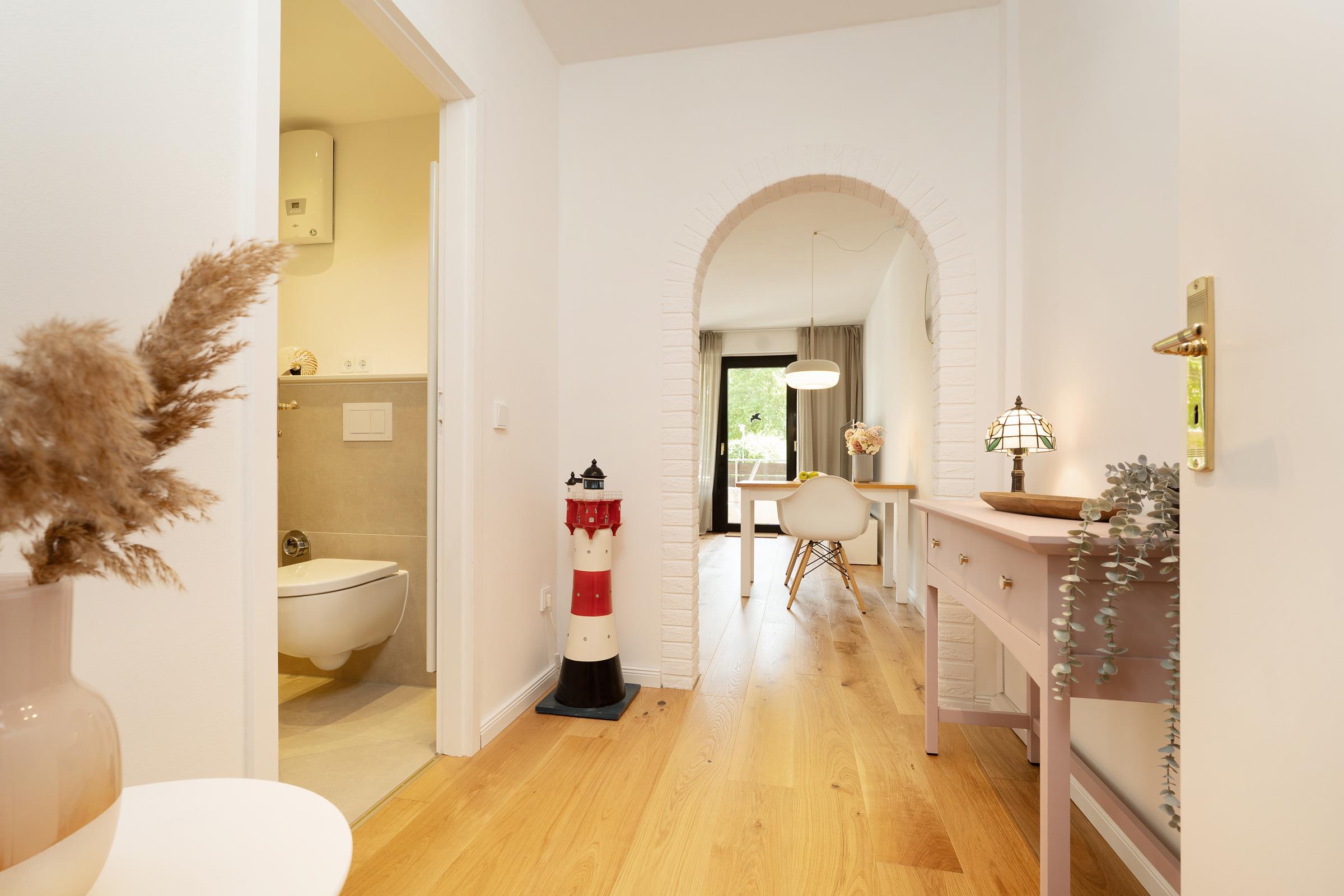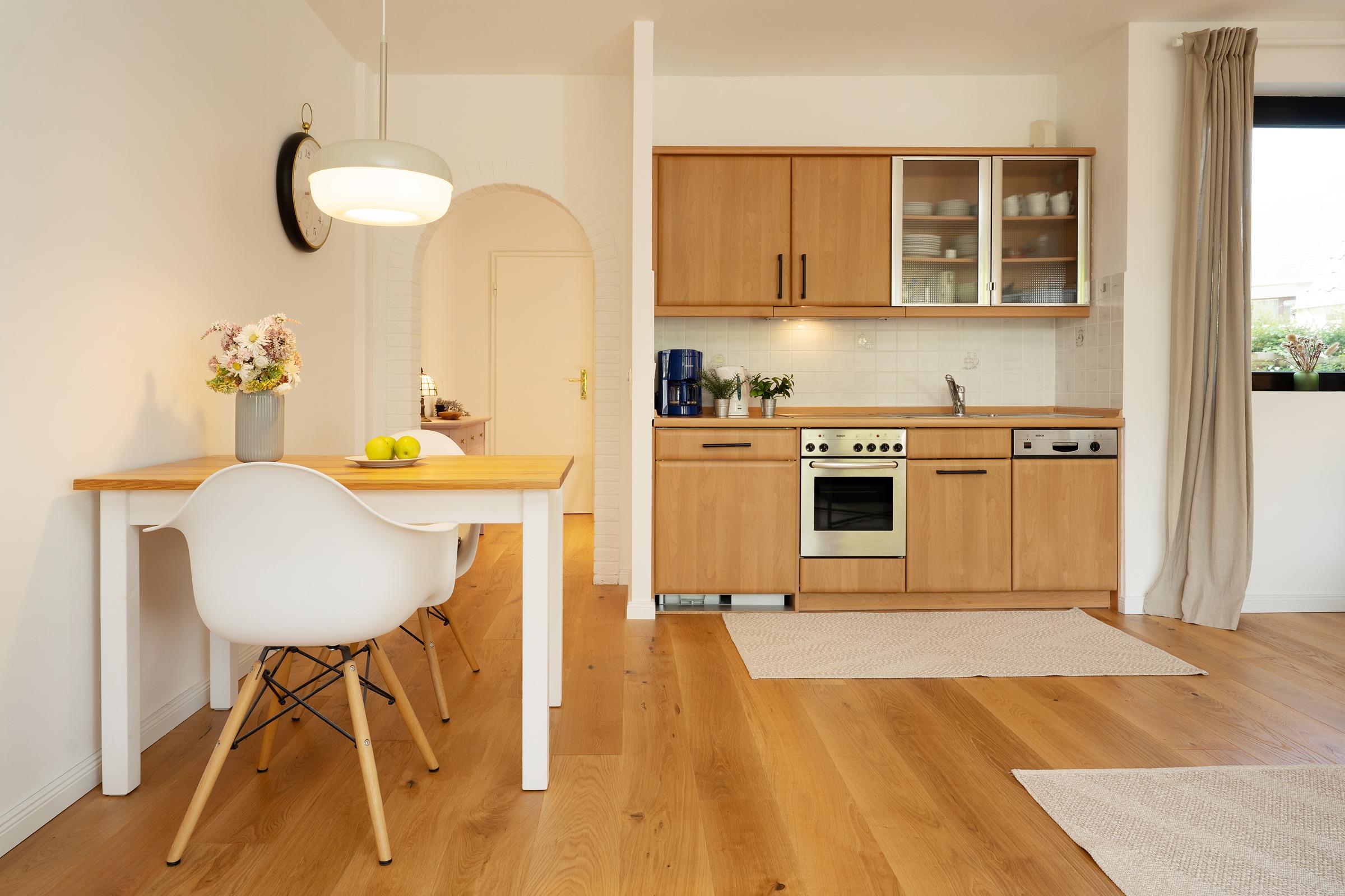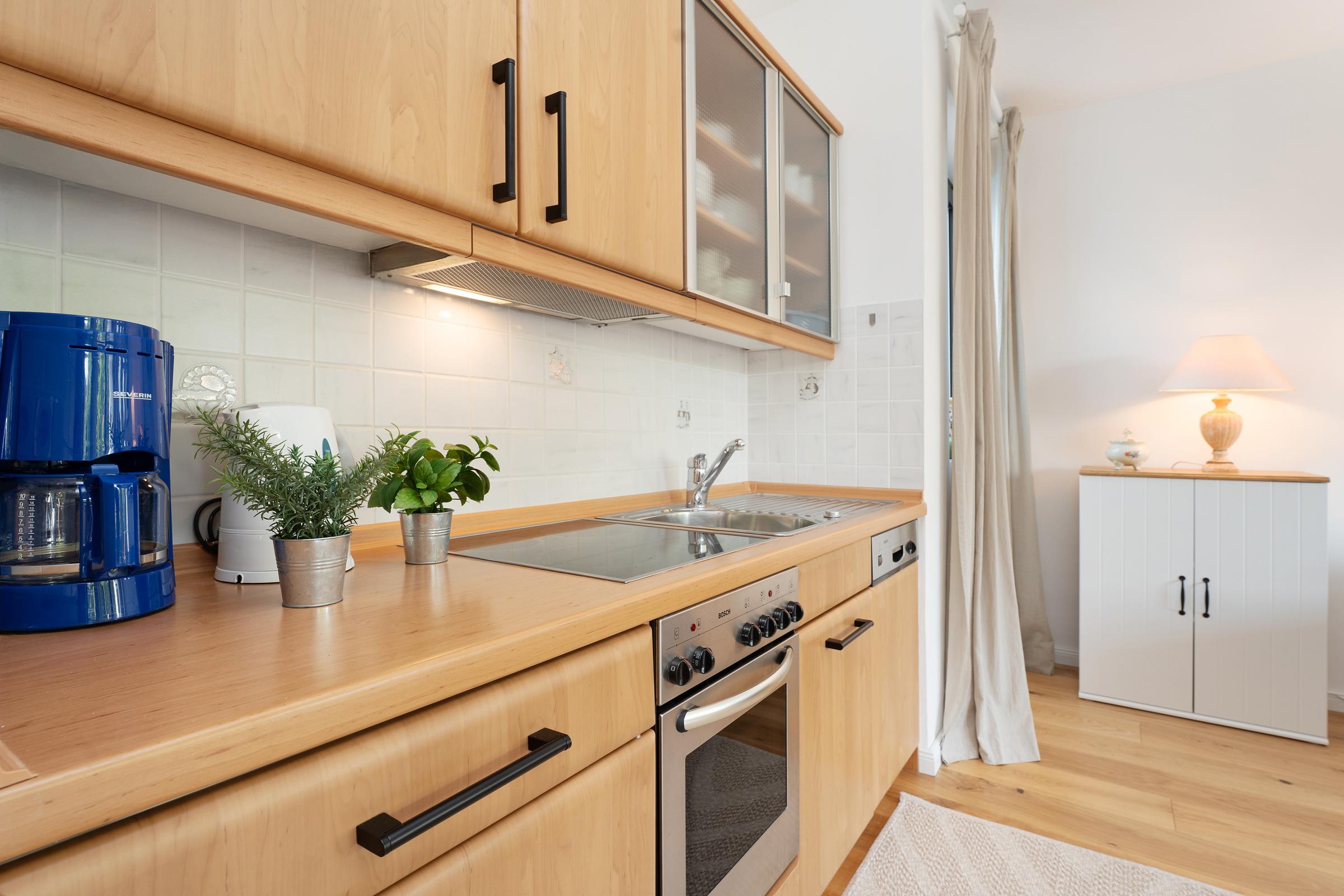 Suchen Sie das Glück an der Ostsee? Hier steht es für Sie bereit: Die Ferienwohnung Ostseeglück Fahrenhorst verspricht einen zauberhaften Urlaub voller toller Momente am Meer. In dem liebevoll eingerichteten Wohnzimmer werden Sie sich auf Anhieb wohlfühlen. Entspannen Sie bequem vor dem TV-Gerät – oder genießen Sie auf dem möblierten Balkon Ihre Auszeit. Sollte das Wetter einmal nicht so mitspielen, sitzen Sie hier dank der Überdachung immer schön geschützt und gemütlich. Vielleicht Ihr neuer Lieblingsplatz? Die sehr gut ausgestattete Küche ist zum Wohnbereich hin offen gestaltet und zaubert Hobby-Köchen beim Zubereiten ihrer Urlaubsmenüs sicher ein Lächeln ins Gesicht. Im Anschluss übernimmt eine Spülmaschine den Abwasch. Für die Nacht wartet im Schlafzimmer ein bequemes Doppelbett (2x 90x200 cm) auf Sie. Hier befindet sich auch genug Platz, um ein Babybett aufzustellen. Verdunkelt wird der Raum mit einem Rollo. Das moderne Duschbad sorgt für einen tollen Start in den neuen Urlaubstag.