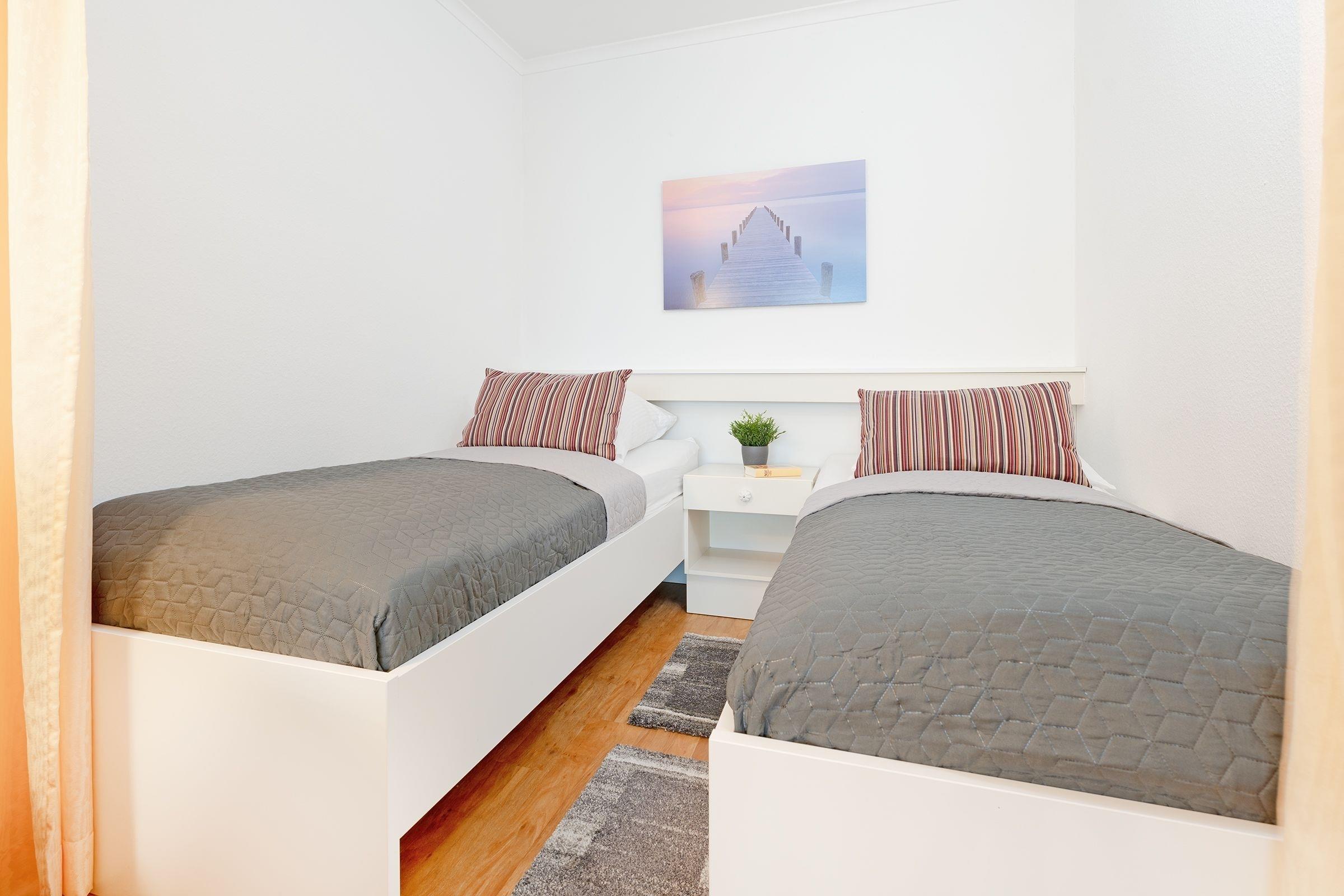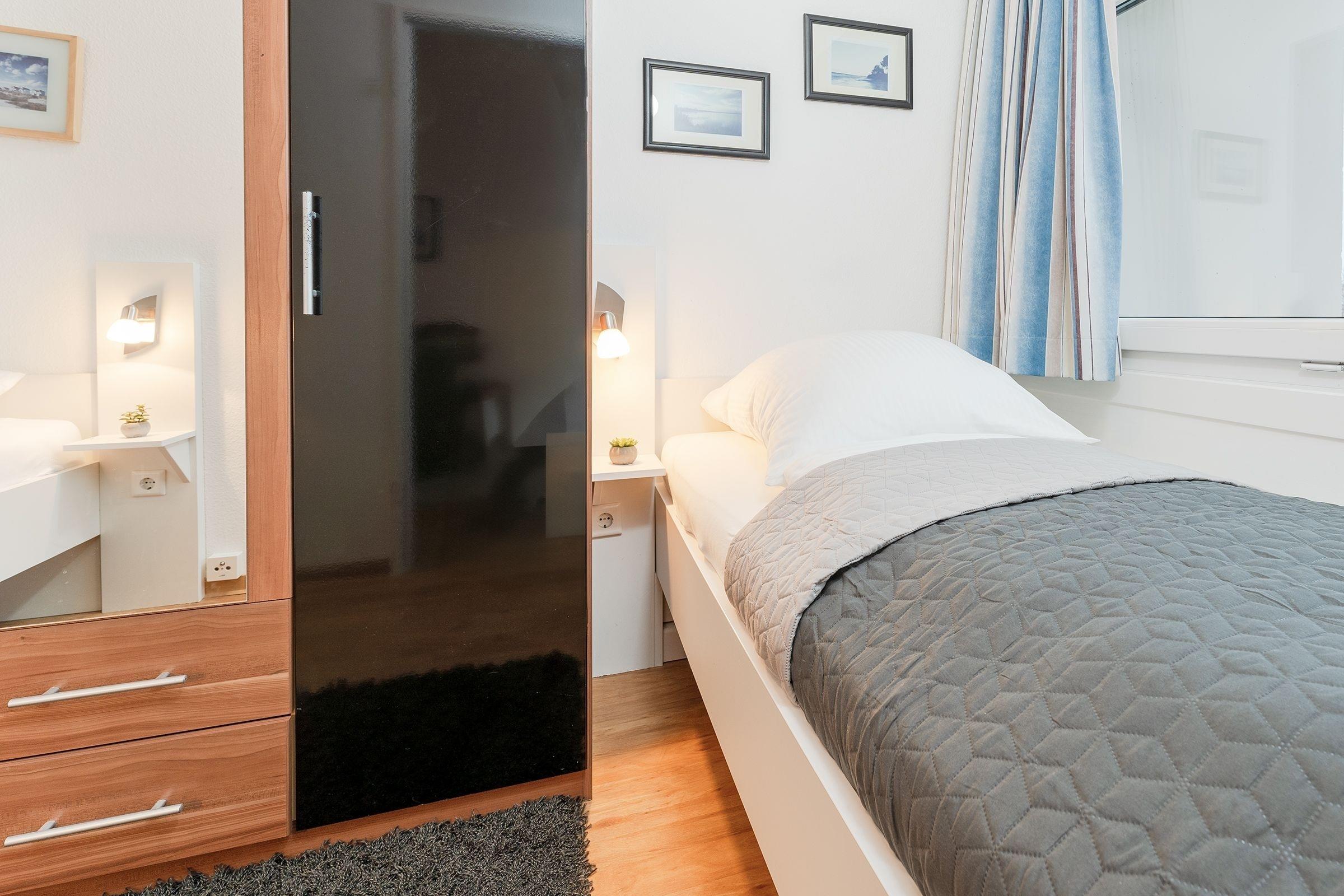 Schlafzimmer: 2 Einzelbetten (90 x 200cm und 100 x 200cm), Kleiderschrank, Verdunkelungsmöglichkeit: Gardinen, kein Platz für Babybett