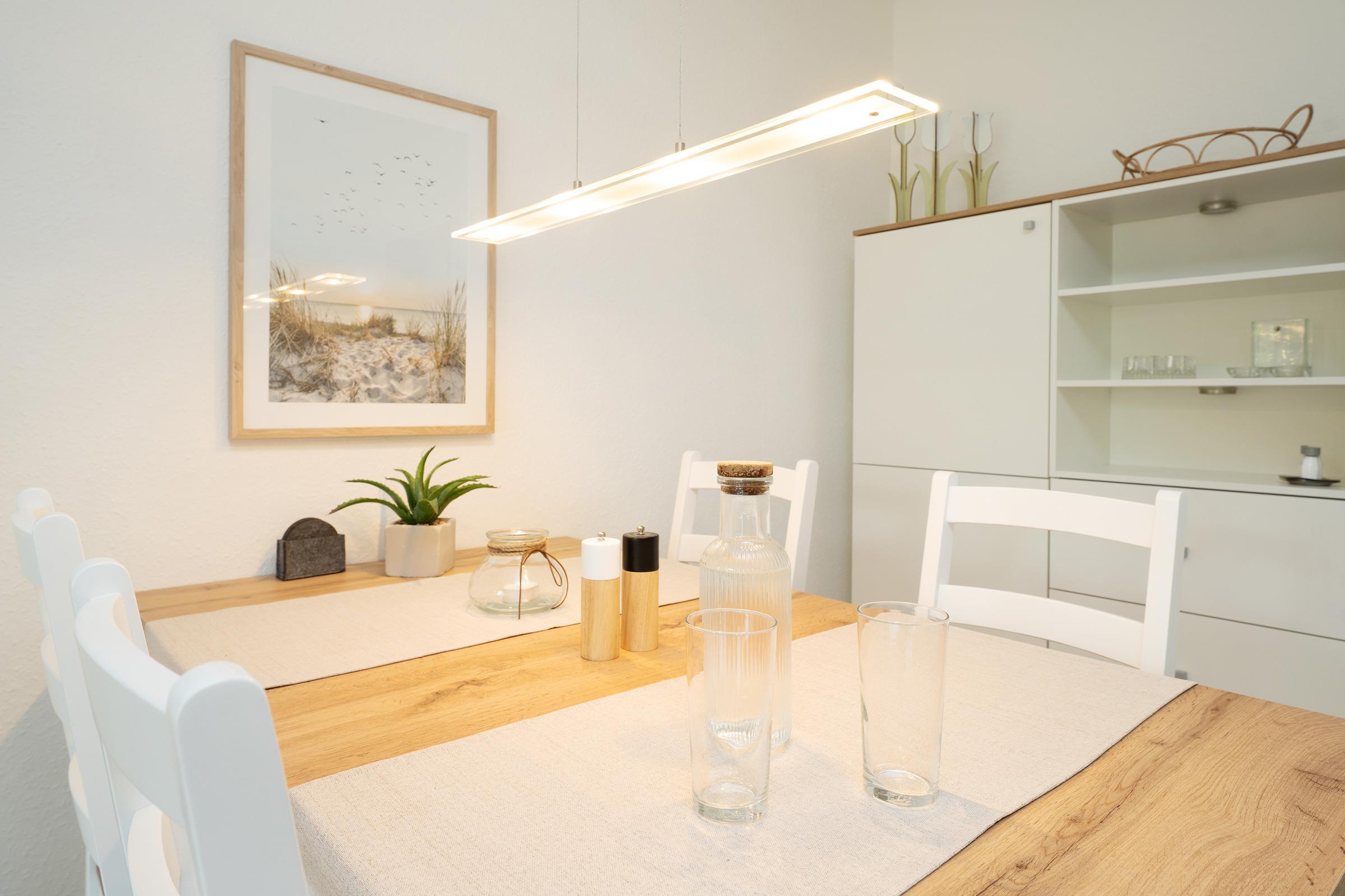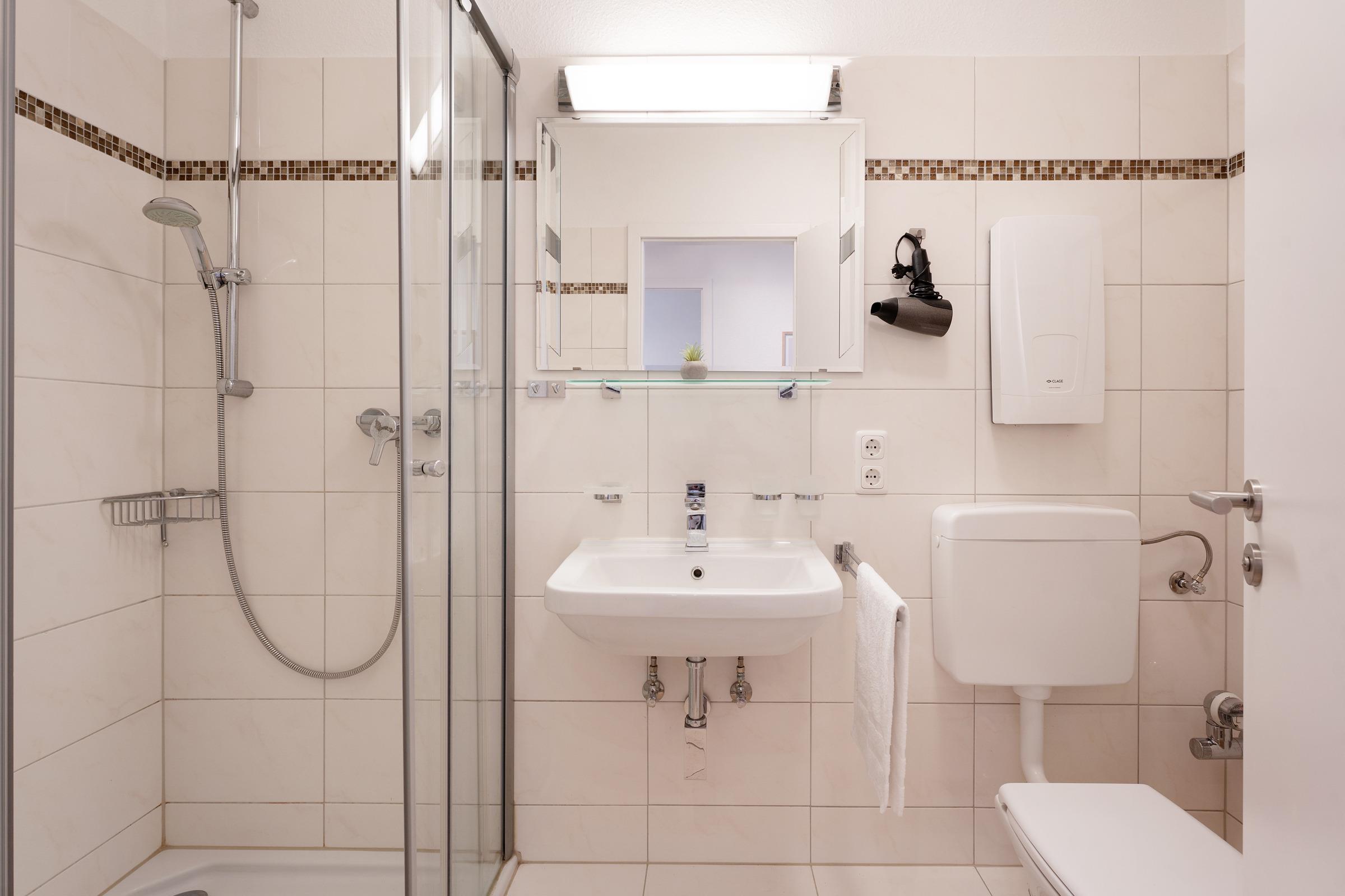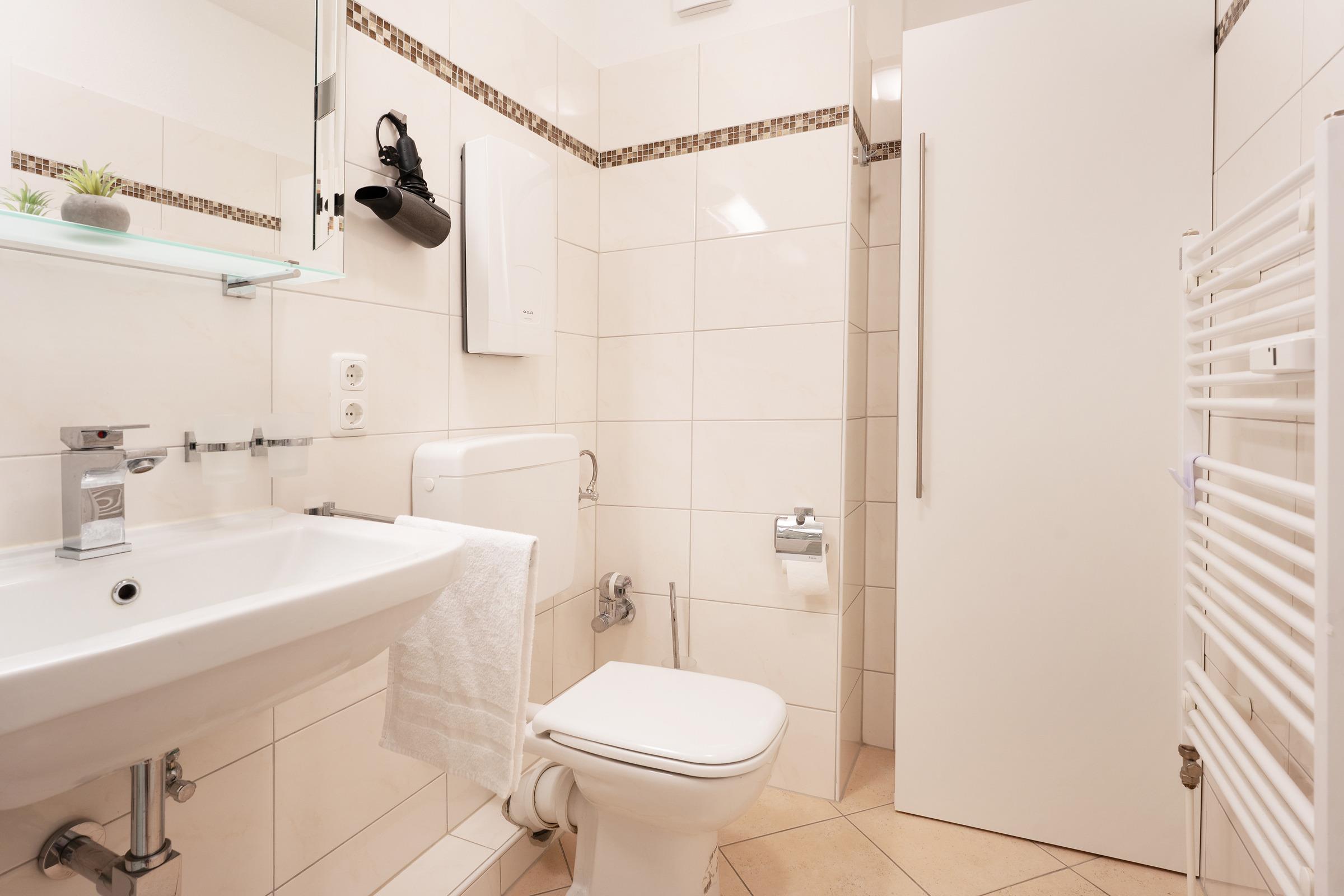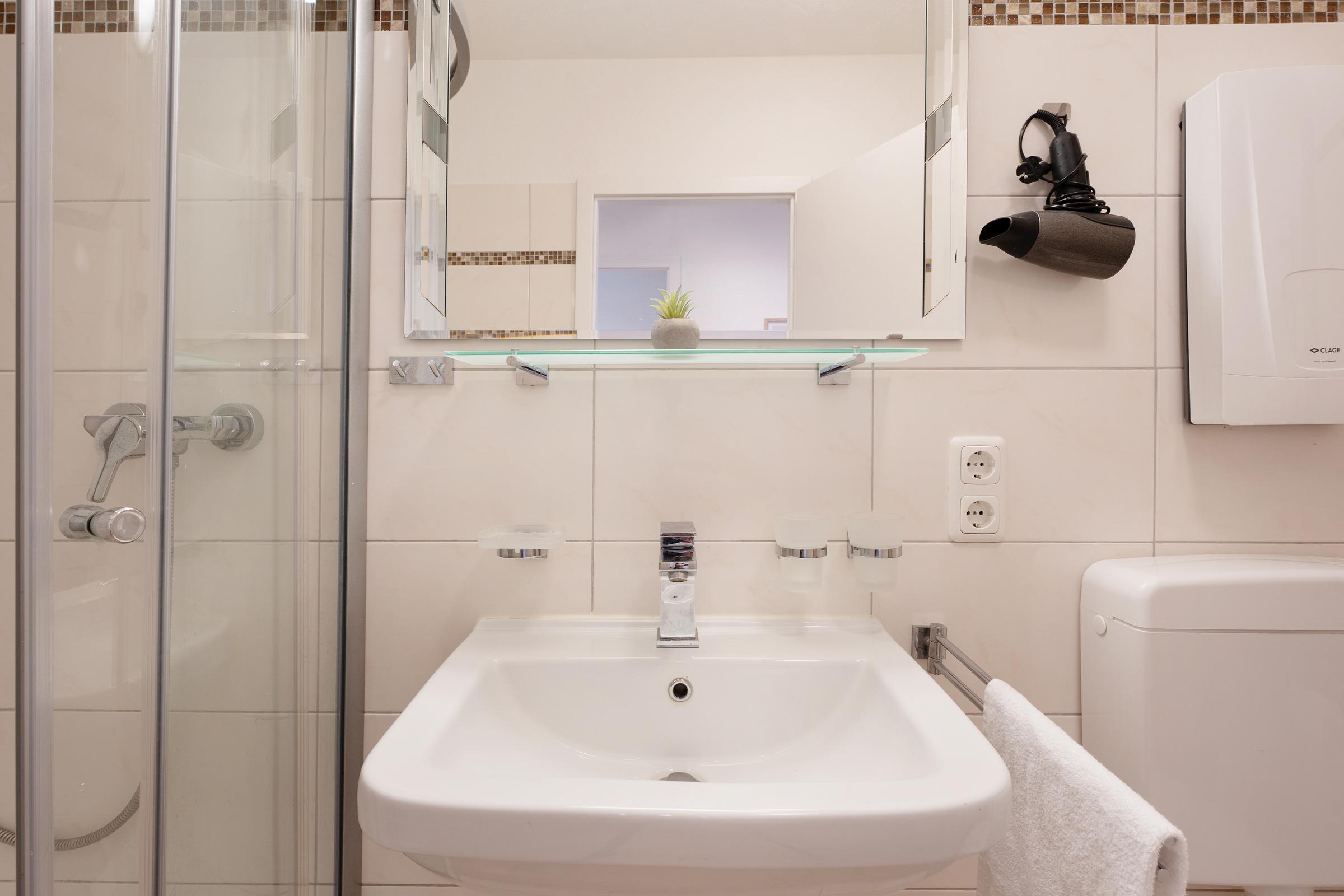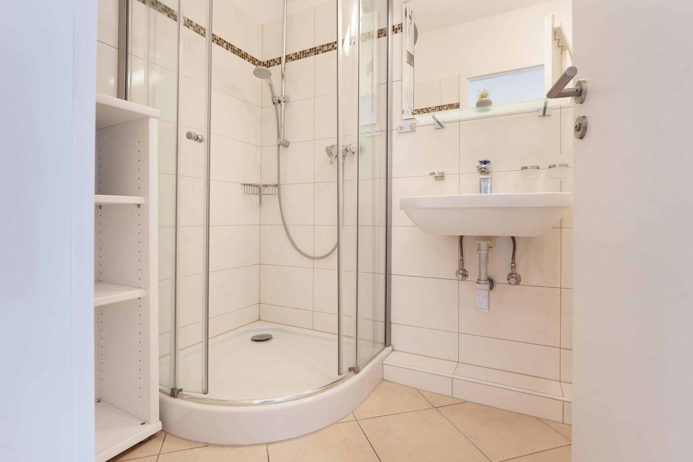 Das helle Badezimmer verfügt über eine Dusche und sorgt mit seinem modernen Design für den richtigen Start in den Tag. Für aktive Urlaubsmomente steht Ihnen im Keller eine Tischtennisplatte zur gemeinschaftlichen Nutzung zur Verfügung.