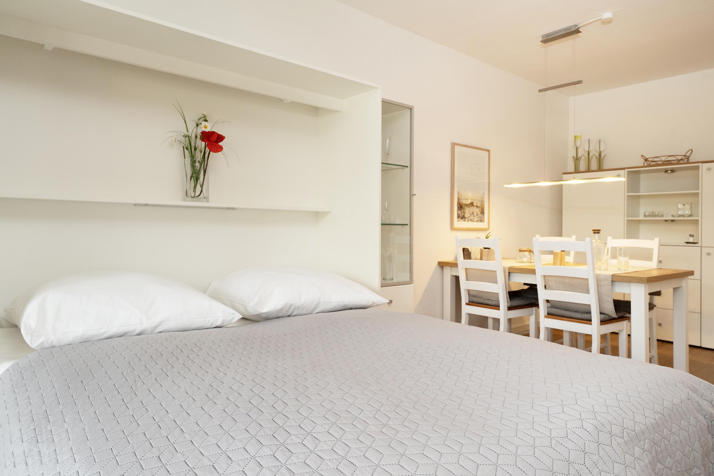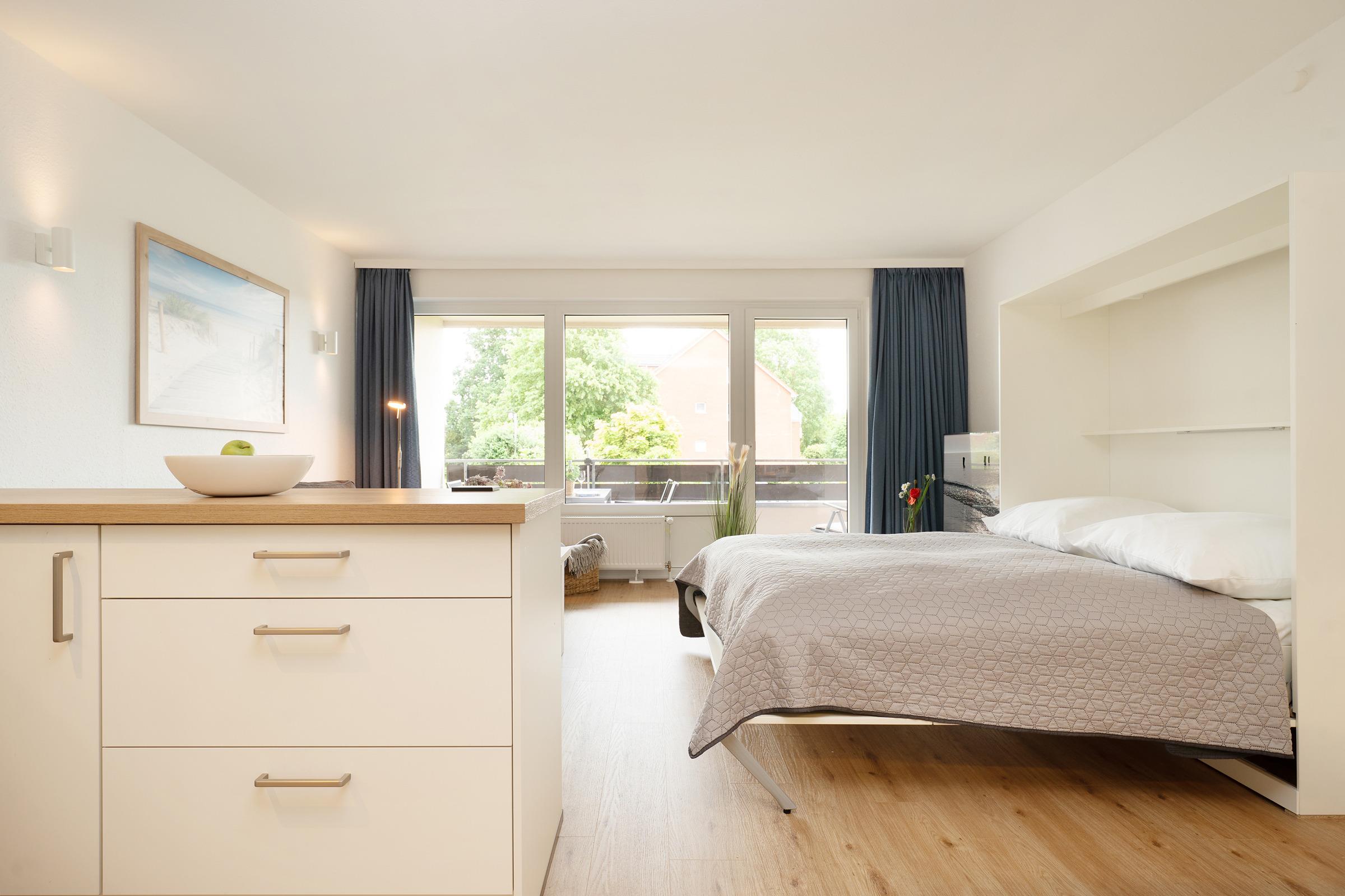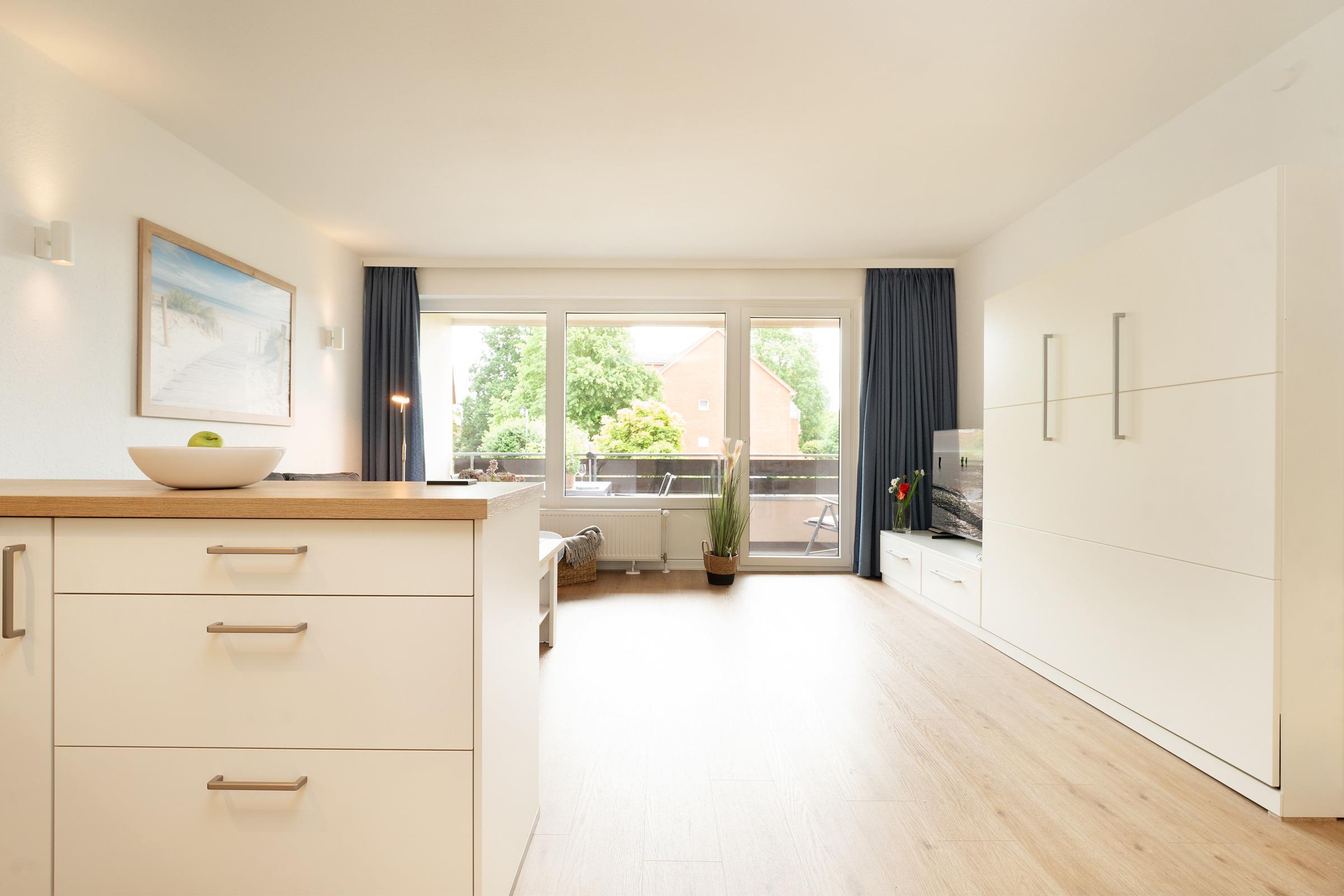 Der moderne, offene Wohnbereich lädt zum Verweilen ein. Ein komfortables Schrankbett (2 x 80x200 cm) lässt sich bei Bedarf ganz einfach ausklappen und sorgt für eine erholsame Nachtruhe. Direkt angrenzend finden Sie eine komplett ausgestattete Küche mit allem, was Sie zum Kochen brauchen – inklusive gemütlichem Essplatz.