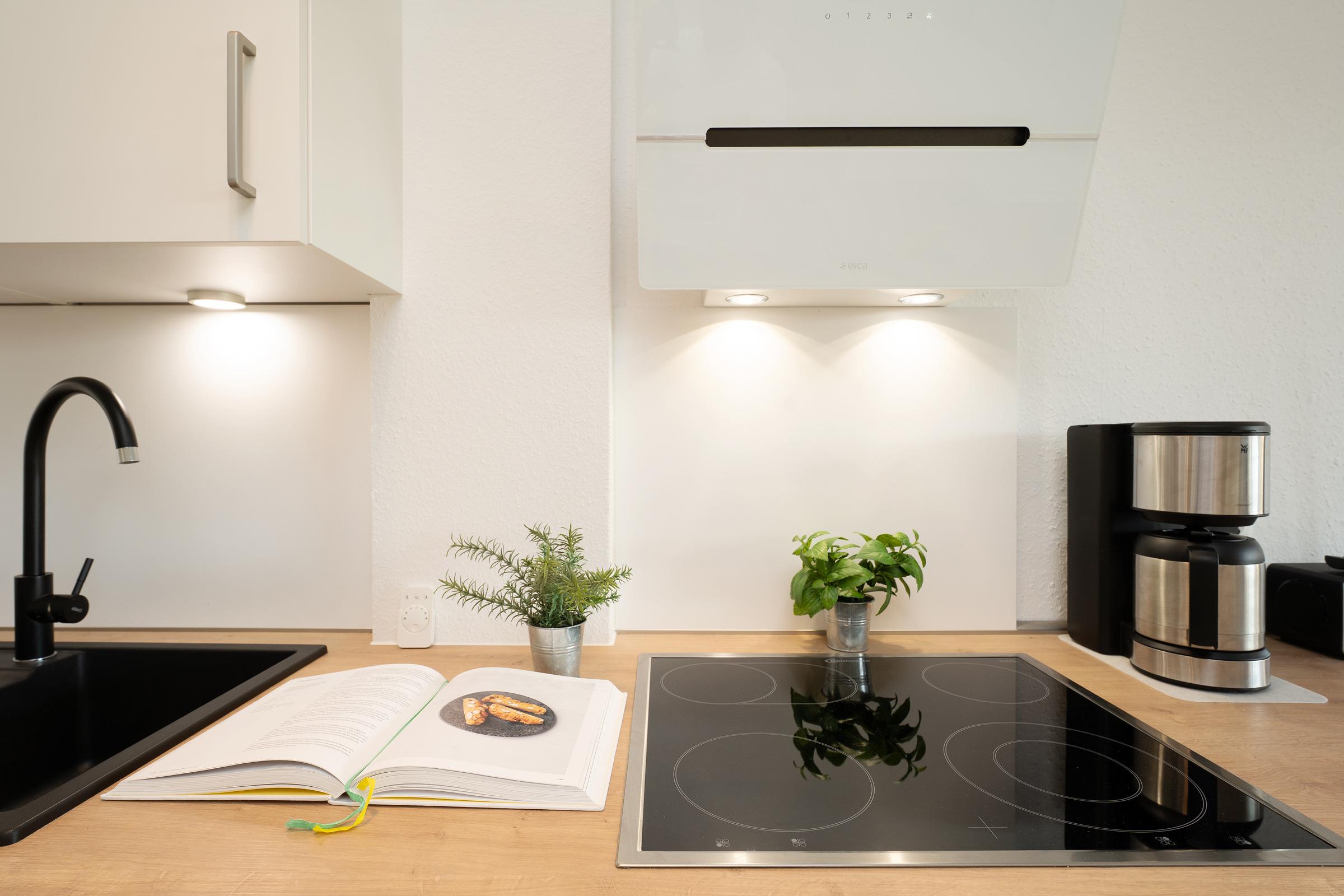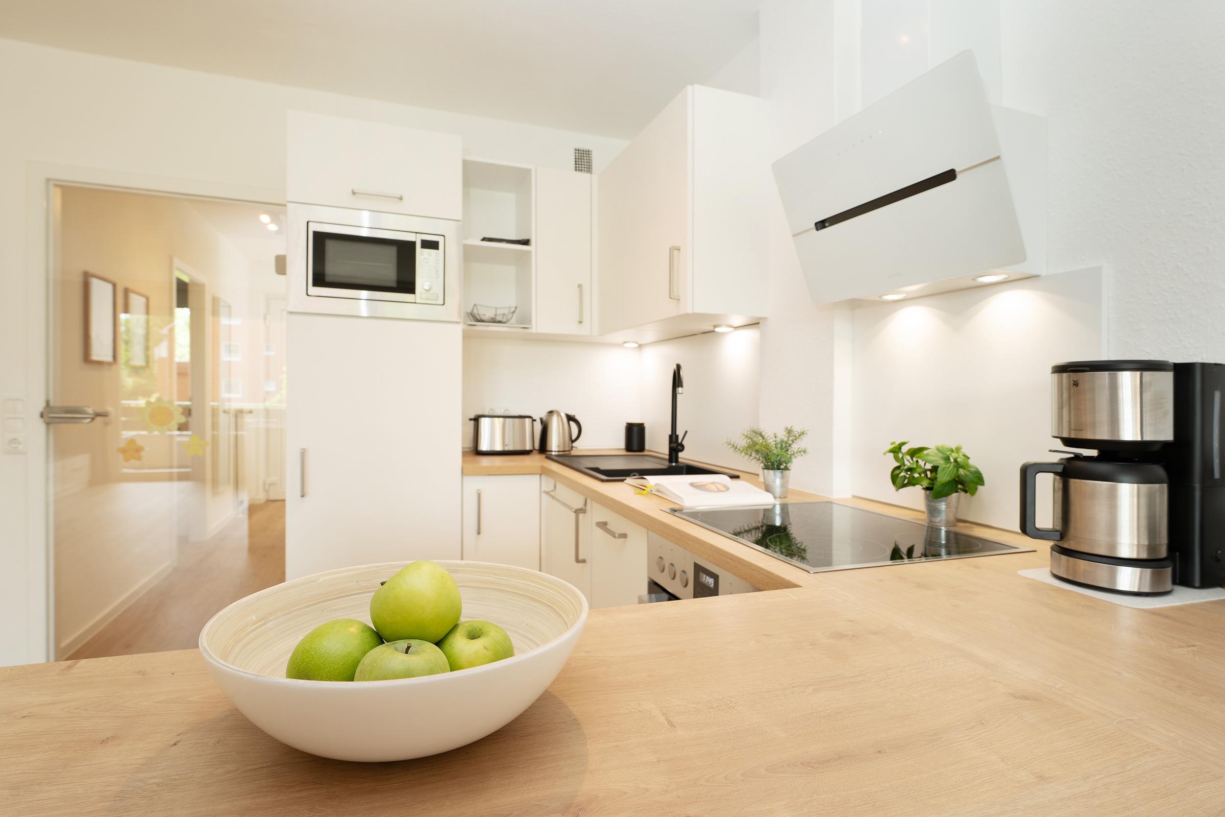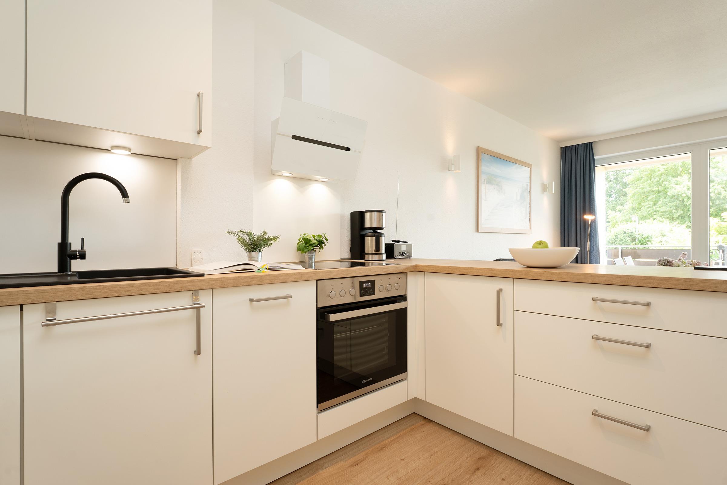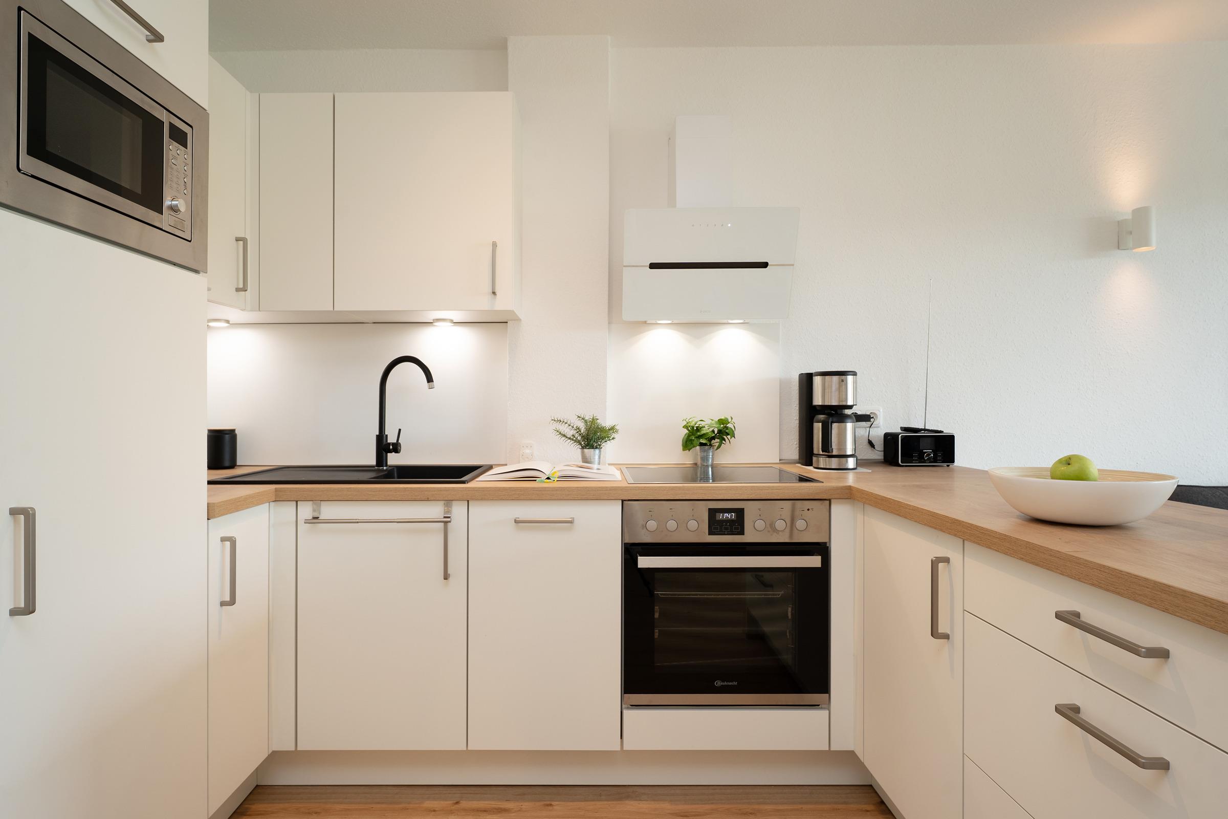 Der moderne, offene Wohnbereich lädt zum Verweilen ein. Ein komfortables Schrankbett (2 x 80x200 cm) lässt sich bei Bedarf ganz einfach ausklappen und sorgt für eine erholsame Nachtruhe. Direkt angrenzend finden Sie eine komplett ausgestattete Küche mit allem, was Sie zum Kochen brauchen – inklusive gemütlichem Essplatz.