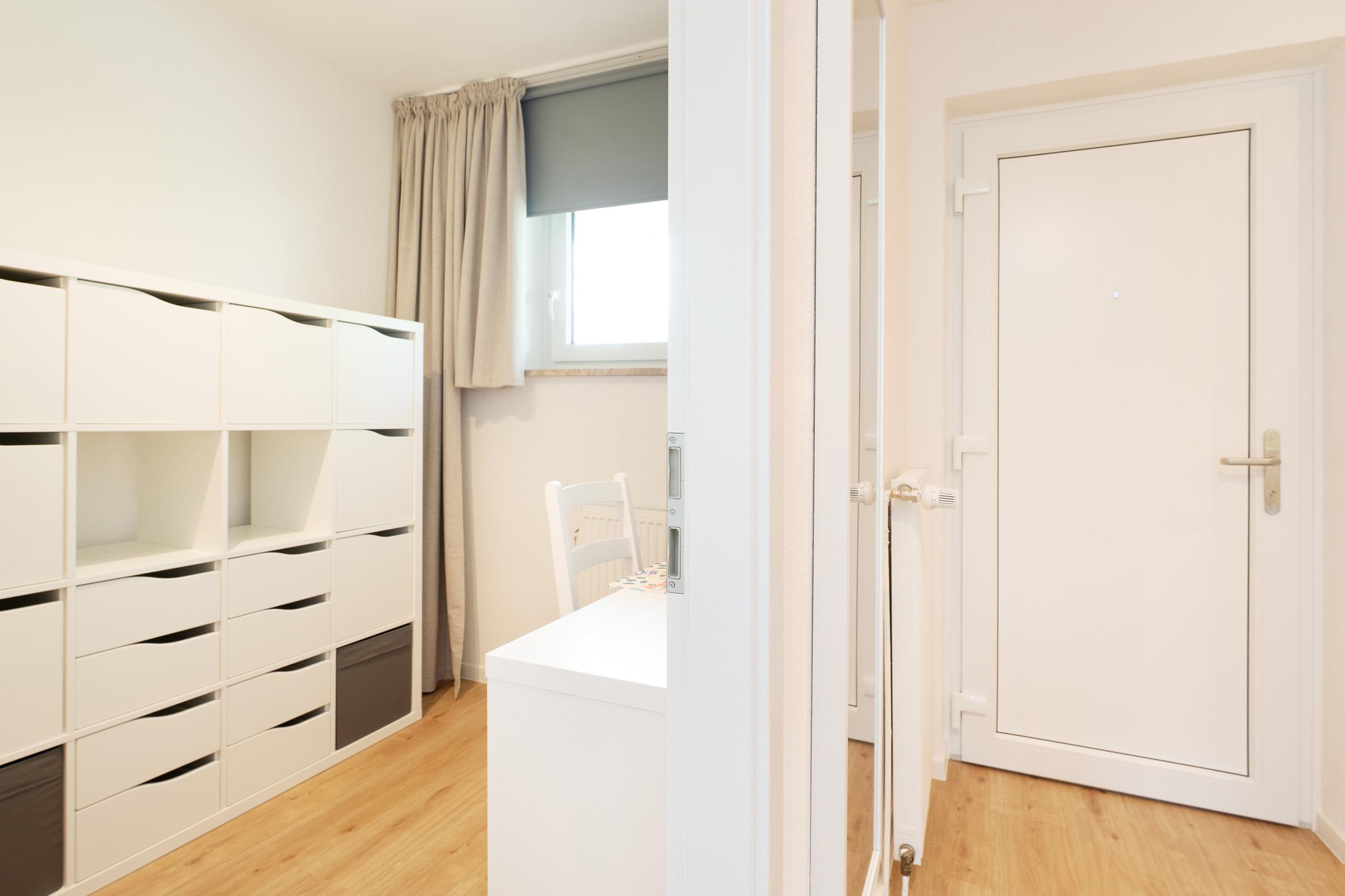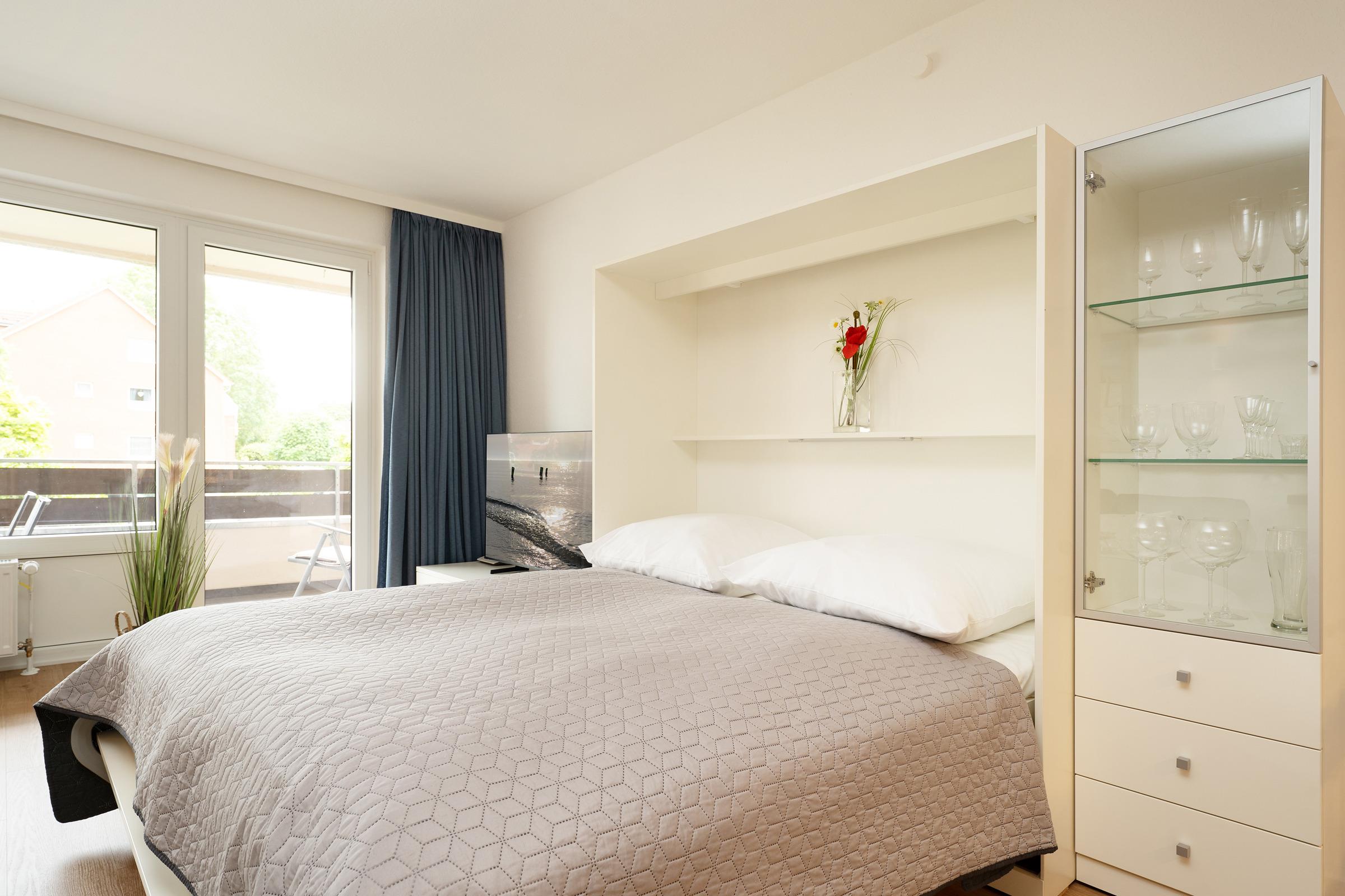 Wohn-/Schlafzimmer: 1 Schrankbett (2x 80x200cm), Kleiderschrank, TV, Verdunkelung: Rollo