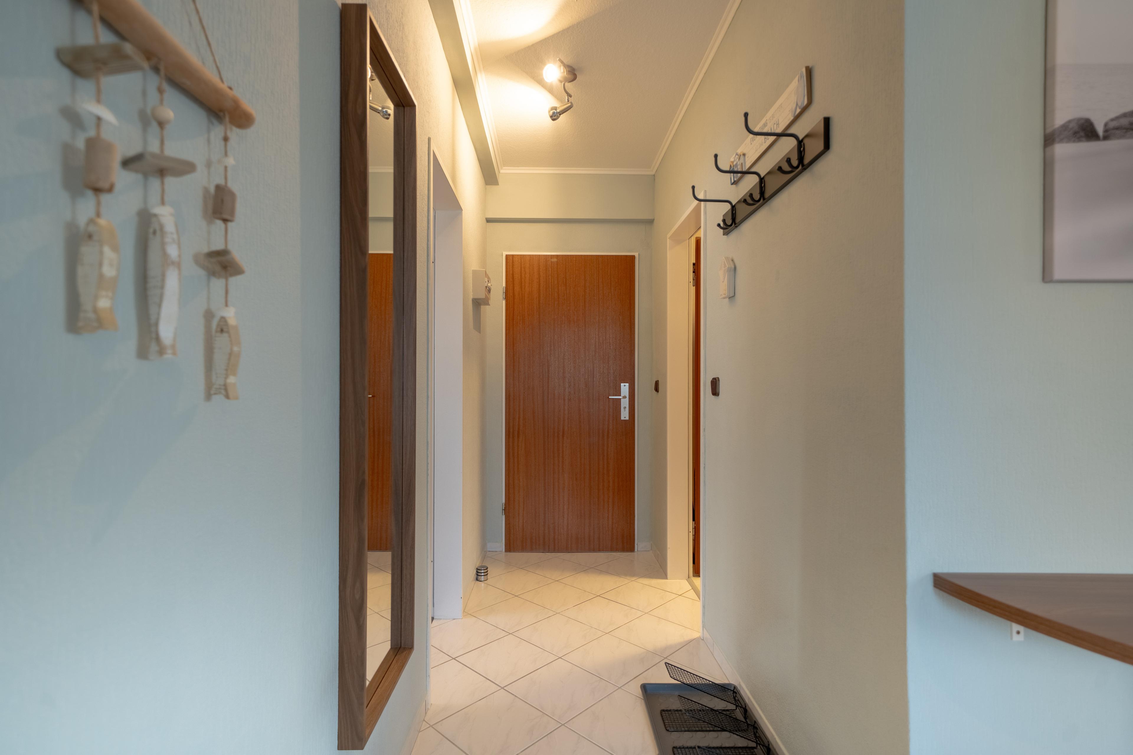 Aufgeteilt ist Ihr Ferienobjekt in Eingangsbereich mit Garderobe, Badezimmer mit Dusche, Haartrockner, WC, einem Schlafzimmer mit Doppelbett und Kleiderschrank.