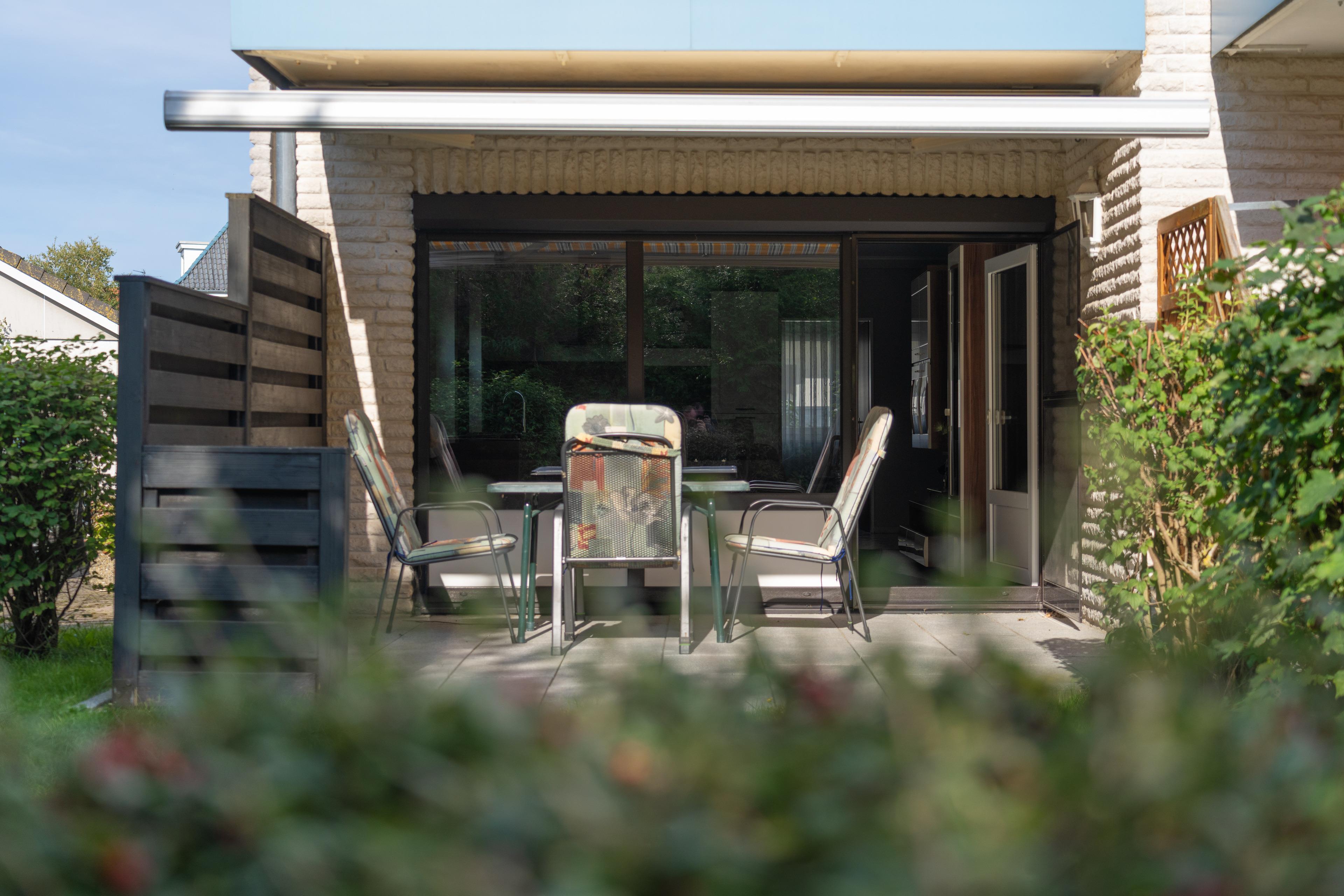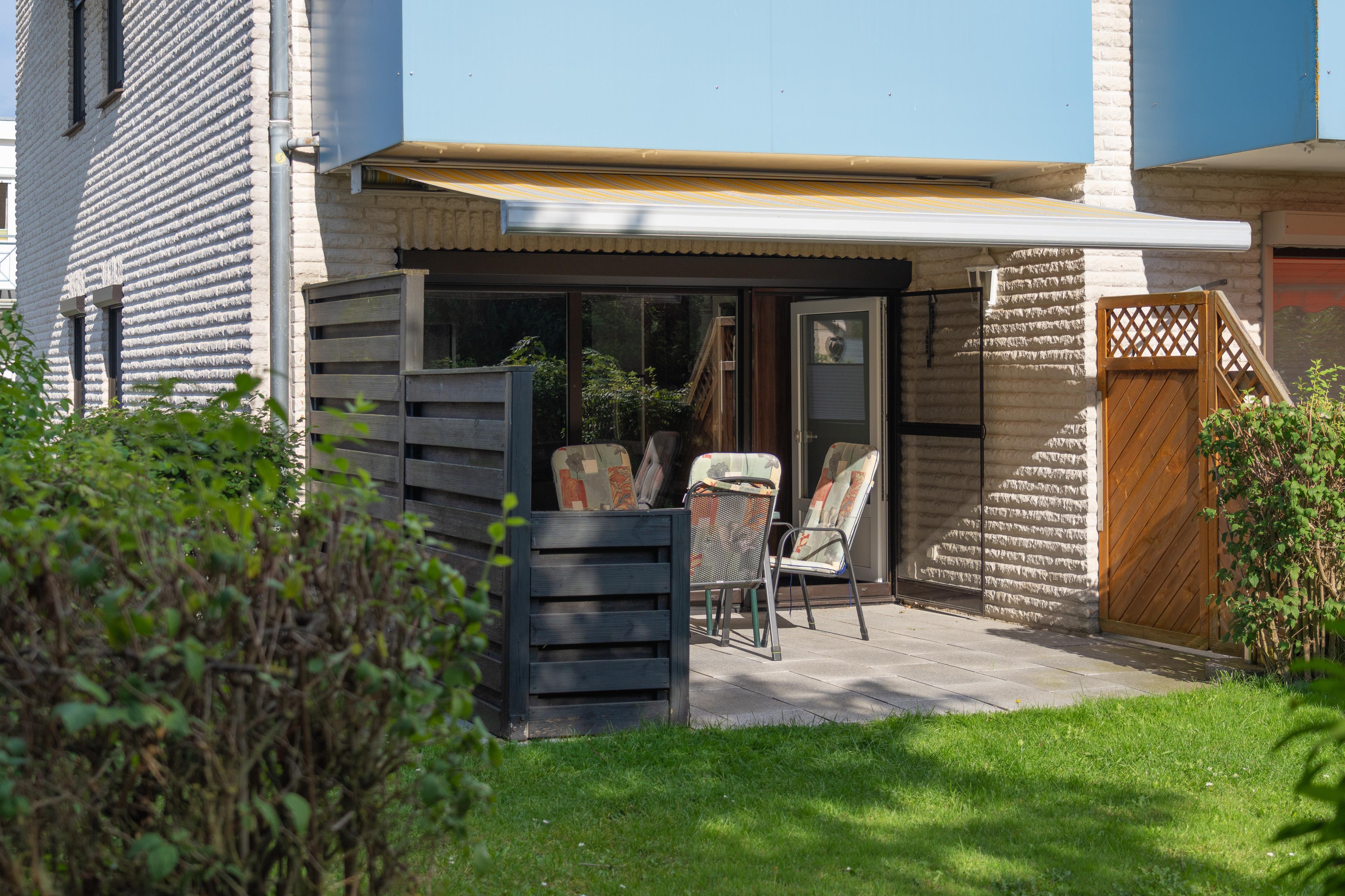 Die an den Wohnbereich angrenzende Terrasse ist mit Gartentisch und Bestuhlung ausgestattet.