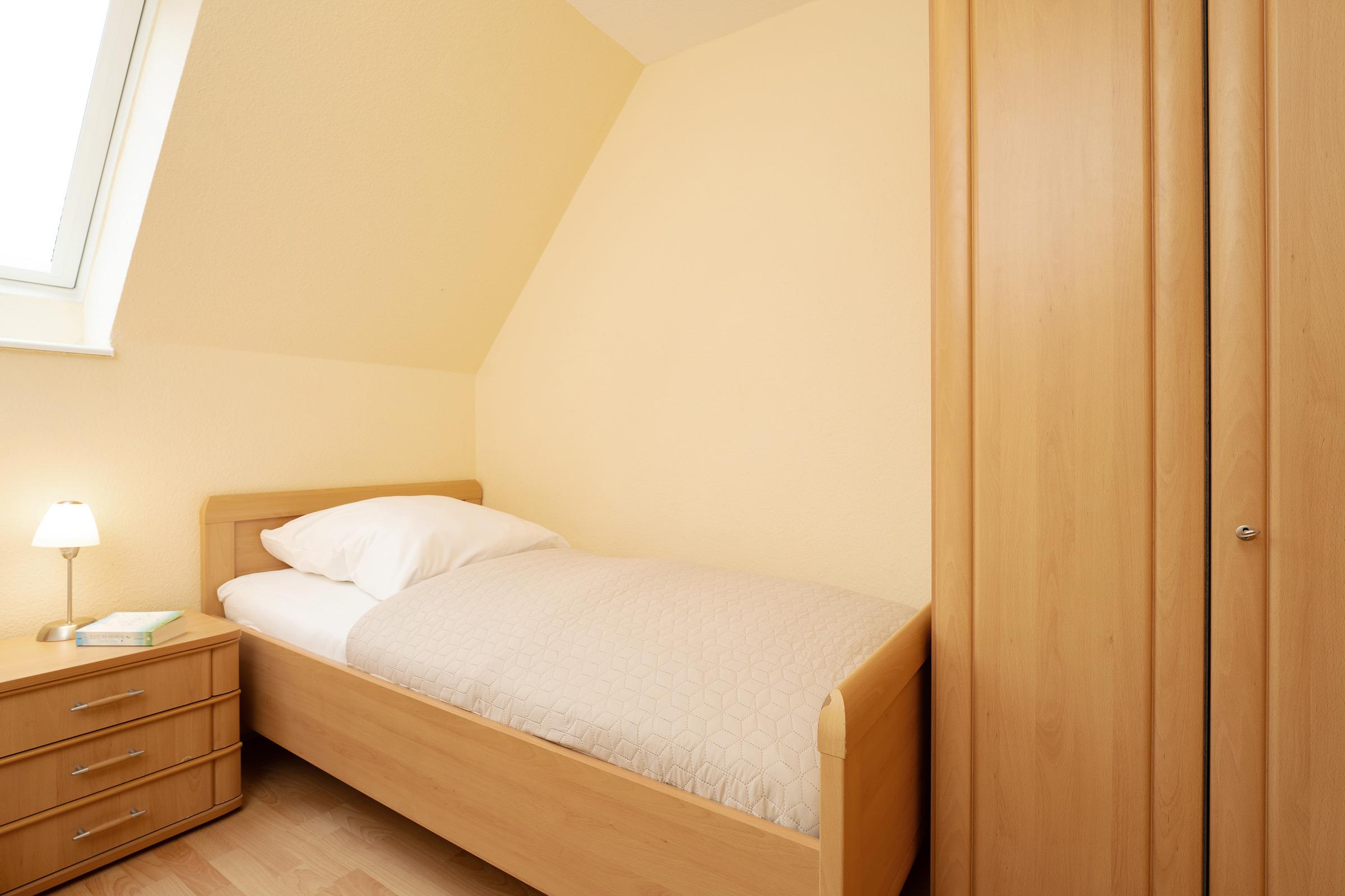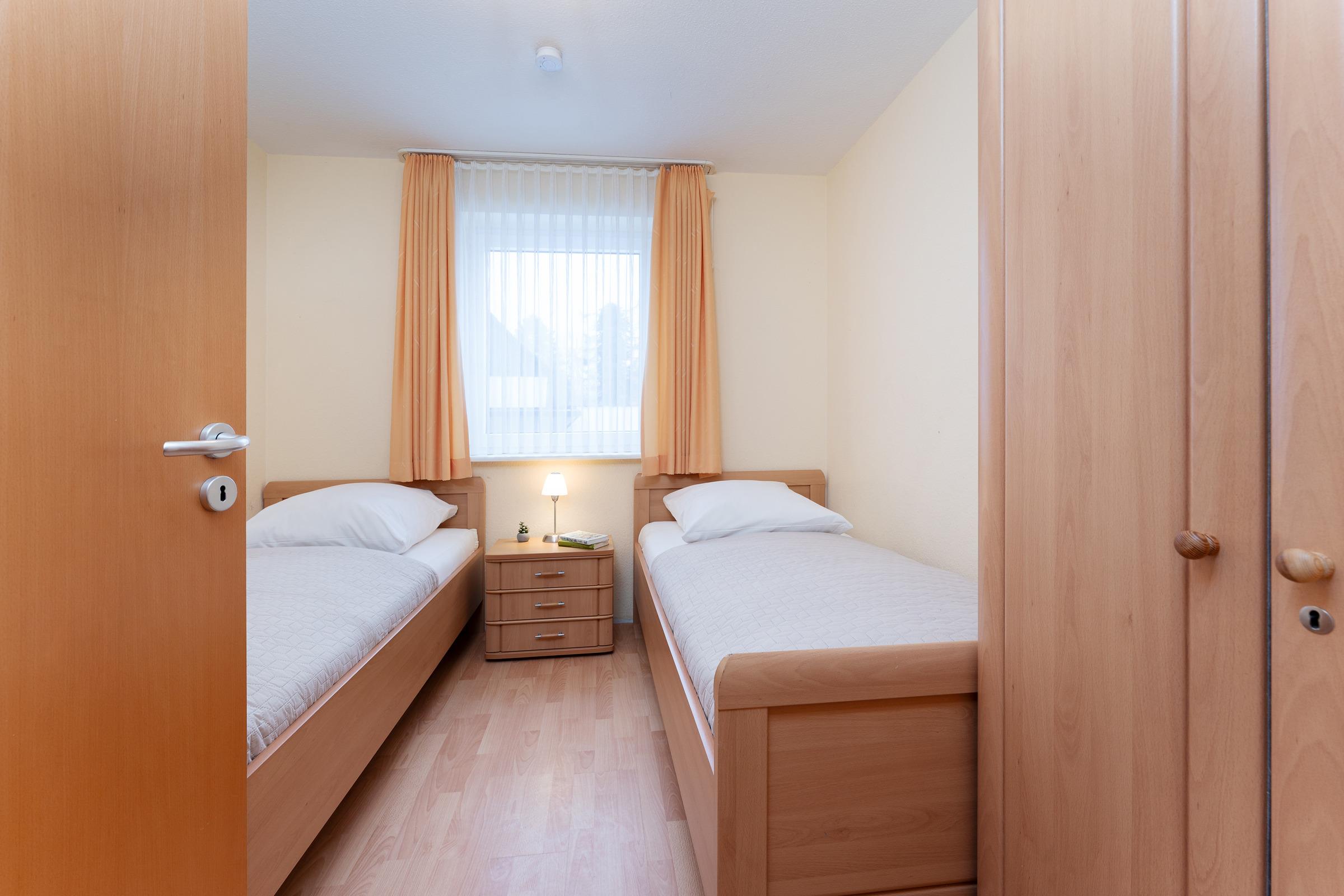 Schlafzimmer 2 (1. OG): 2 Einzelbetten (90 x 200 cm), Kleiderschrank, Verdunkelung: Rollo, kein Platz für Babybett