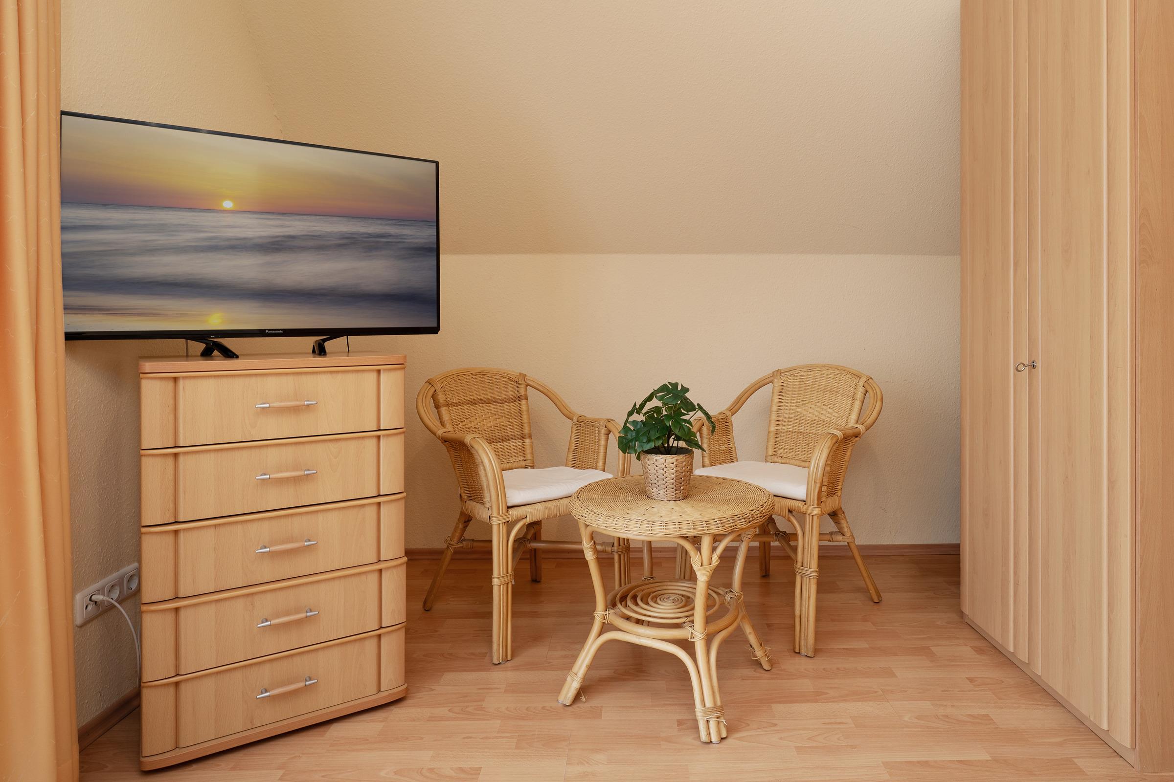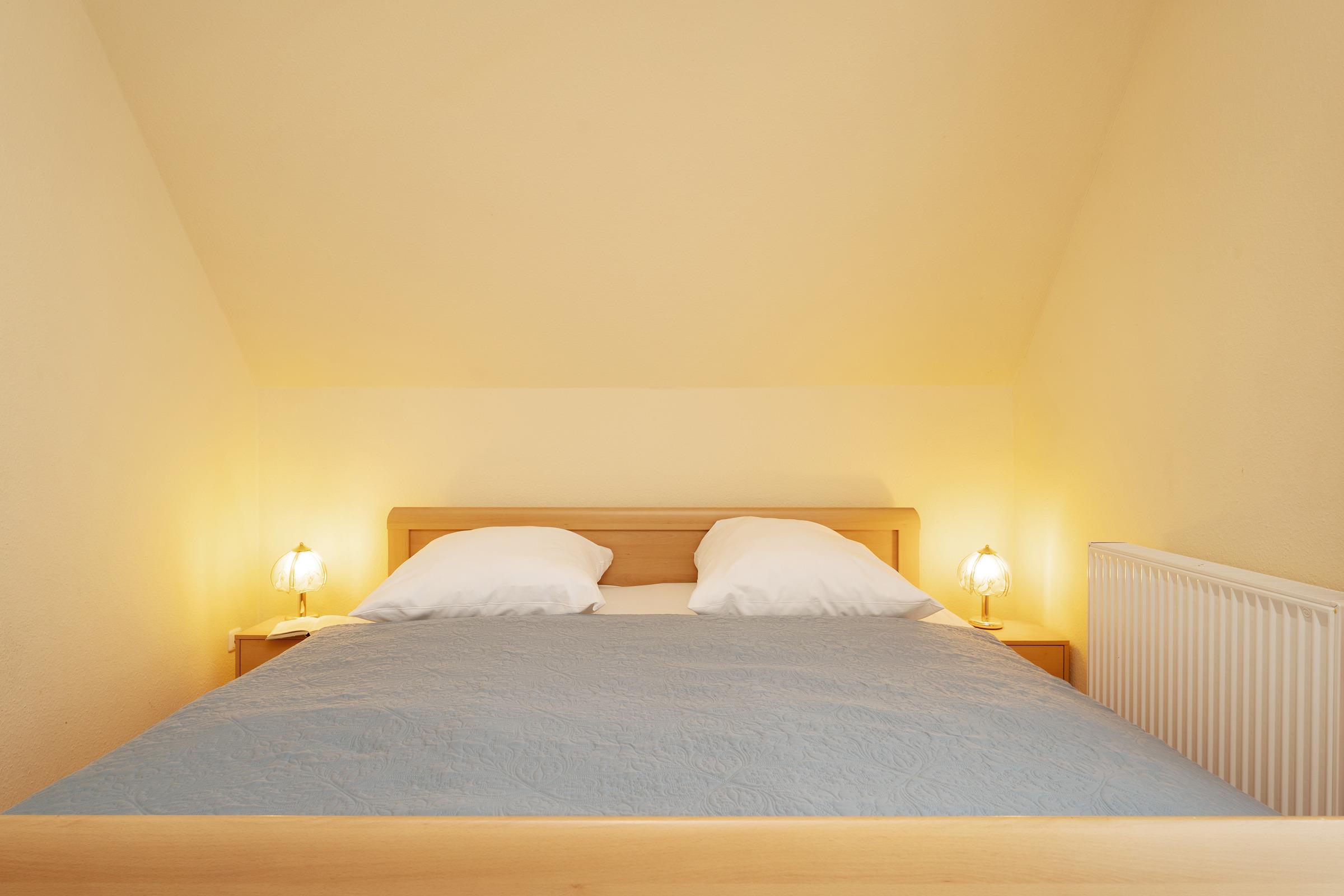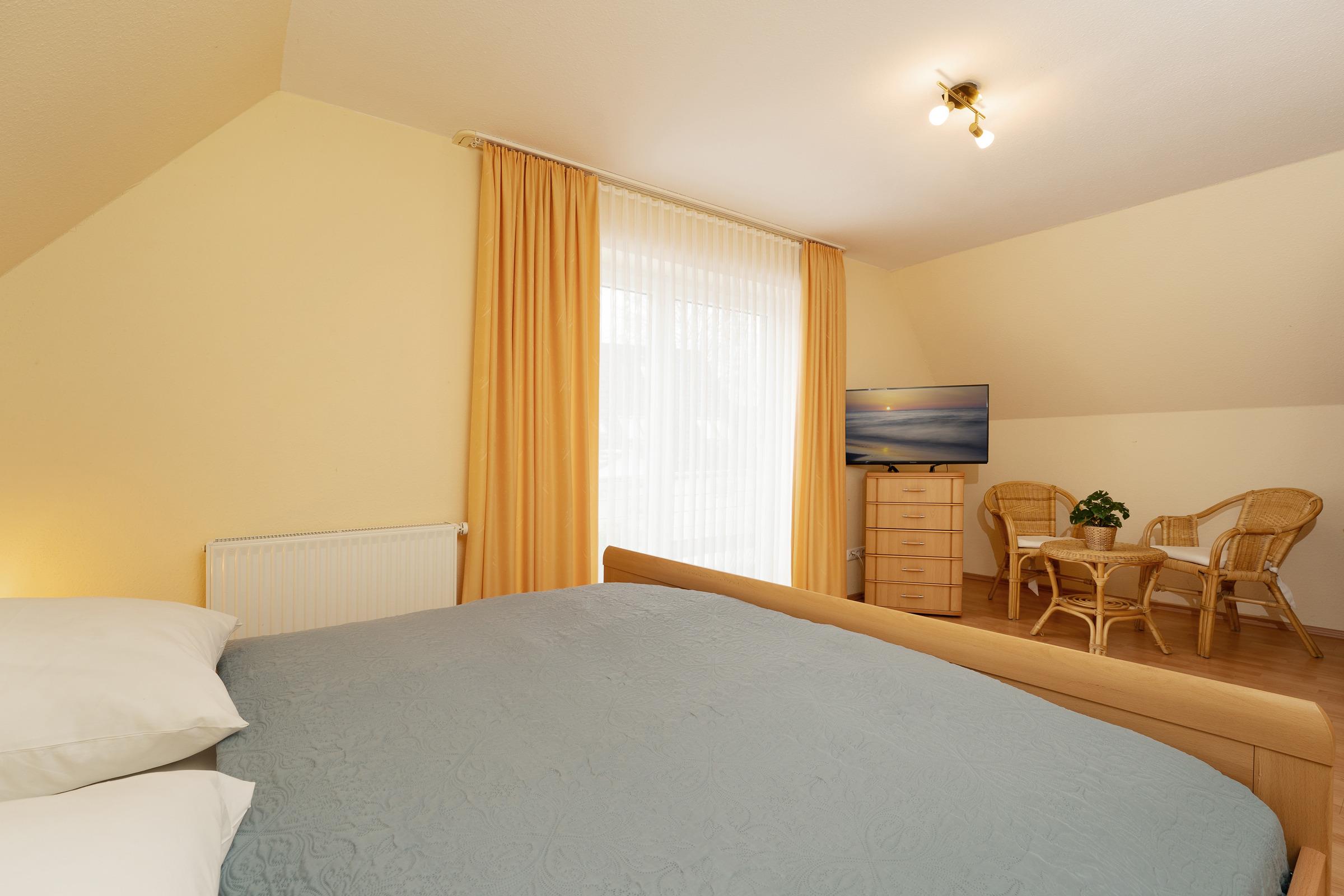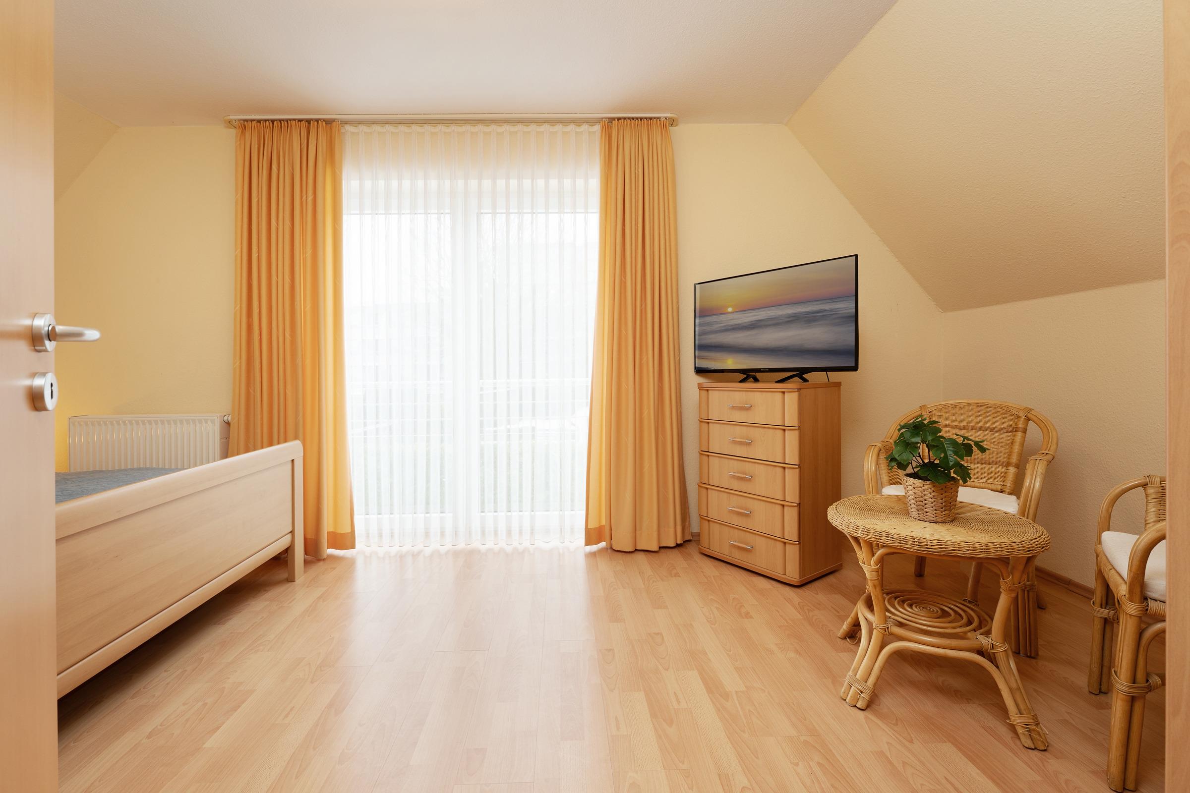 Schlafzimmer 3 (1. OG): 1 Doppelbett (2x 90 x 200 cm), Kleiderschrank, Fernseher, Verdunkelung: Gardine, Platz für Babybett