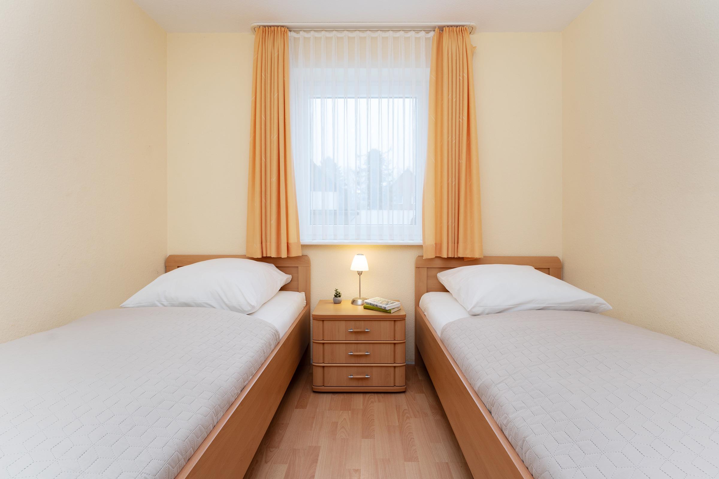 Schlafzimmer 1 (EG): 2 Einzelbetten (90 x 200 cm), Kleiderschrank, Verdunkelung: Rollo, kein Platz für Babybett
