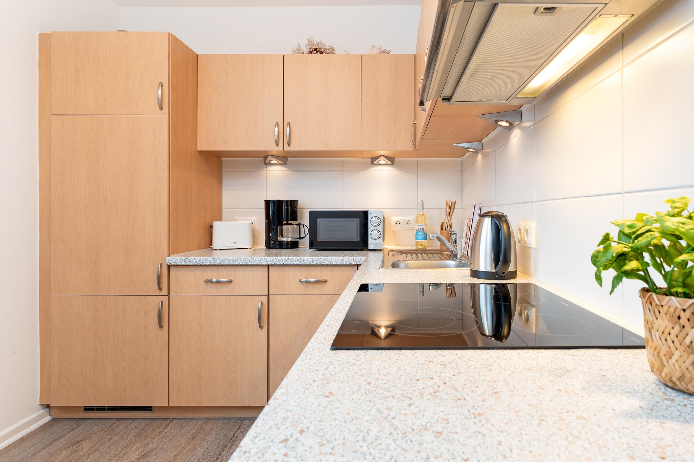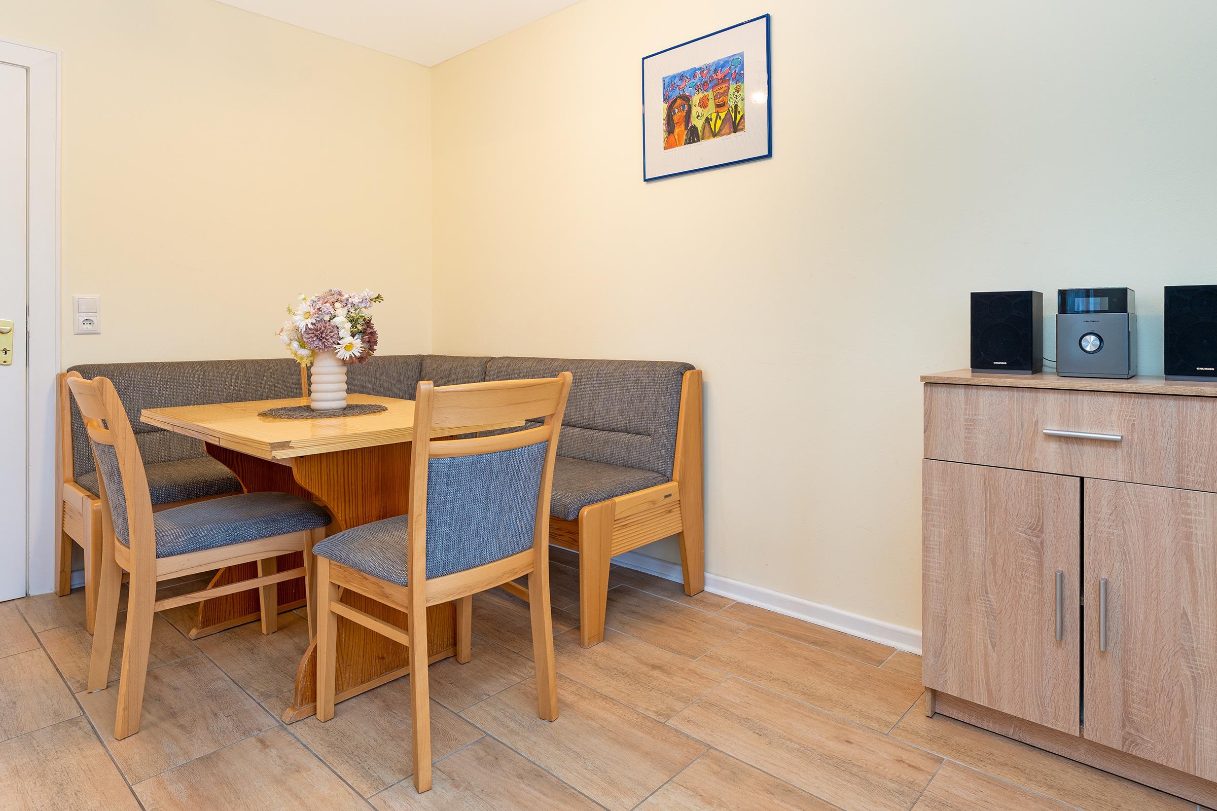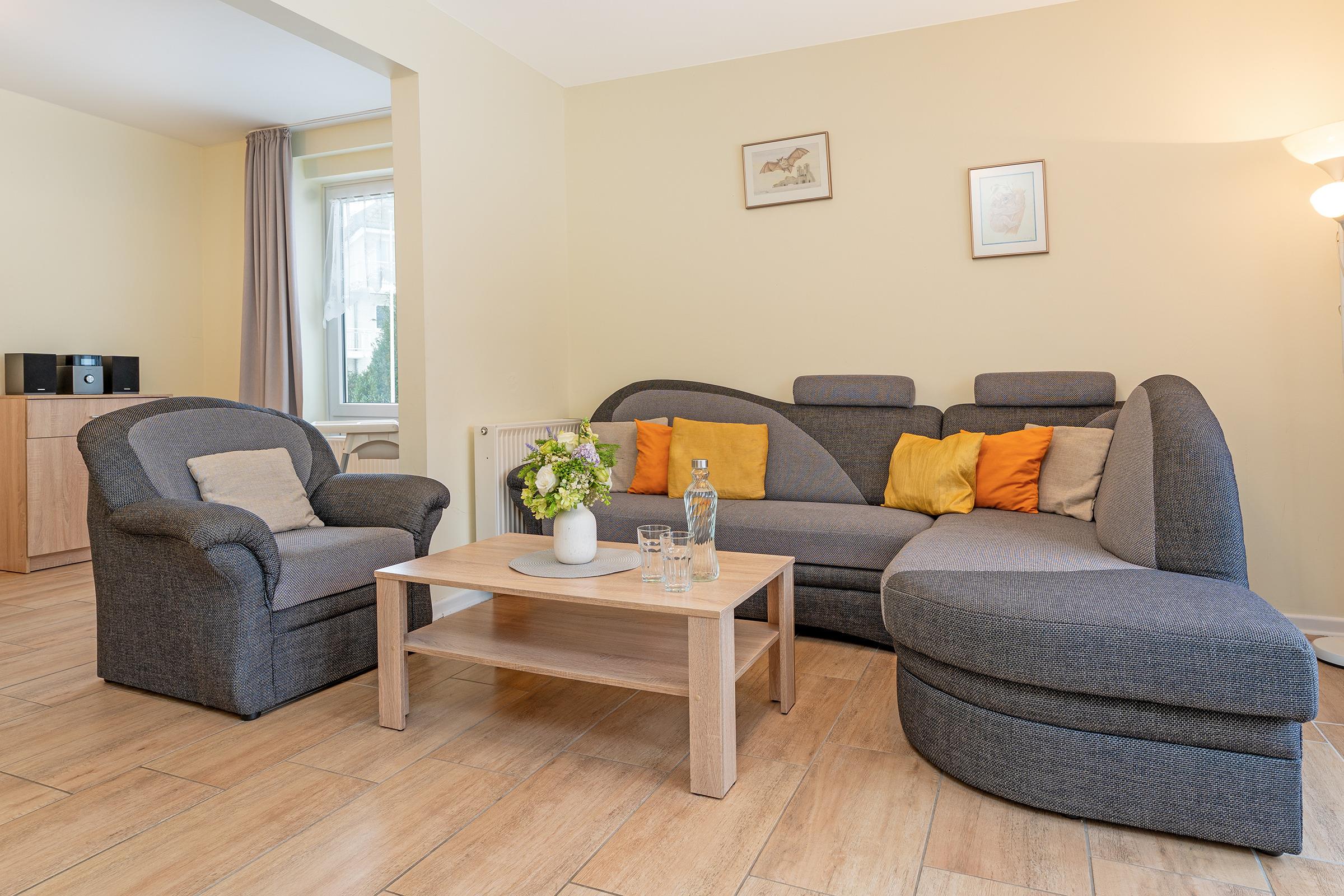 Der helle Wohnbereich lädt mit gemütlicher Couchgarnitur, Fernseher und Zugang zur Terrasse und Gemeinschaftsgarten zum Entspannen ein. Auf der möblierte Terrasse oder auch auf dem Balkon können Sie sonnige Stunden genießen und den Tag entspannt ausklingen lassen. Die Küche ist vollständig ausgestattet mit Backofen, Ceranfeld, Geschirrspüler, Kühlschrank mit Gefrierfach, Mikrowelle, Kaffeemaschine, Wasserkocher und Toaster und bietet zusammen mit dem extra Essbereich den idealen Rahmen für gemeinsame Mahlzeiten. Zwei separate Schlafzimmer sorgen für erholsame Nächte: beide sind mit komfortablen Doppelbetten ausgestattet. Von einem Schlafzimmer gelangt man auf den Balkon. Eine weitere Schlafmöglichkeit bietet das Schlafsofa im Wohnzimmer. Das Badezimmer verfügt über eine Dusche, WC und Kosmetikspiegel. Für Familien stehen sowohl ein Kinderreisebett als auch ein Hochstuhl zur Verfügung.