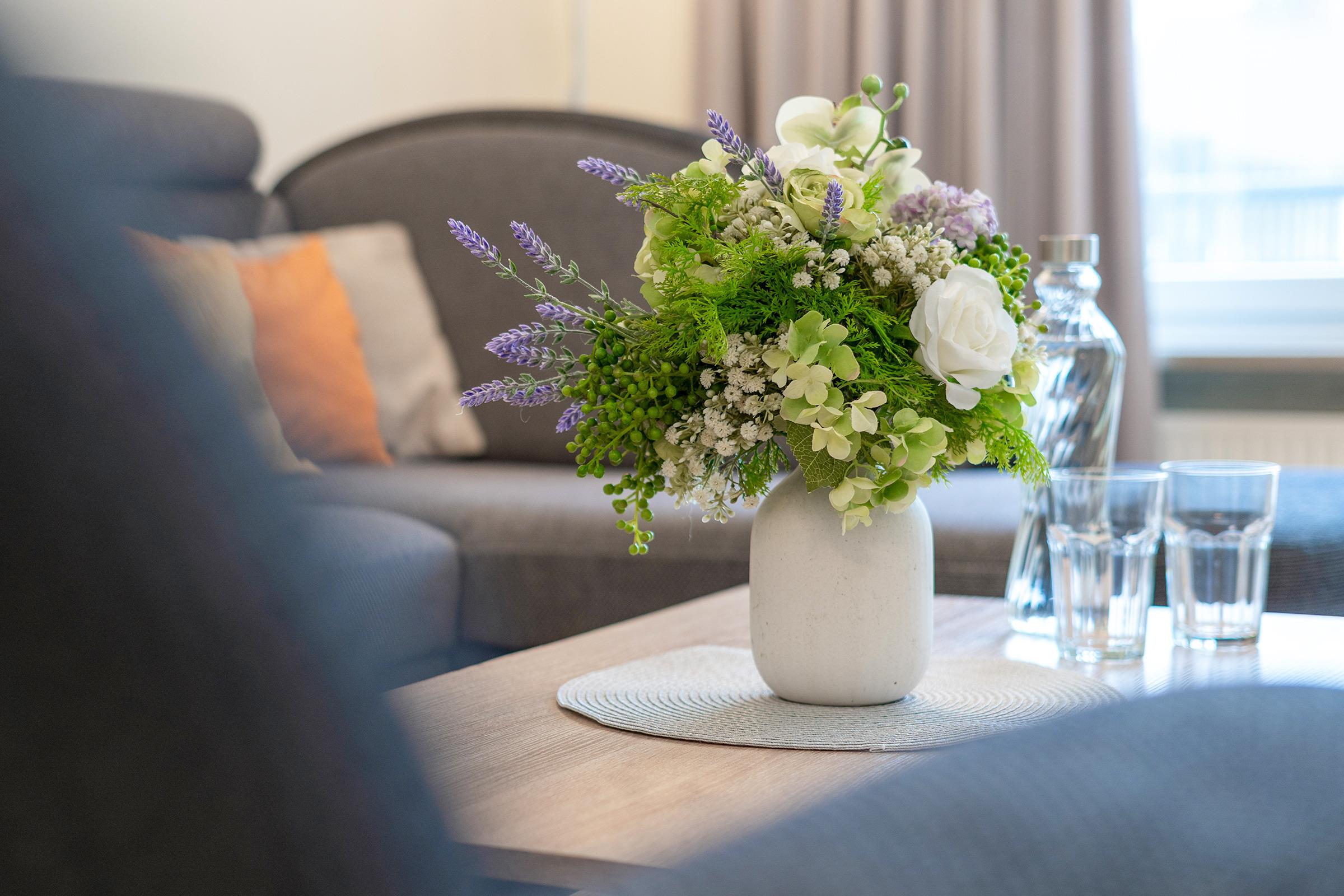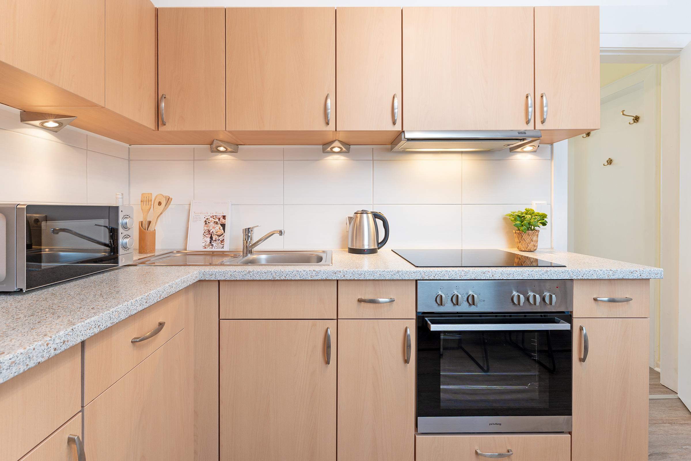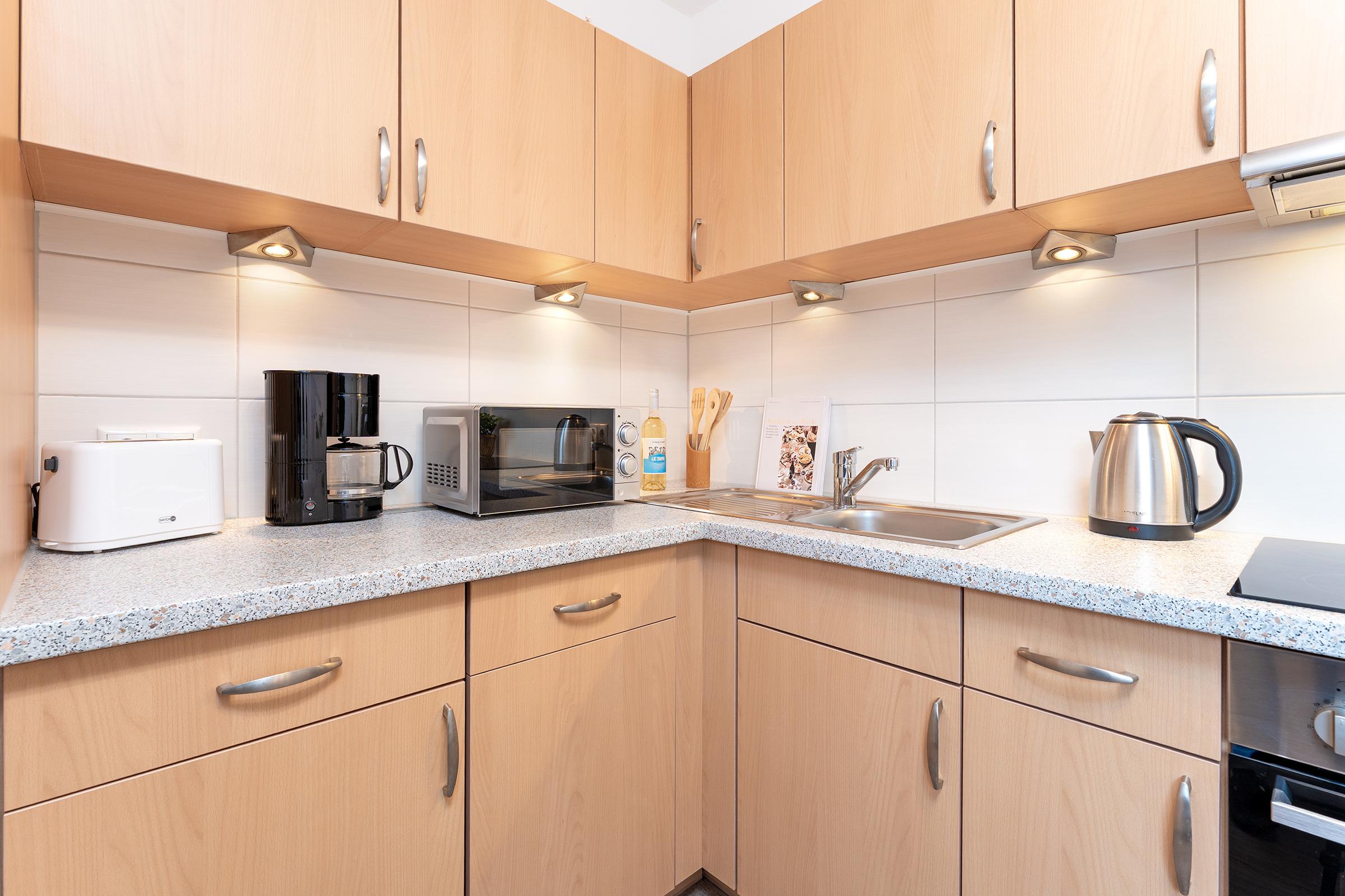 Der helle Wohnbereich lädt mit gemütlicher Couchgarnitur, Fernseher und Zugang zur Terrasse und Gemeinschaftsgarten zum Entspannen ein. Auf der möblierte Terrasse oder auch auf dem Balkon können Sie sonnige Stunden genießen und den Tag entspannt ausklingen lassen. Die Küche ist vollständig ausgestattet mit Backofen, Ceranfeld, Geschirrspüler, Kühlschrank mit Gefrierfach, Mikrowelle, Kaffeemaschine, Wasserkocher und Toaster und bietet zusammen mit dem extra Essbereich den idealen Rahmen für gemeinsame Mahlzeiten. Zwei separate Schlafzimmer sorgen für erholsame Nächte: beide sind mit komfortablen Doppelbetten ausgestattet. Von einem Schlafzimmer gelangt man auf den Balkon. Eine weitere Schlafmöglichkeit bietet das Schlafsofa im Wohnzimmer. Das Badezimmer verfügt über eine Dusche, WC und Kosmetikspiegel. Für Familien stehen sowohl ein Kinderreisebett als auch ein Hochstuhl zur Verfügung.