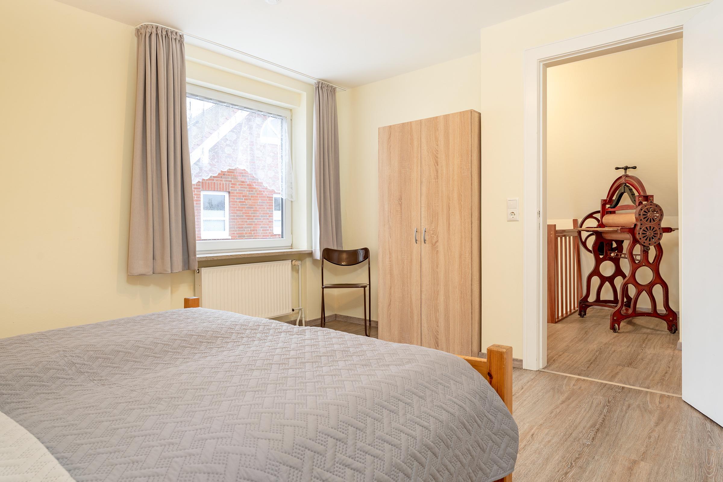 Schlafzimmer 2 (1. OG): 1 Doppelbett (2x 90 x 200 cm), Kleiderschrank, Verdunkelung: Gardinen, Platz für ein Babybett