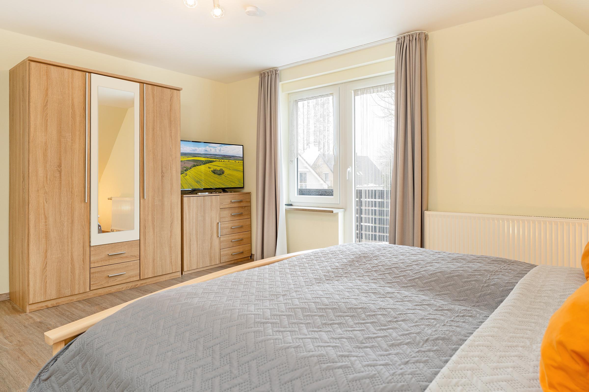 Schlafzimmer 1 (EG): 1 Doppelbett (2x 90 x 200 cm), Kleiderschrank, TV, Verdunkelung: Gardinen, Platz für ein Babybett