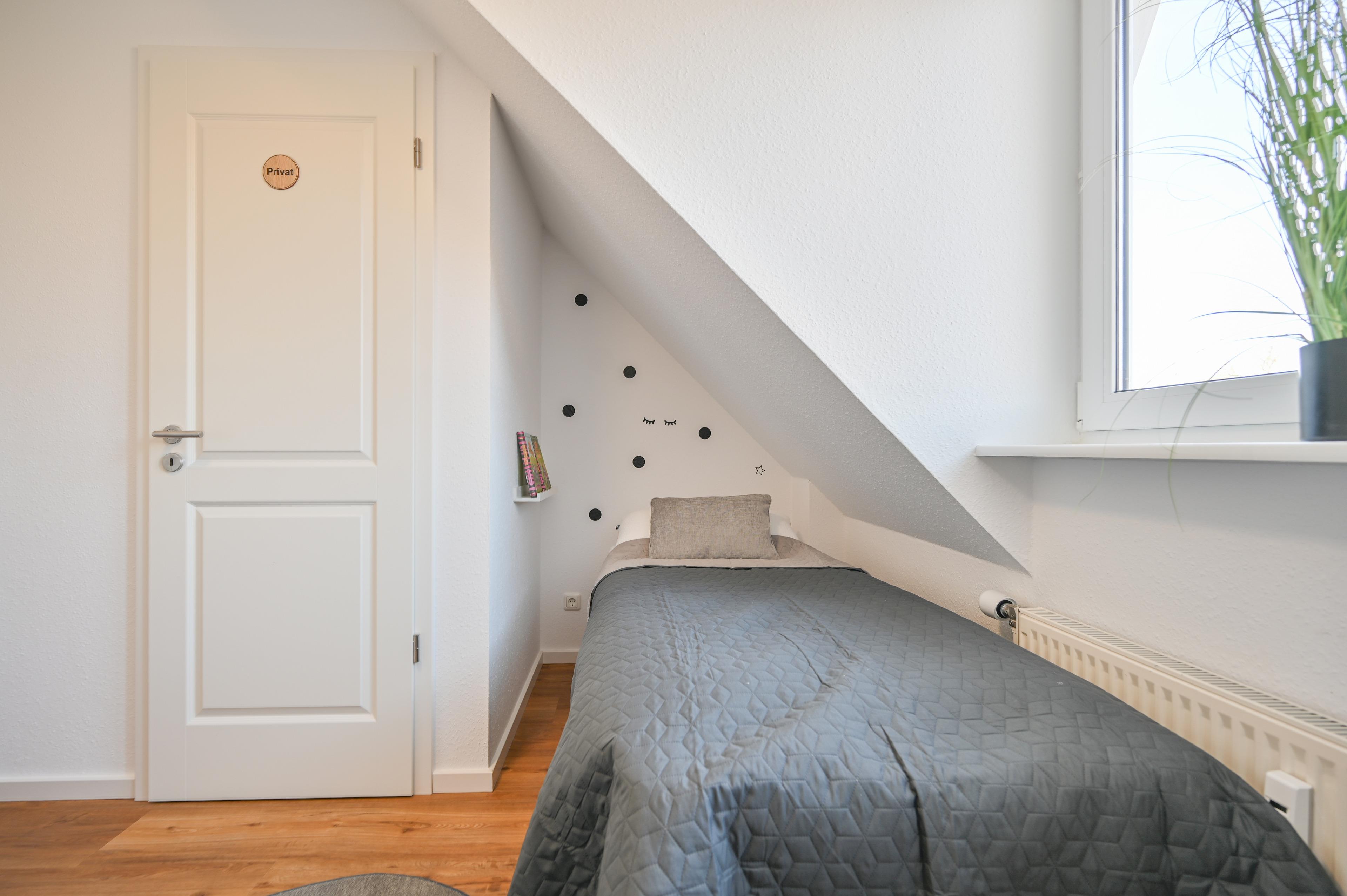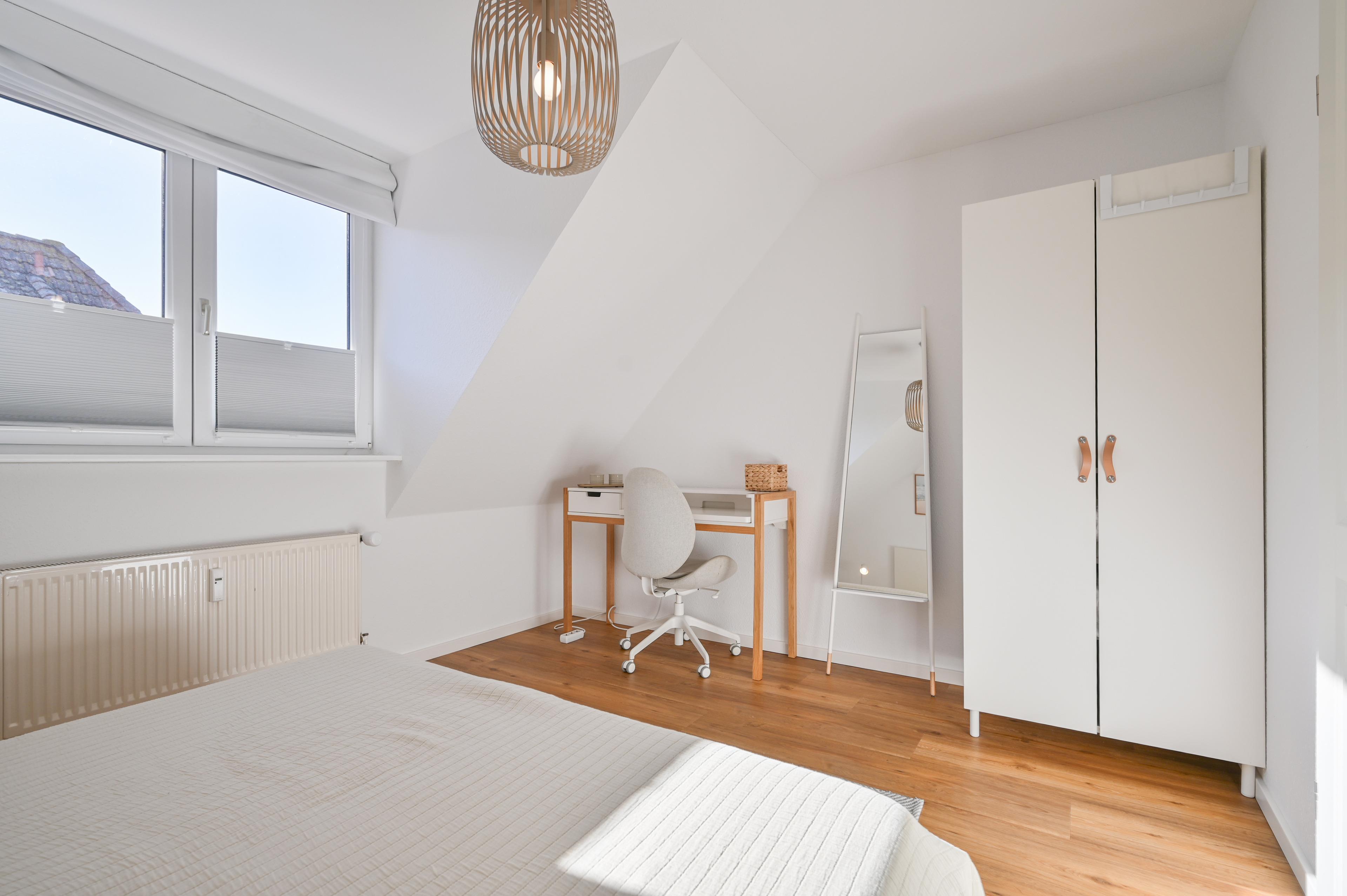 Im Obergeschoss befinden sich zwei Schlafzimmer und ein neu gestaltetes Bad mit