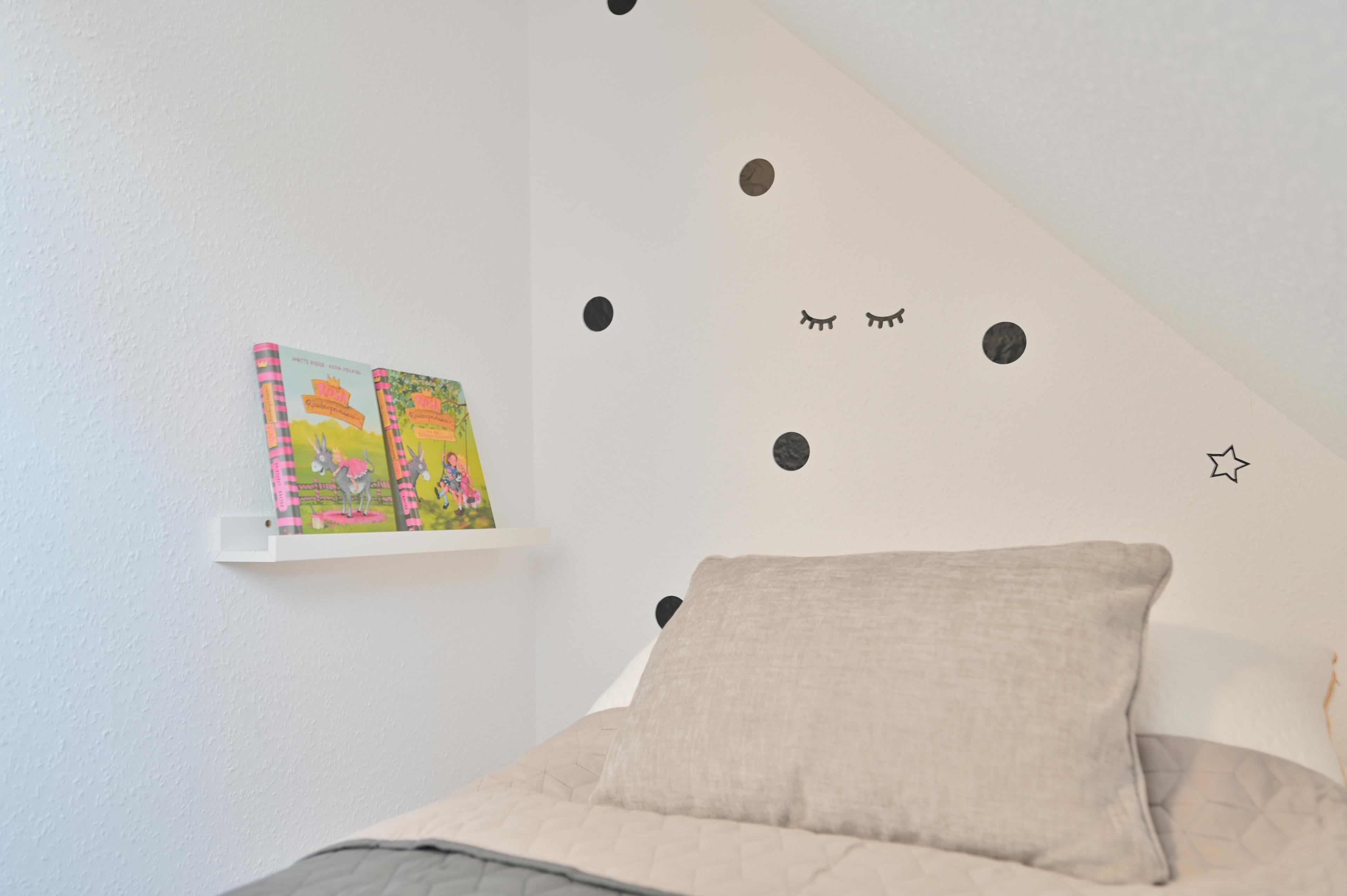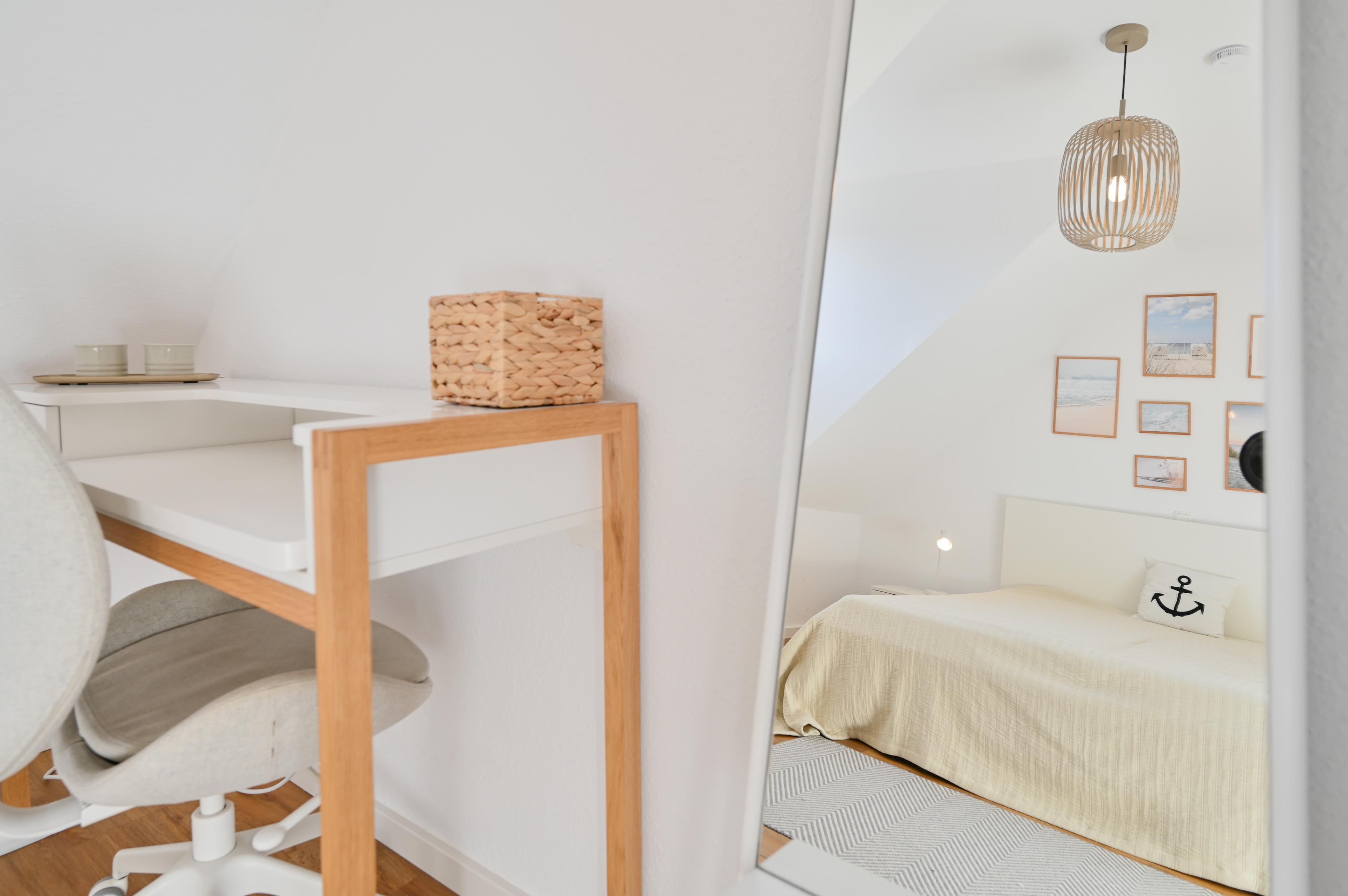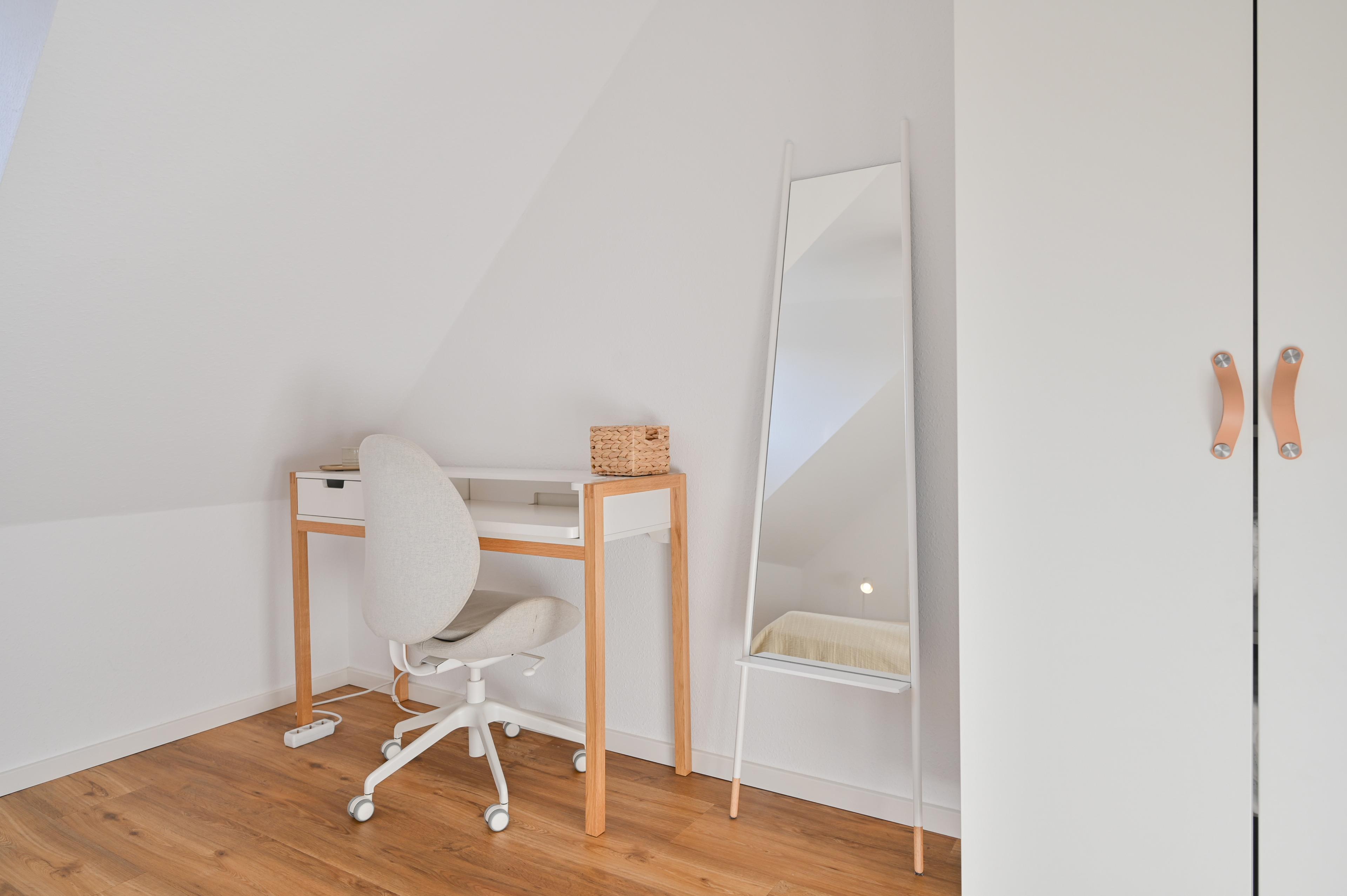 Kleiderschrank und Ganzkörperspiegel. Das zweite Zimmer ist liebevoll gestaltet,