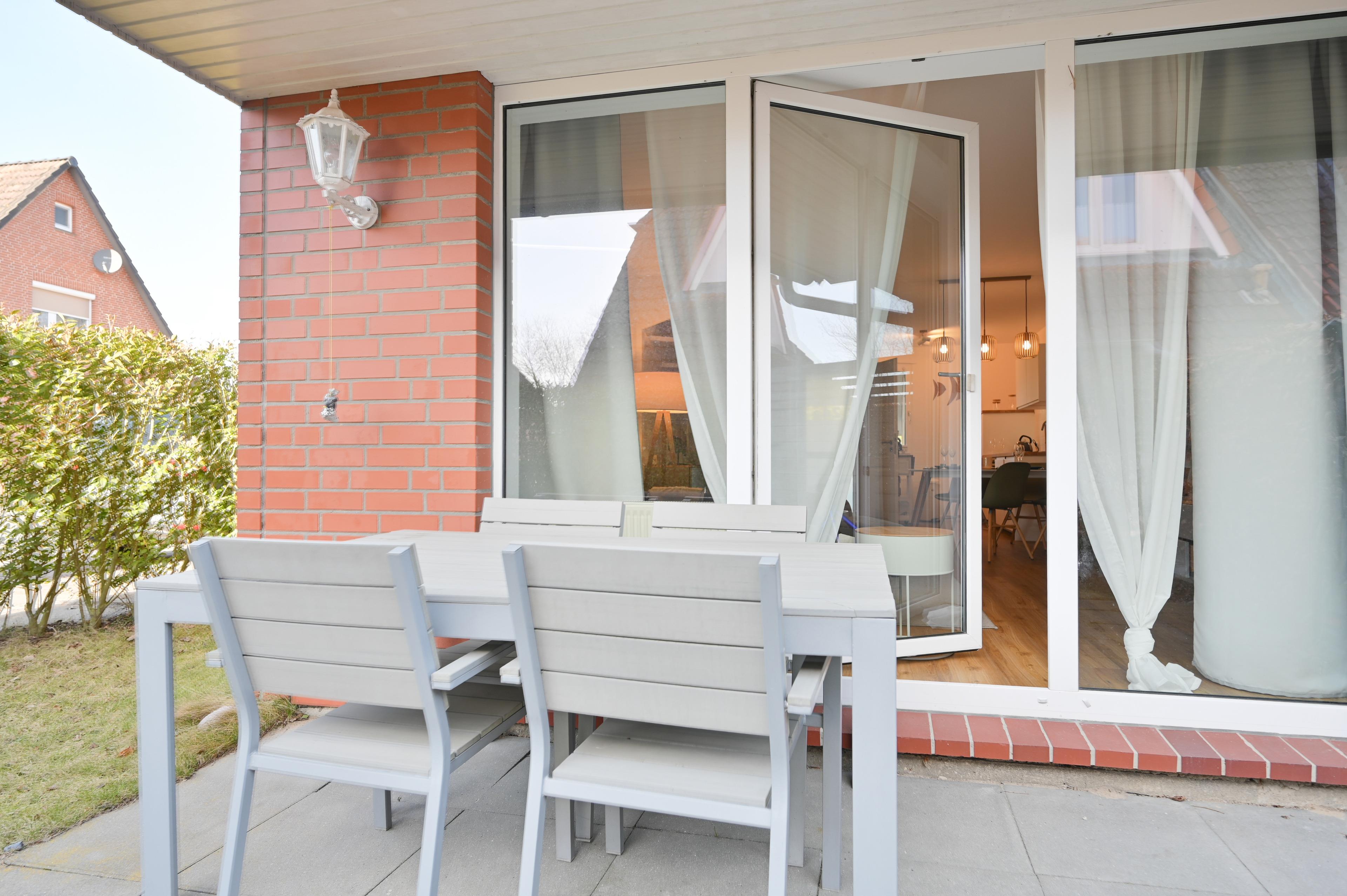Auf der Terrasse laden Tisch und Stühle zum Draußensitzen und Durchatmen ein.