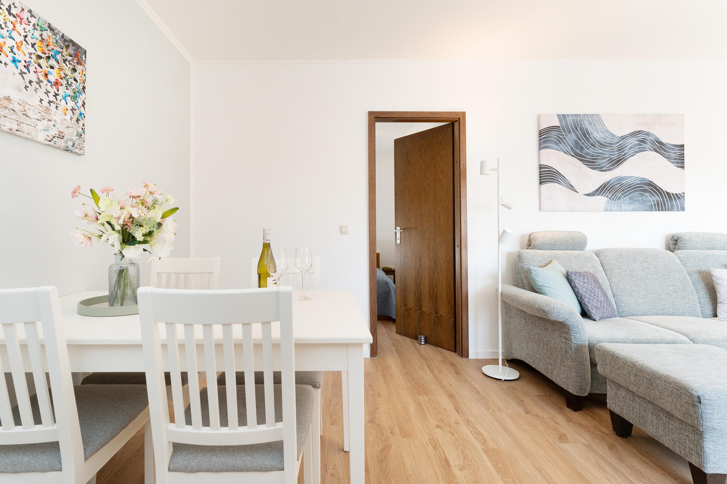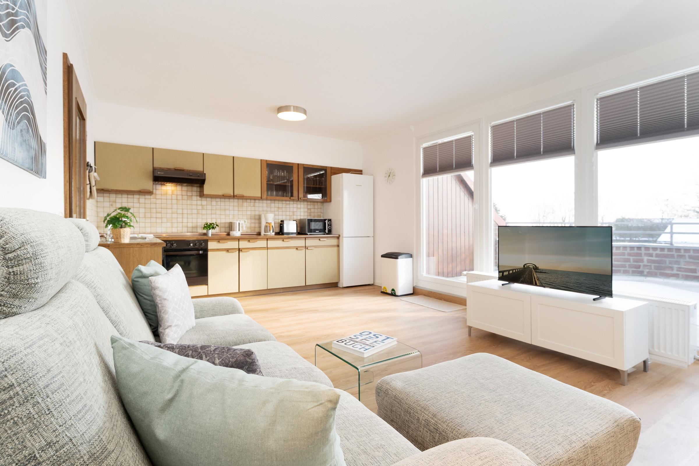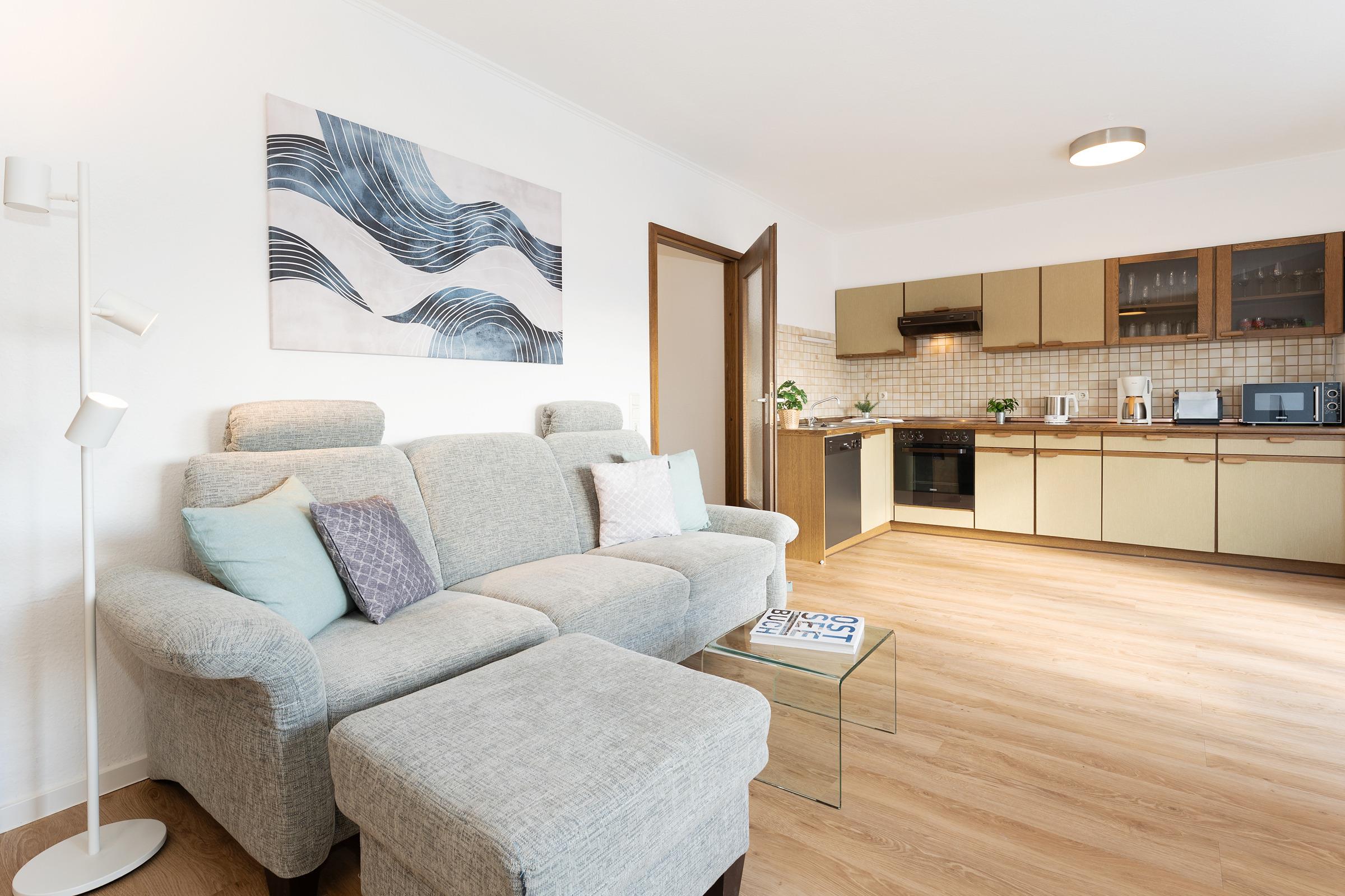Der Rundgang beginnt im gemütlichen Wohnbereich, der mit einem Fernseher, DVD-Player, Radio und Hifi-Anlage zu entspannten Stunden einlädt. Von hier gelangen Sie auf die schönen Süd-Balkon, der mit Gartenmöbeln ausgestattet ist und dank ausfahrbarer Markise zum Verweilen im Freien einlädt – Grillen ist allerdings nicht gestattet. Weiter geht es in die moderne Küchenzeile mit Geschirrspülmaschine, Kühlschrank, Mikrowelle, Toaster sowie Kaffeemaschine. Der angrenzende Essbereich bietet Platz für gemeinsame Mahlzeiten.