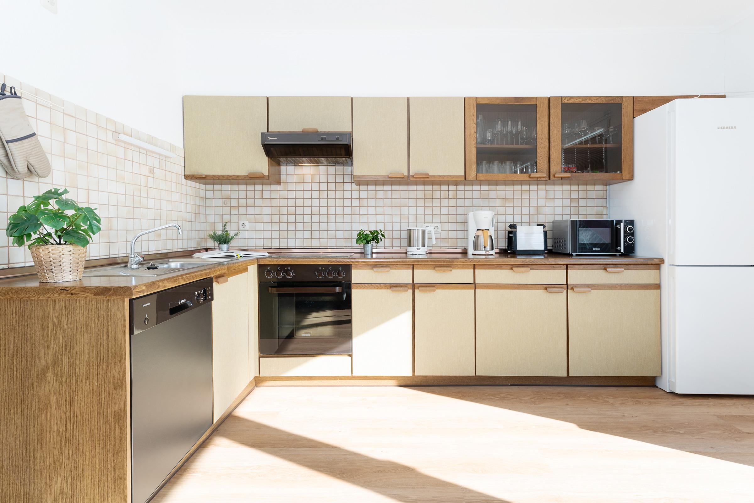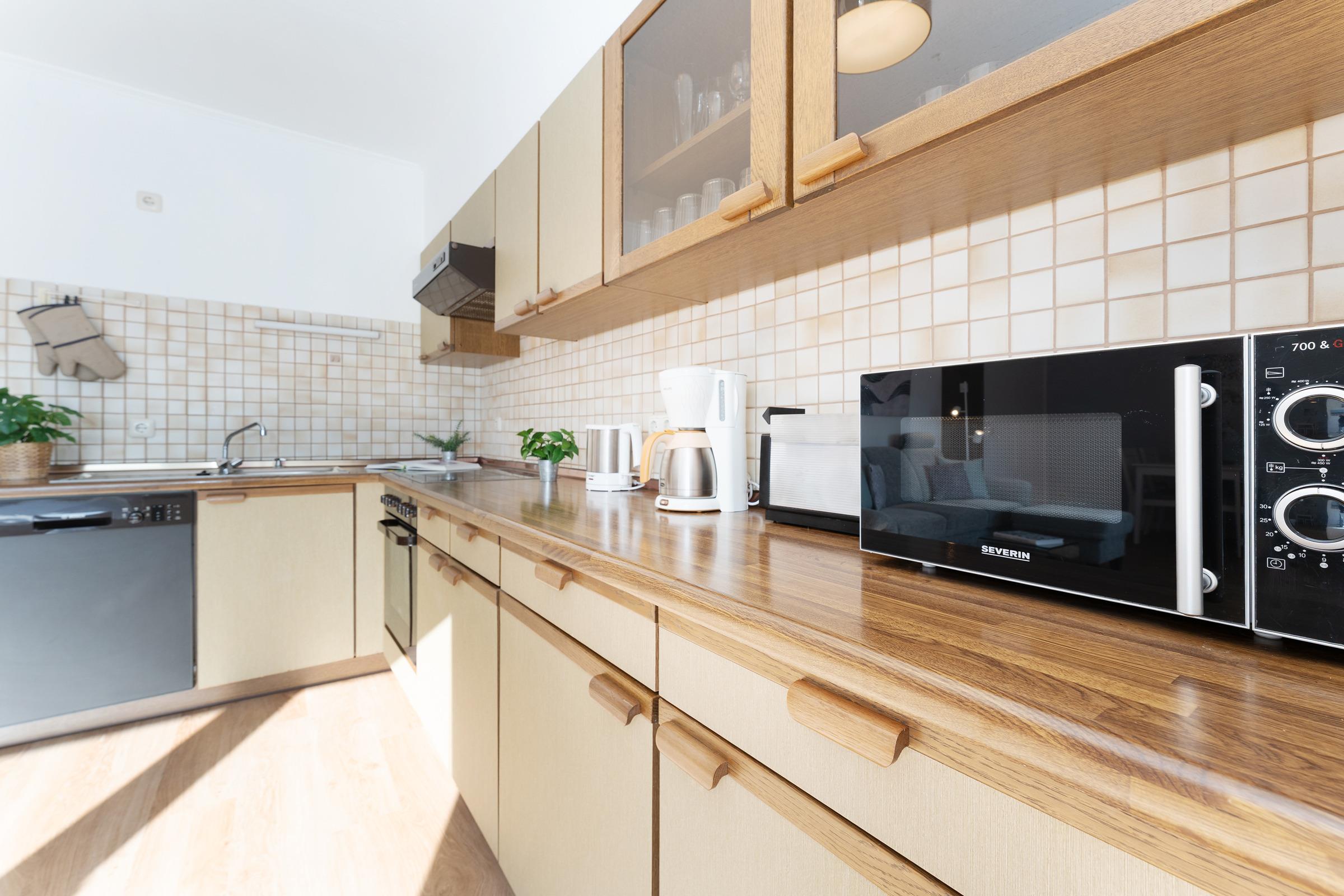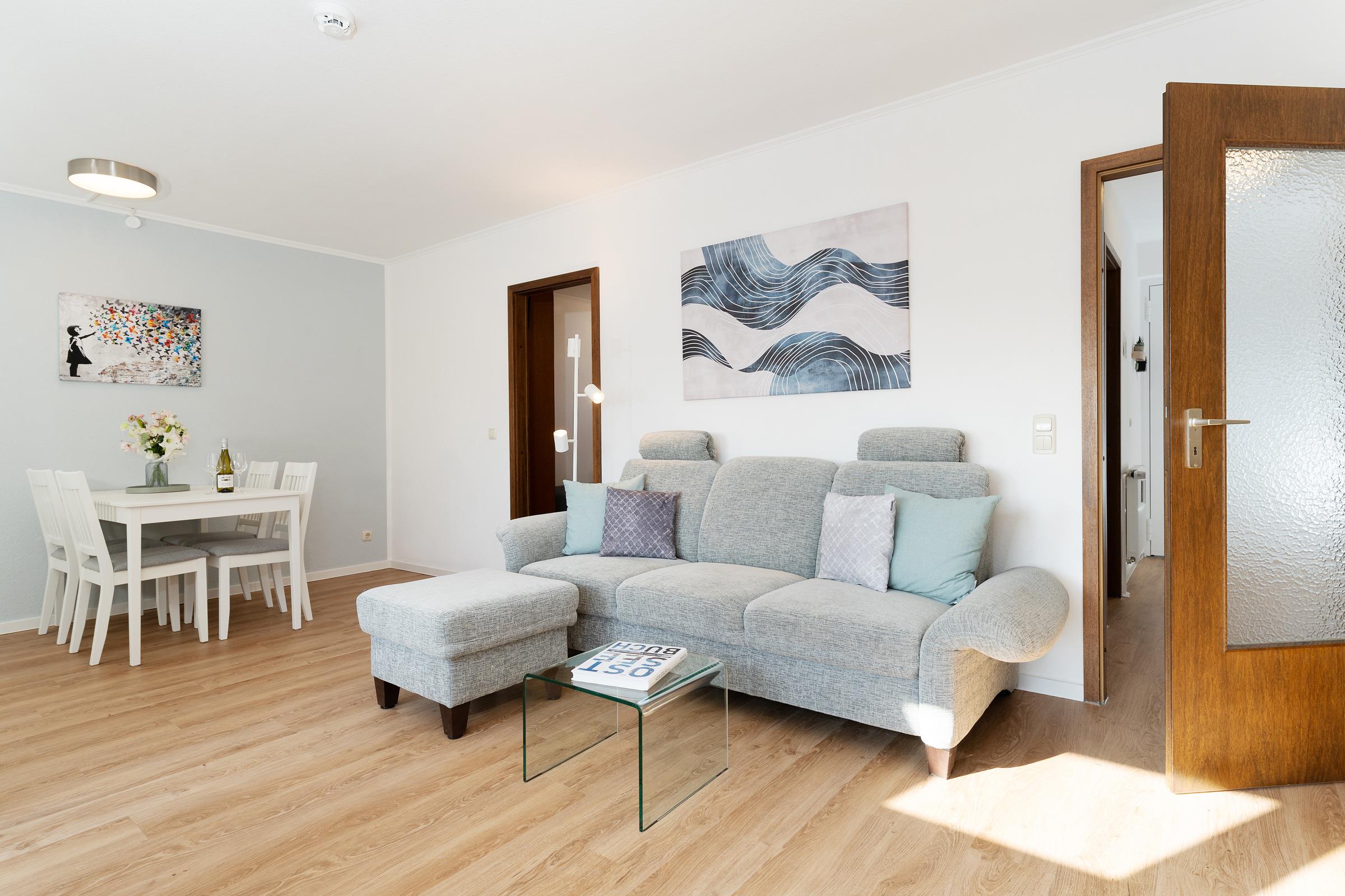 Der Rundgang beginnt im gemütlichen Wohnbereich, der mit einem Fernseher, DVD-Player, Radio und Hifi-Anlage zu entspannten Stunden einlädt. Von hier gelangen Sie auf die schönen Süd-Balkon, der mit Gartenmöbeln ausgestattet ist und dank ausfahrbarer Markise zum Verweilen im Freien einlädt – Grillen ist allerdings nicht gestattet. Weiter geht es in die moderne Küchenzeile mit Geschirrspülmaschine, Kühlschrank, Mikrowelle, Toaster sowie Kaffeemaschine. Der angrenzende Essbereich bietet Platz für gemeinsame Mahlzeiten.