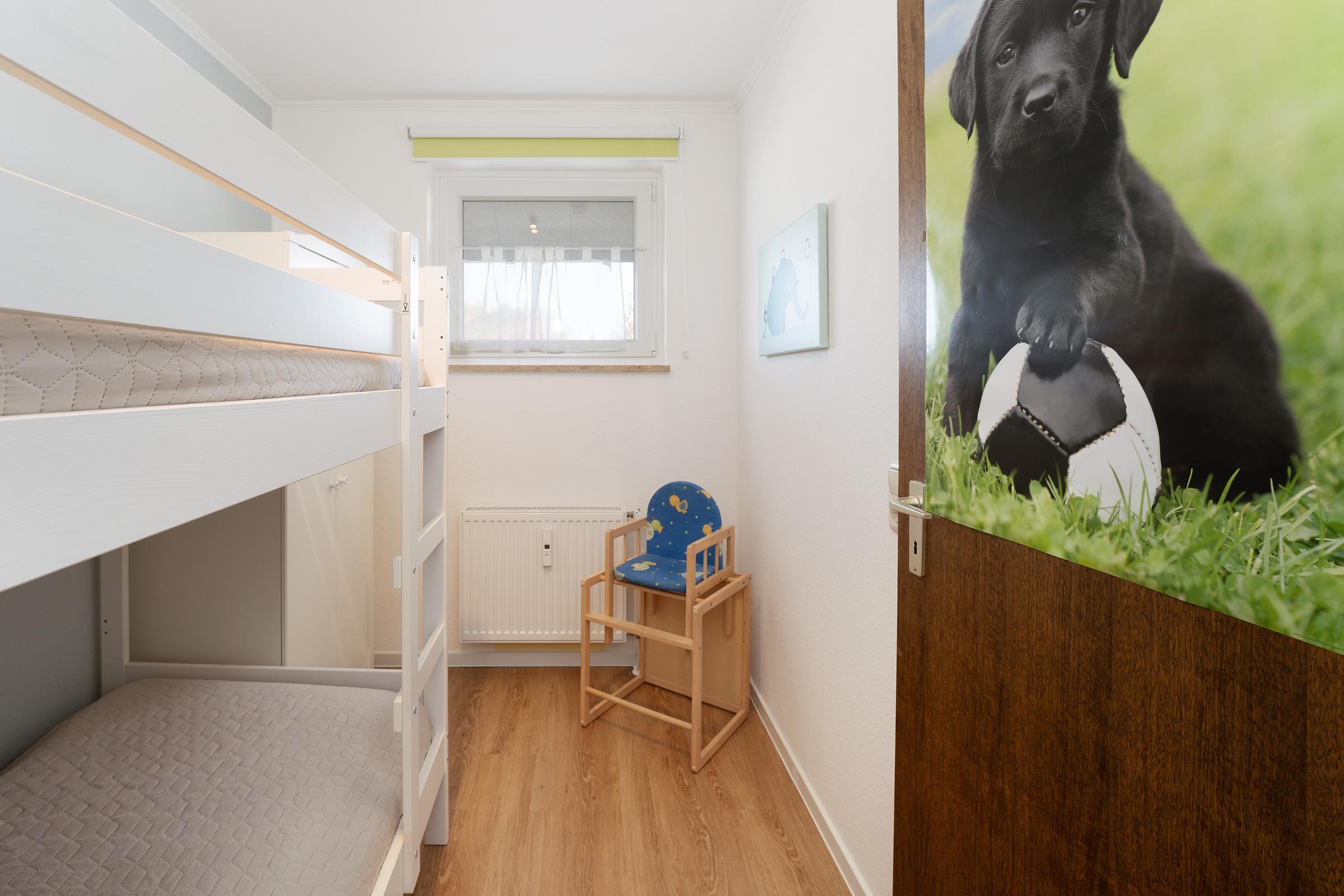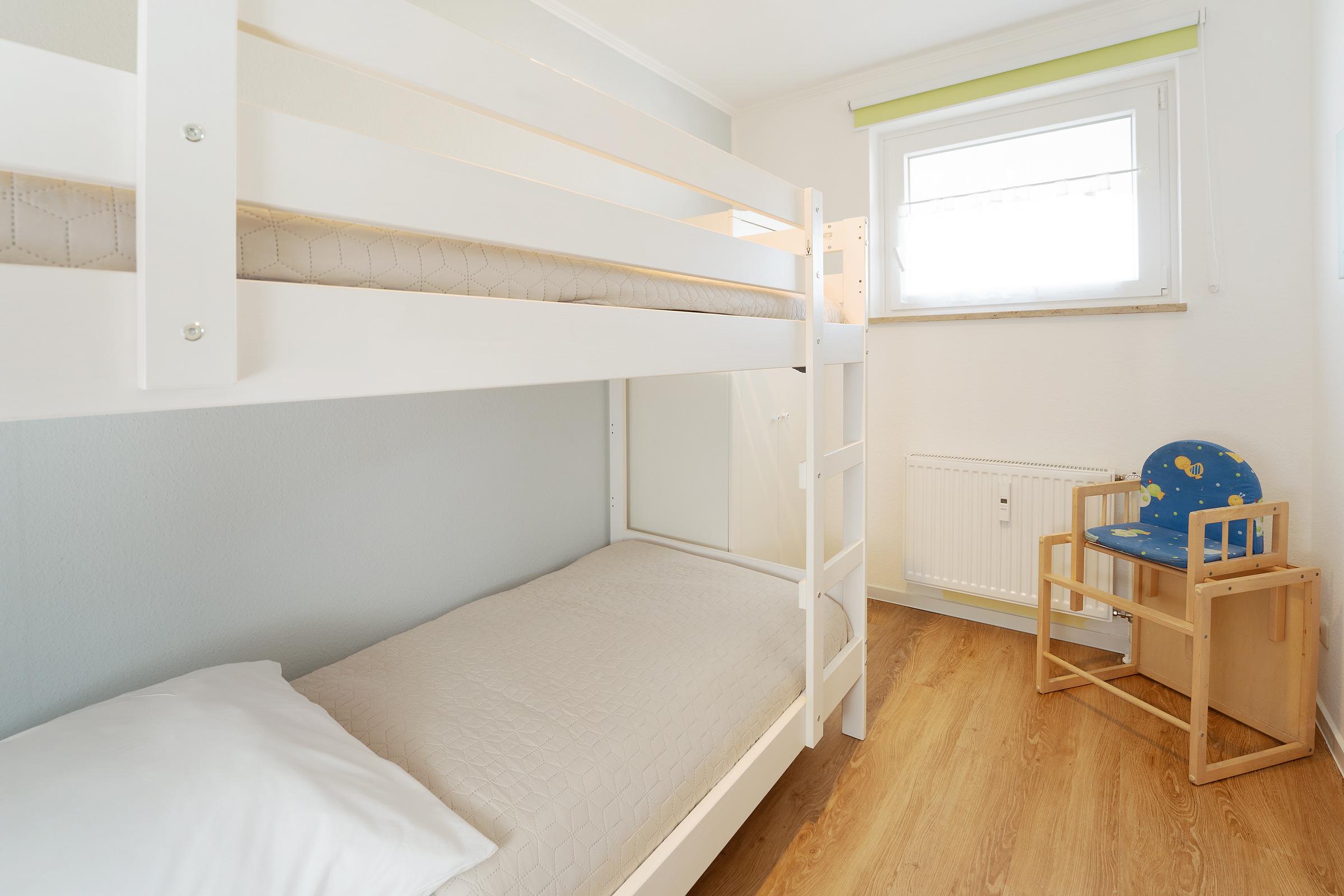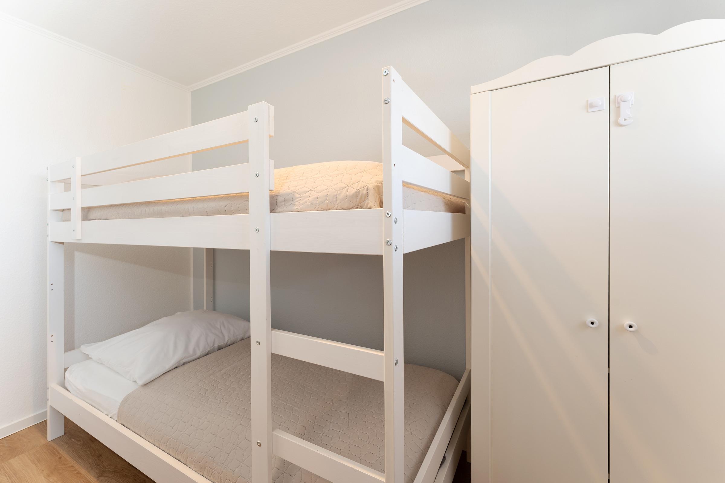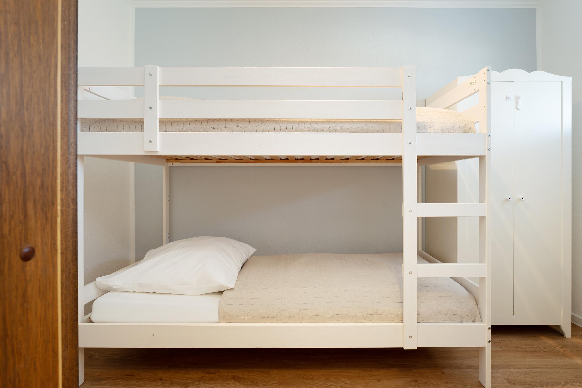 Schlafzimmer 2: 1 Doppel-/ Etagenbett (2x 90 x 200 cm), Kleiderschrank, Verdunkelung: Jalousien, Platz für ein Babybett vorhanden