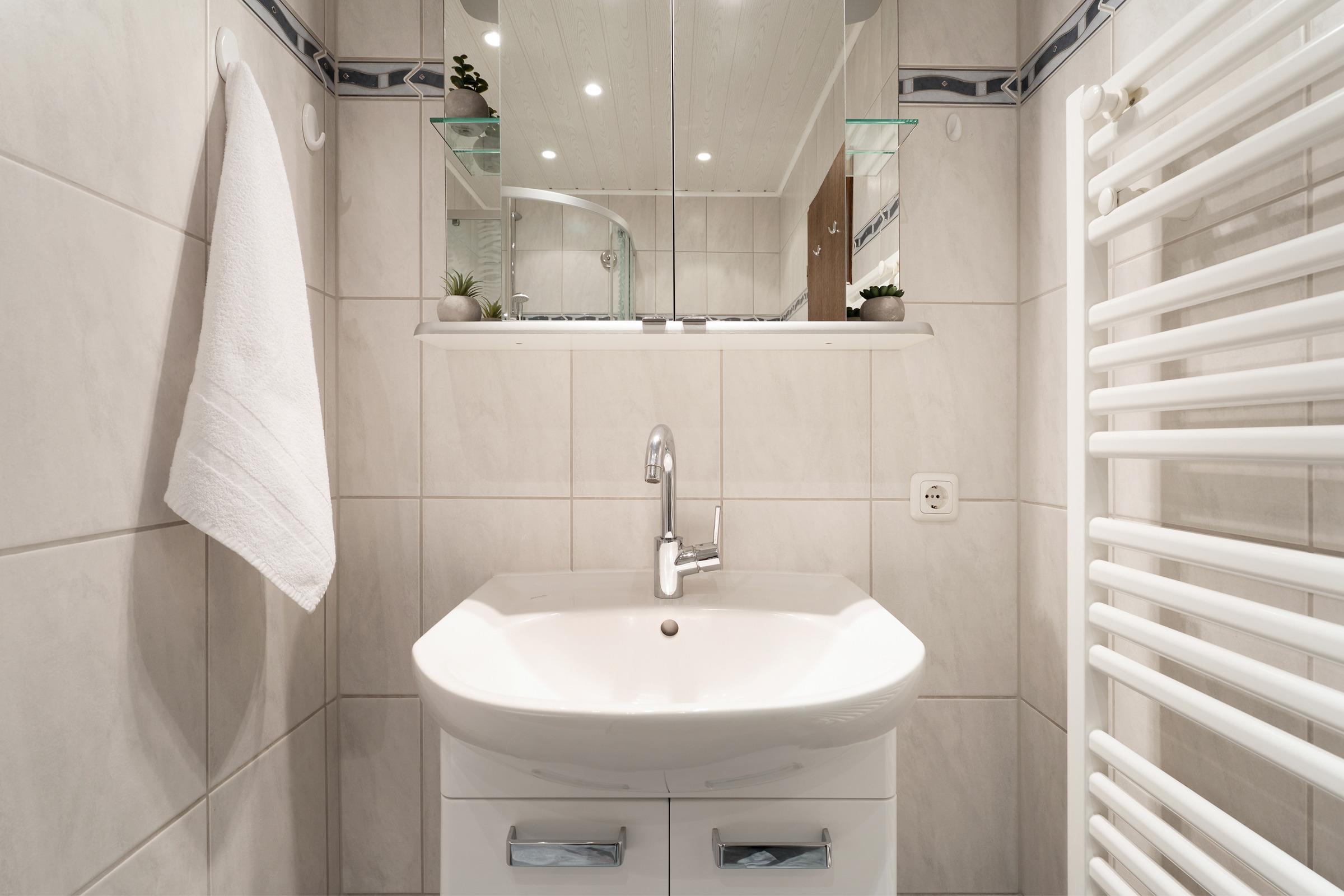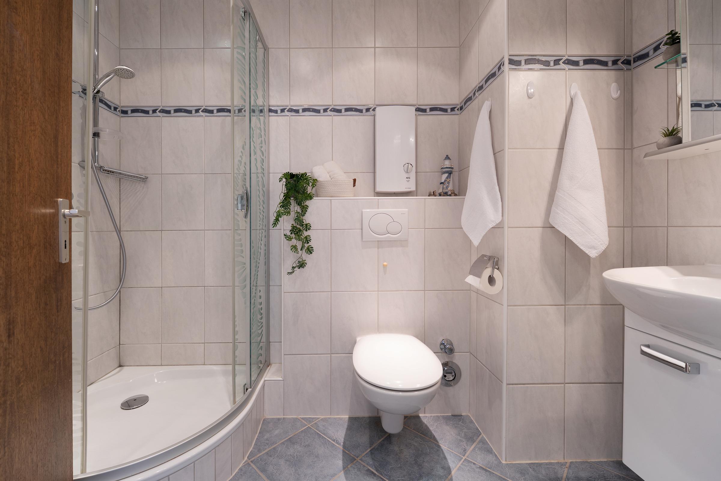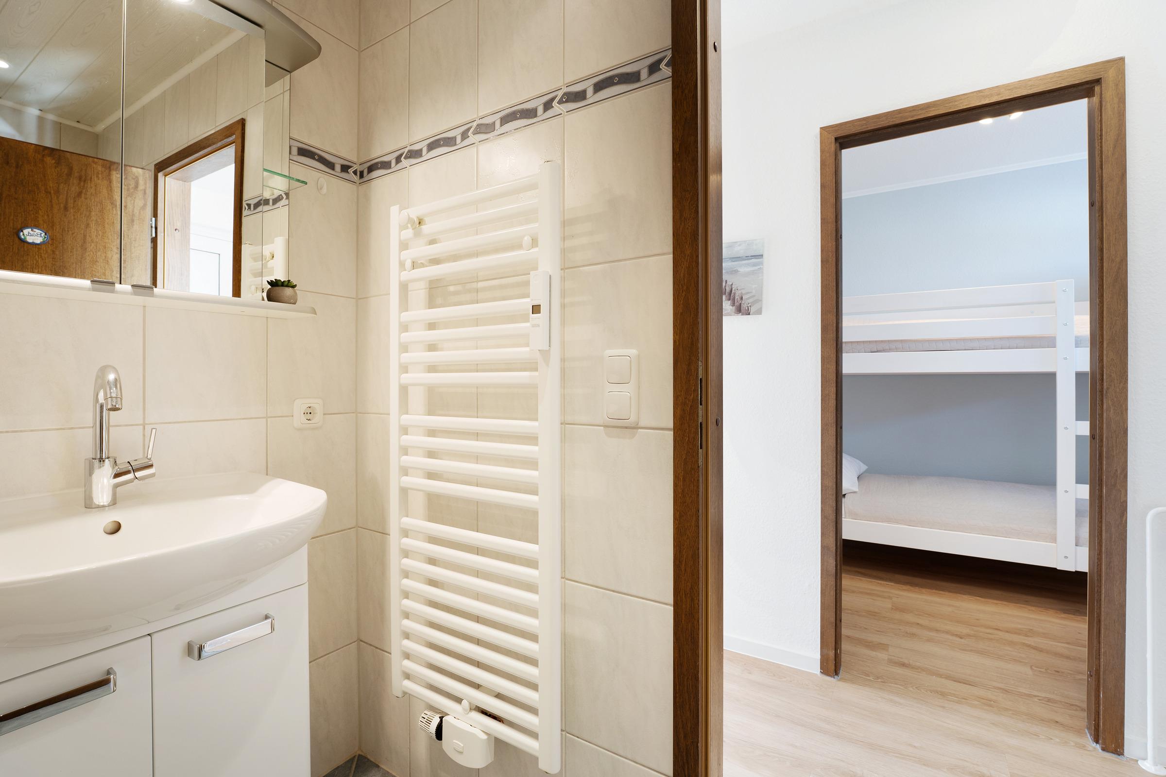 Das erste Schlafzimmer verfügt über ein komfortables Doppelbett, während im zweiten Schlafzimmer ein Etagenbett bereitsteht – ideal für Familien. Verdunklungsmöglichkeiten sorgen für angenehmen Schlafkomfort. Das großzügige Bad bietet eine Dusche mit einer Einstiegshöhe von 10cm, sowie einen beheizbaren Handtuchhalter.