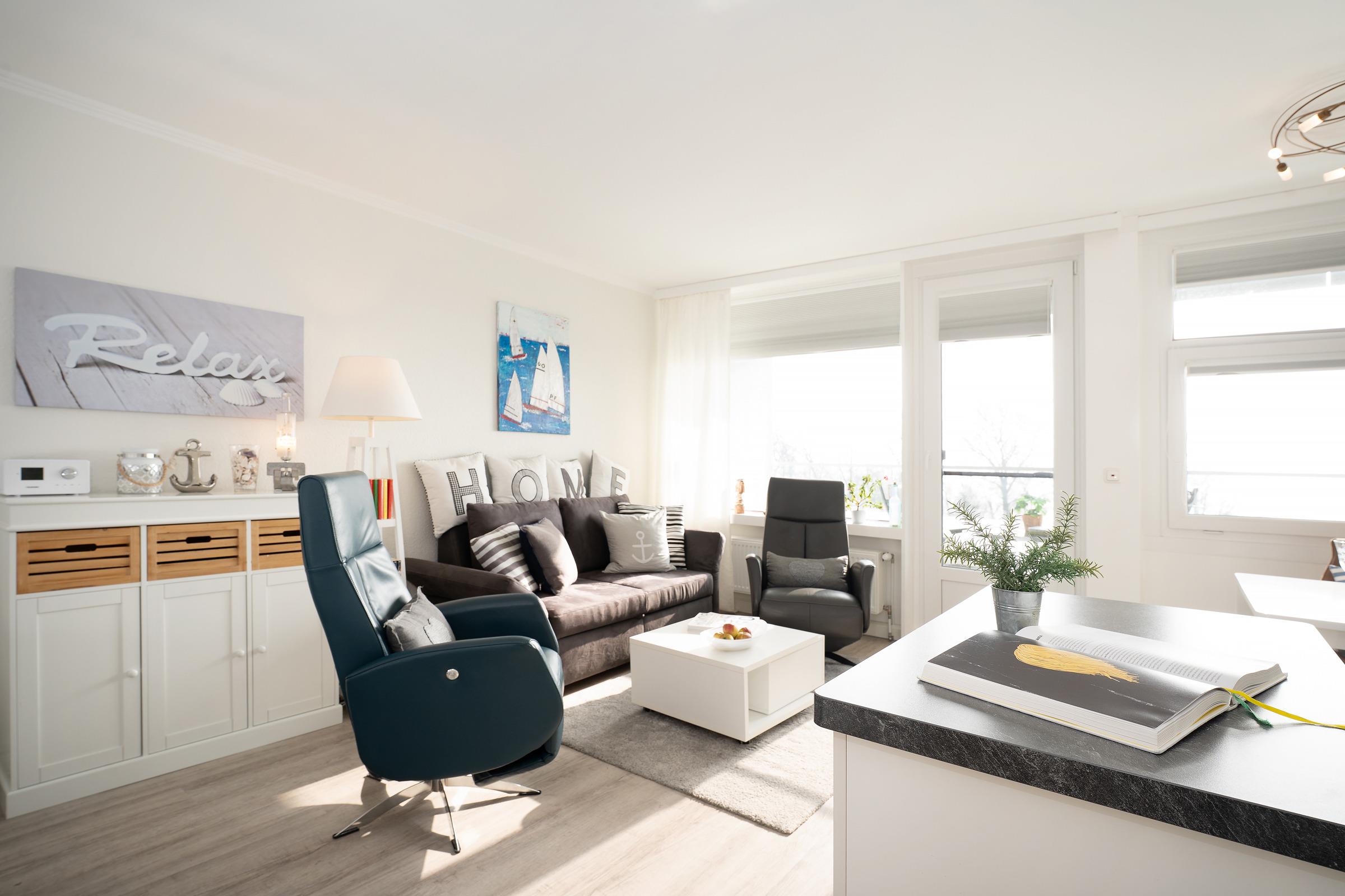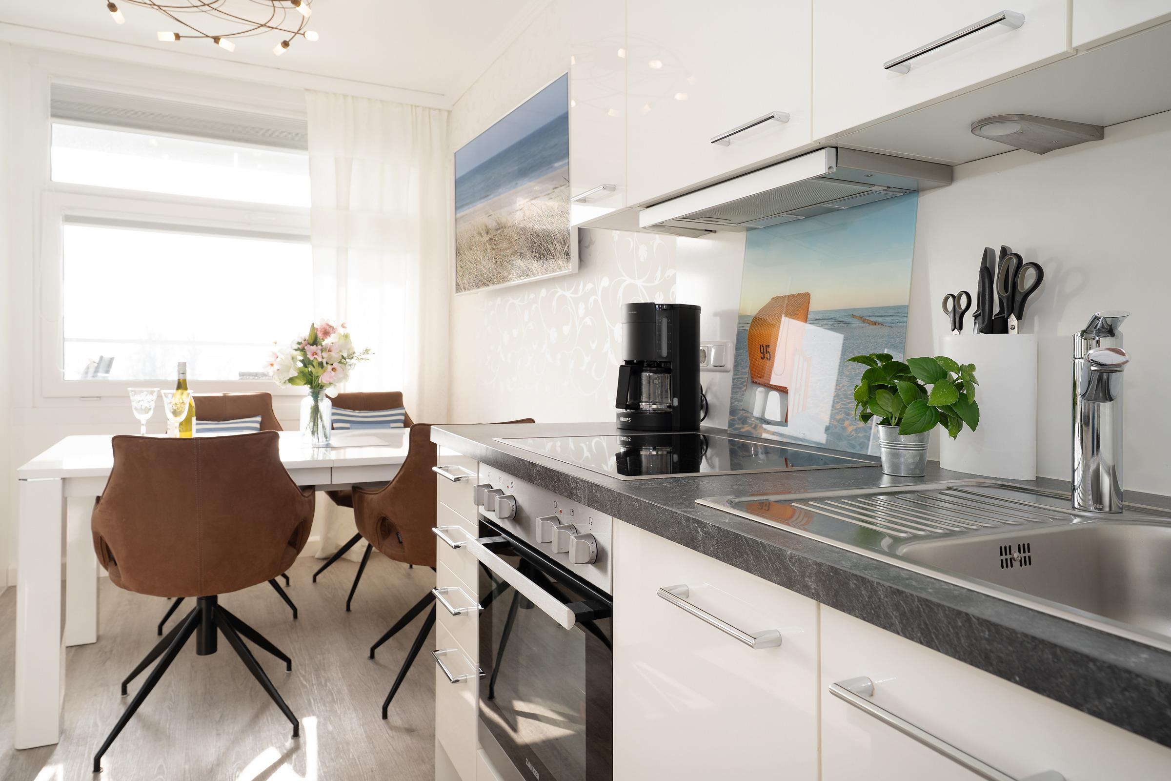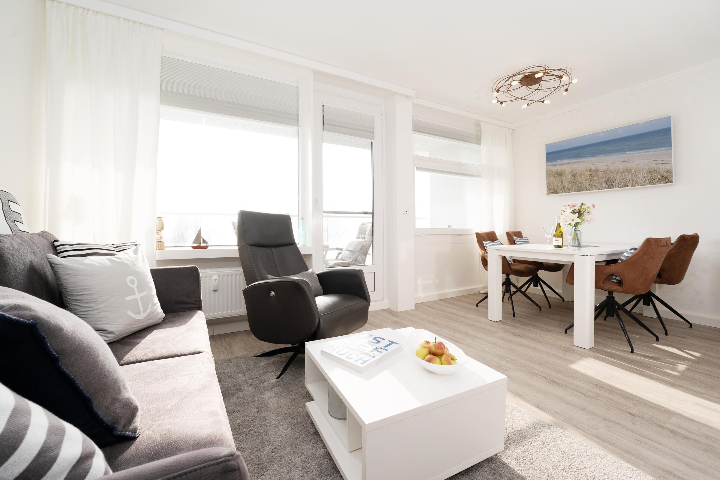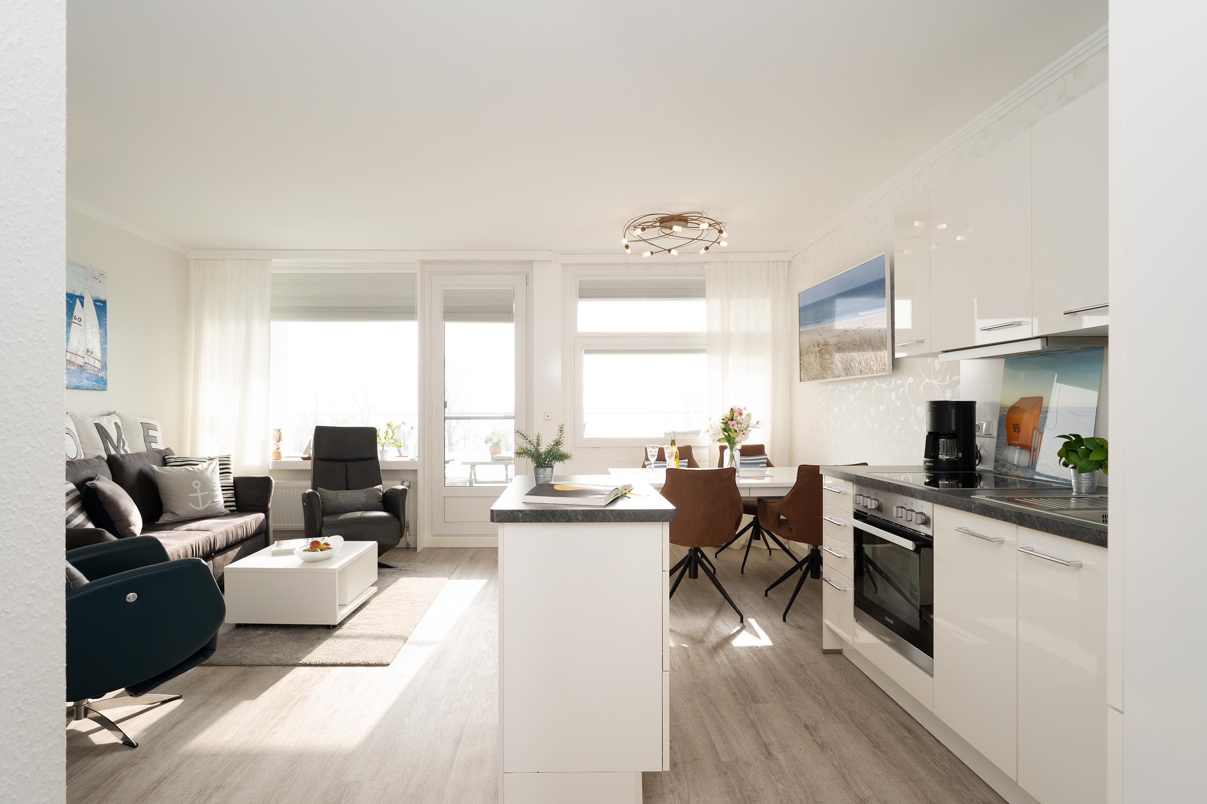 Die Ferienwohnung empfängt Sie mit einem hellen Wohnbereich, der Wohnen, Schlafen und Entspannen harmonisch miteinander verbindet. Ein bequemes Doppelbett sowie eine gemütliche Schlafsofa mit TV laden zu erholsamen Stunden ein. Vom Wohnraum aus gelangen Sie auf den Balkon, auf dem Sie die frische Ostseeluft genießen können. Die integrierte Küchenzeile ist gut ausgestattet und bietet mit Ceranfeld, Backofen, Kühlschrank, Kaffeemaschine, Wasserkocher und weiteren Küchenutensilien alles, was Sie für die Selbstverpflegung benötigen; ein Essplatz ergänzt den Raum ideal. Der Schlafbereich ist offen integriert und sorgt für komfortable Nächte. Das Badezimmer verfügt über Dusche und WC und ist funktional gestaltet.