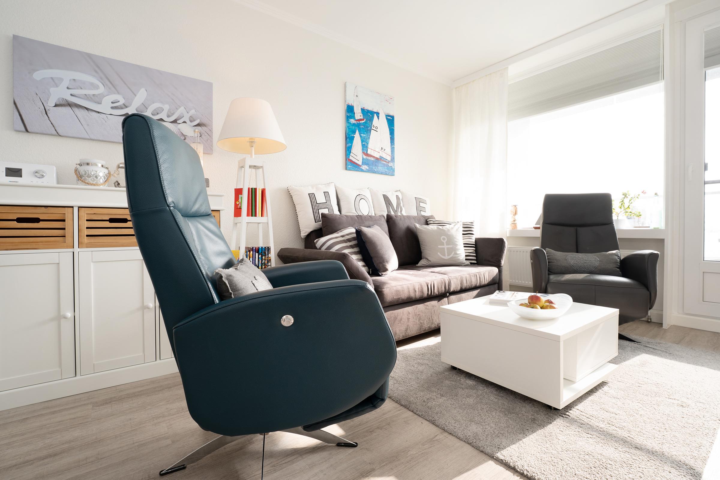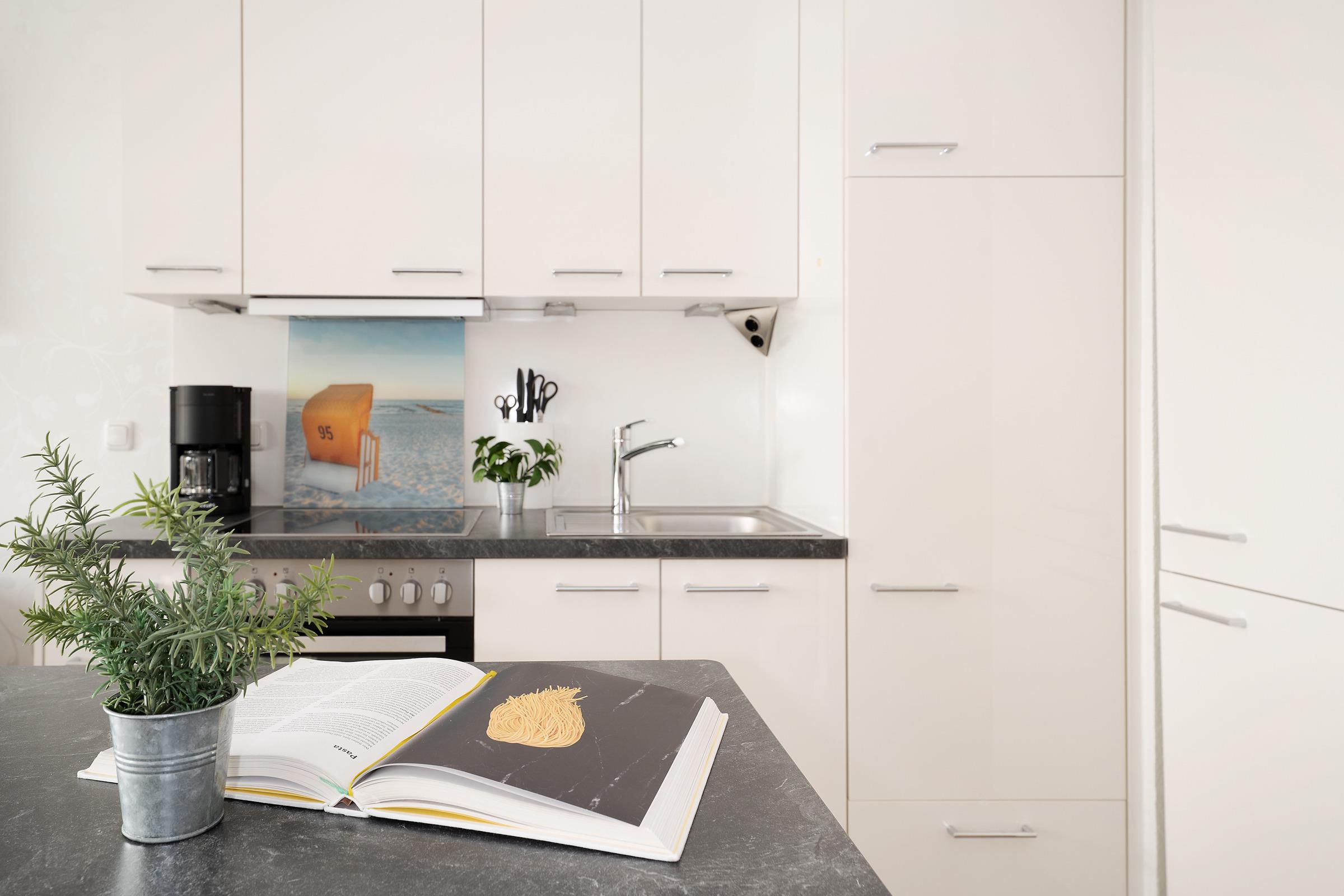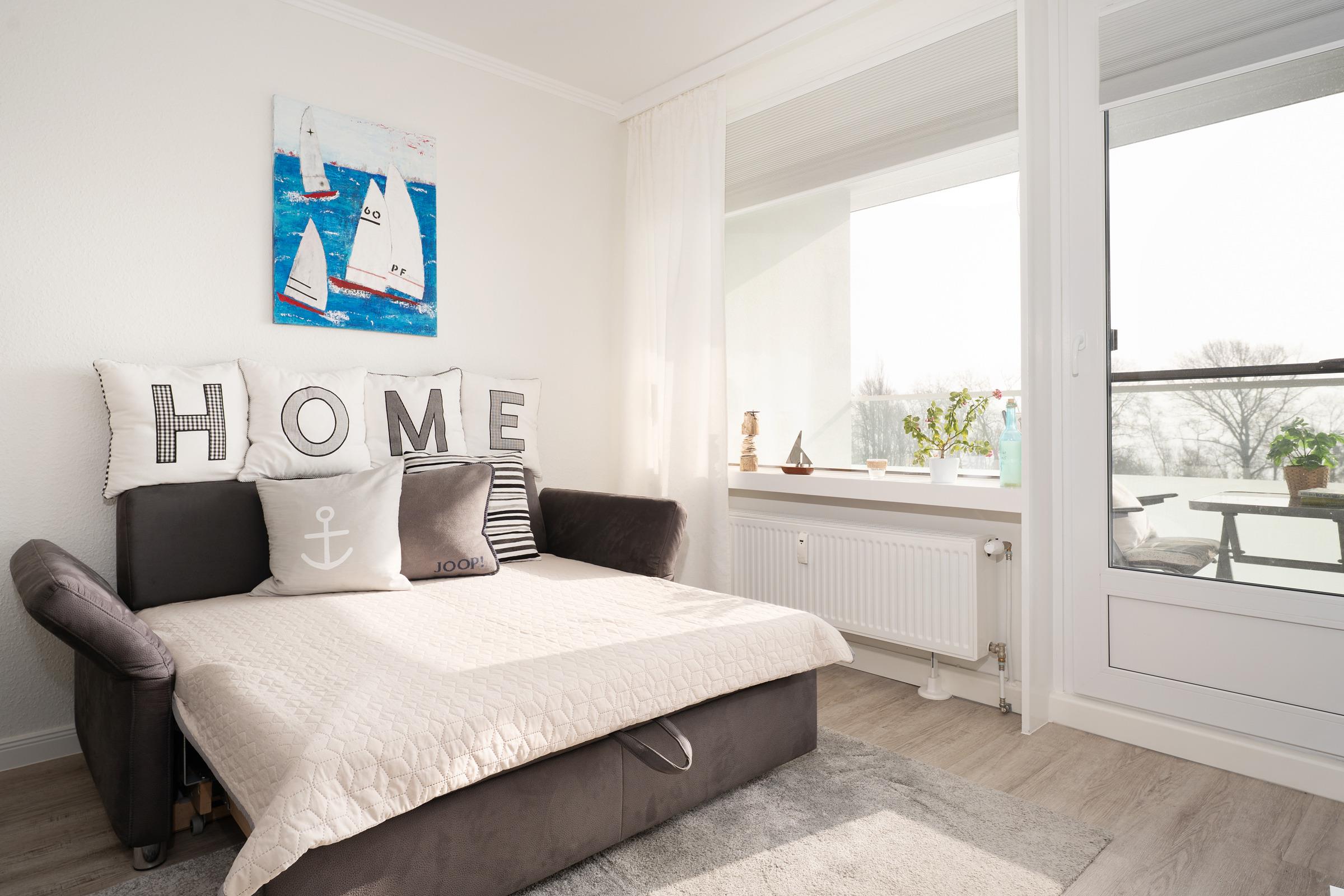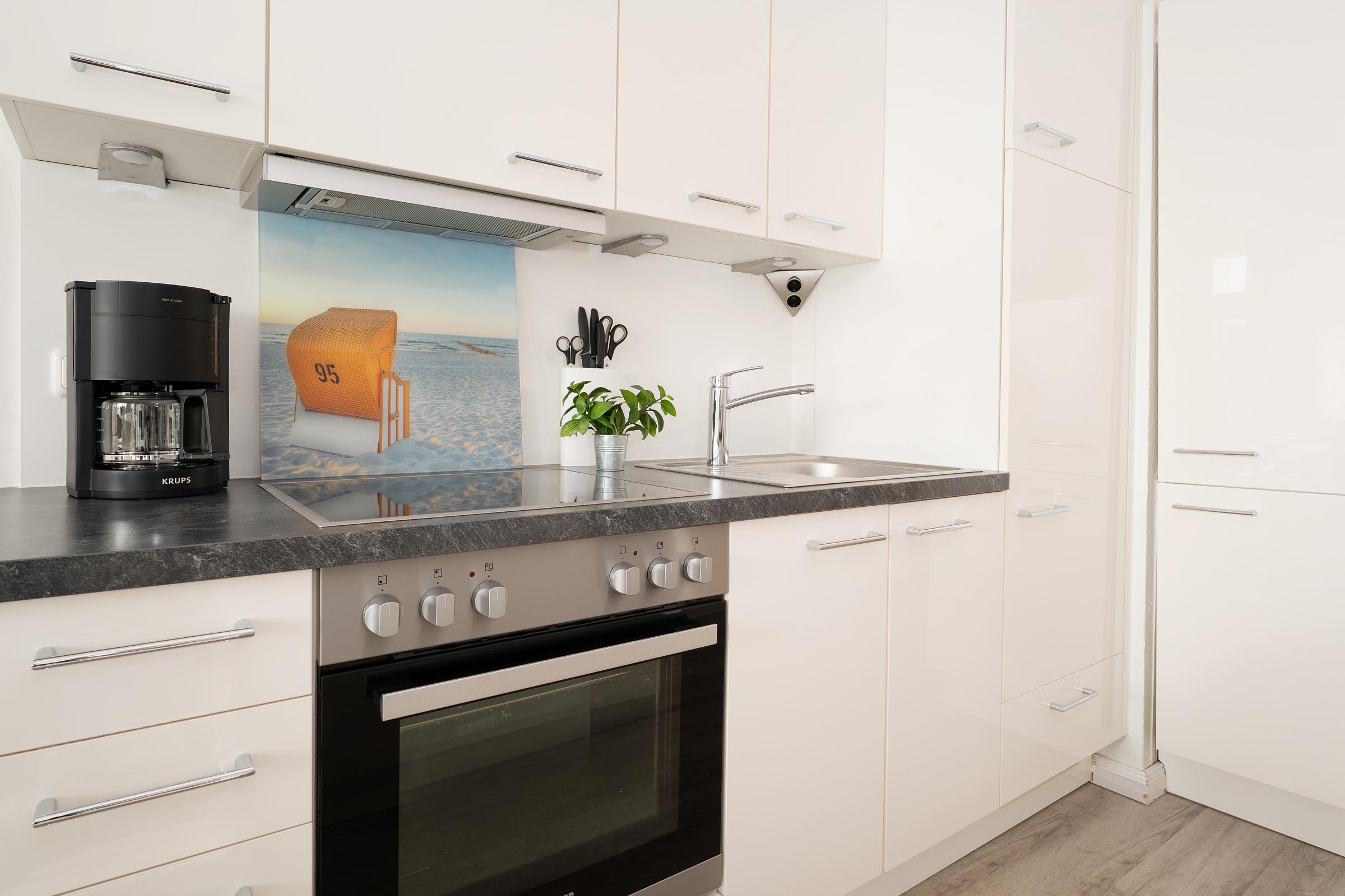 Die Ferienwohnung empfängt Sie mit einem hellen Wohnbereich, der Wohnen, Schlafen und Entspannen harmonisch miteinander verbindet. Ein bequemes Doppelbett sowie eine gemütliche Schlafsofa mit TV laden zu erholsamen Stunden ein. Vom Wohnraum aus gelangen Sie auf den Balkon, auf dem Sie die frische Ostseeluft genießen können. Die integrierte Küchenzeile ist gut ausgestattet und bietet mit Ceranfeld, Backofen, Kühlschrank, Kaffeemaschine, Wasserkocher und weiteren Küchenutensilien alles, was Sie für die Selbstverpflegung benötigen; ein Essplatz ergänzt den Raum ideal. Der Schlafbereich ist offen integriert und sorgt für komfortable Nächte. Das Badezimmer verfügt über Dusche und WC und ist funktional gestaltet.