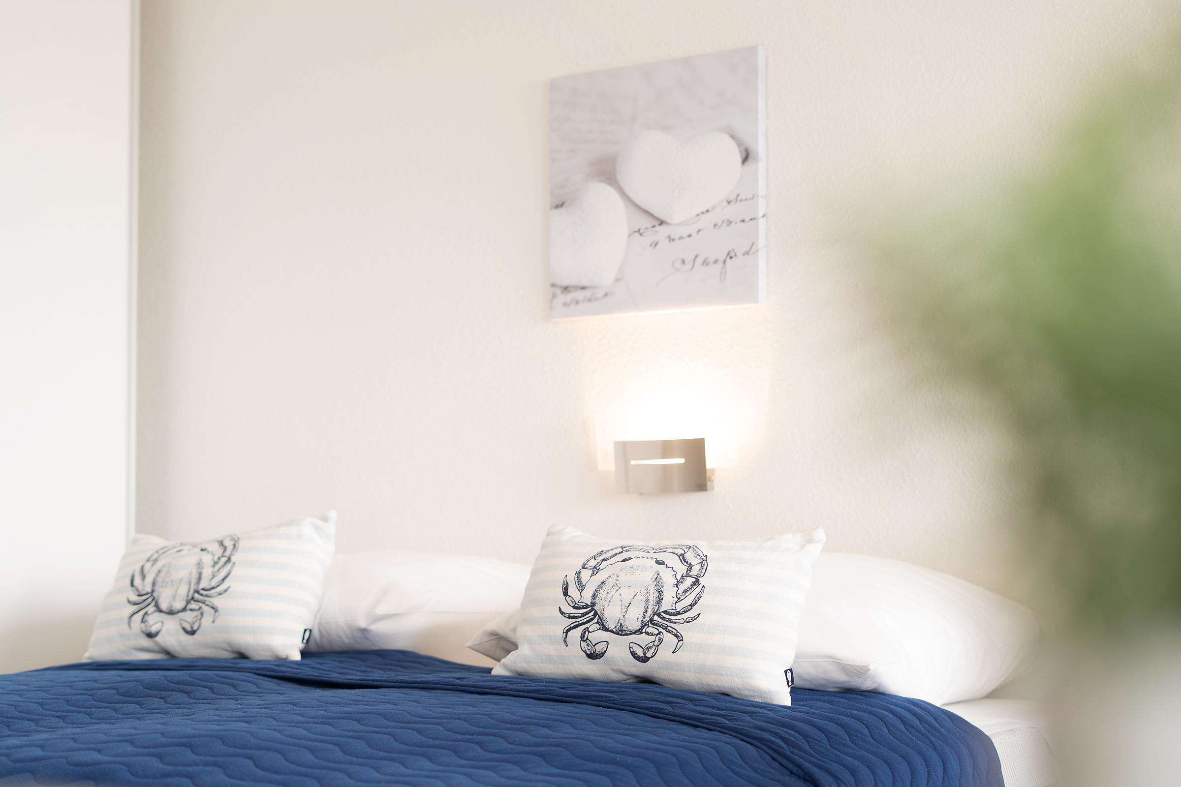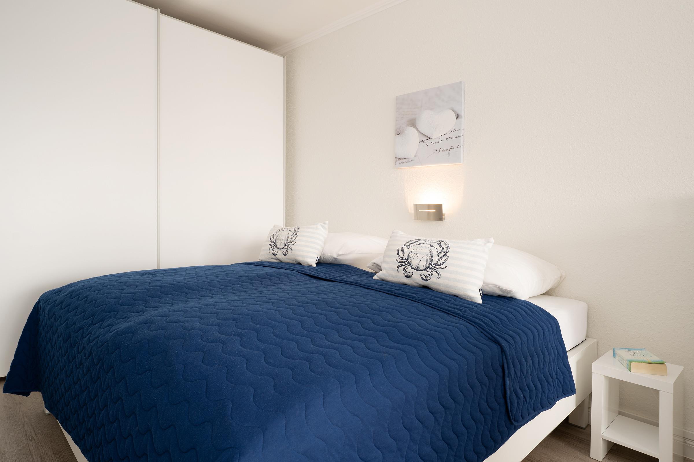 Wohn-/ Schlafzimmer: 1 Doppelbett (2x 90 x 190 cm) und 1 Schlafsofa (160 x 200 cm), Kleiderschrank, TV, Verdunkelung: Plissees, Platz für ein Babybett vorhanden