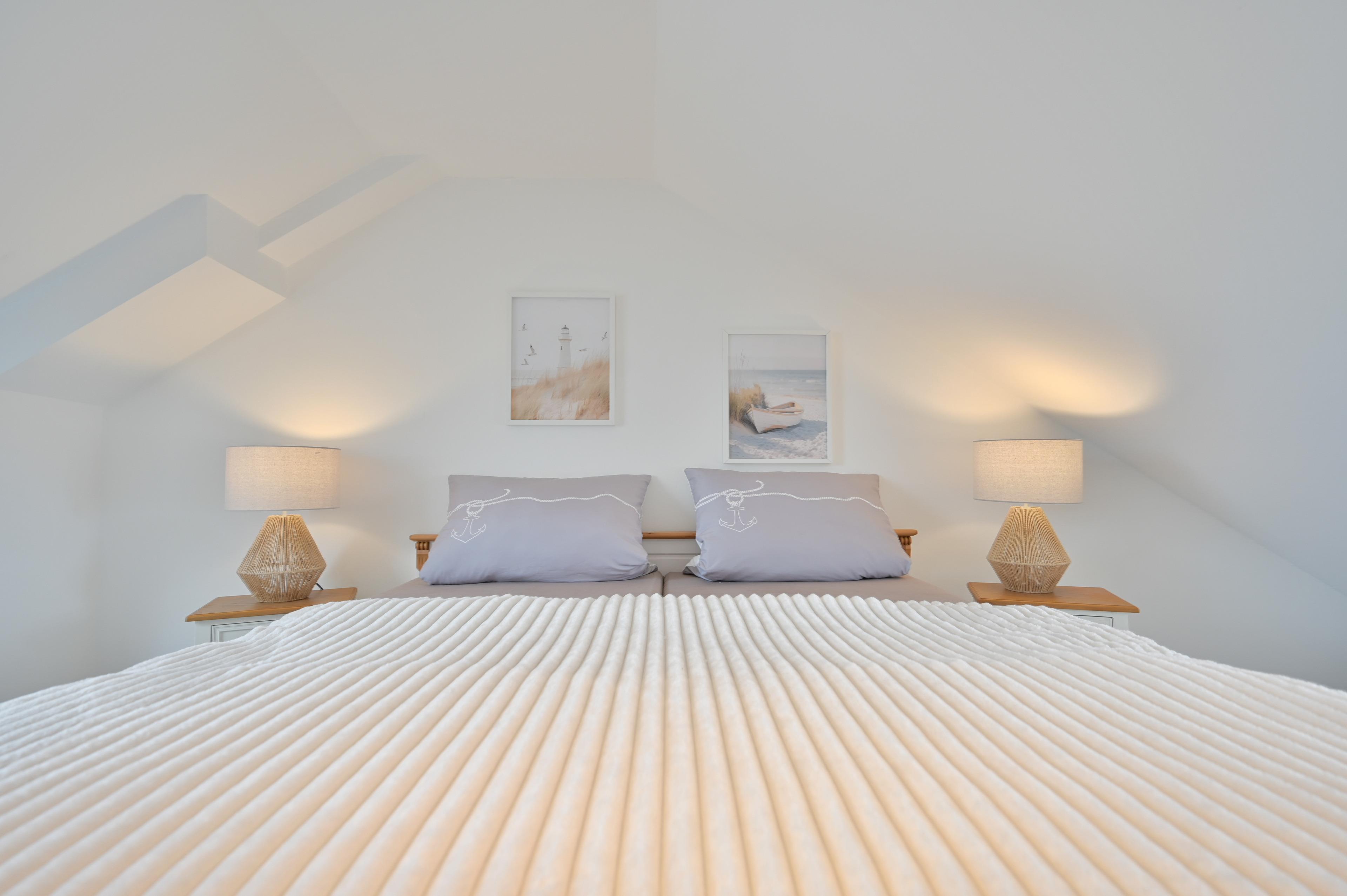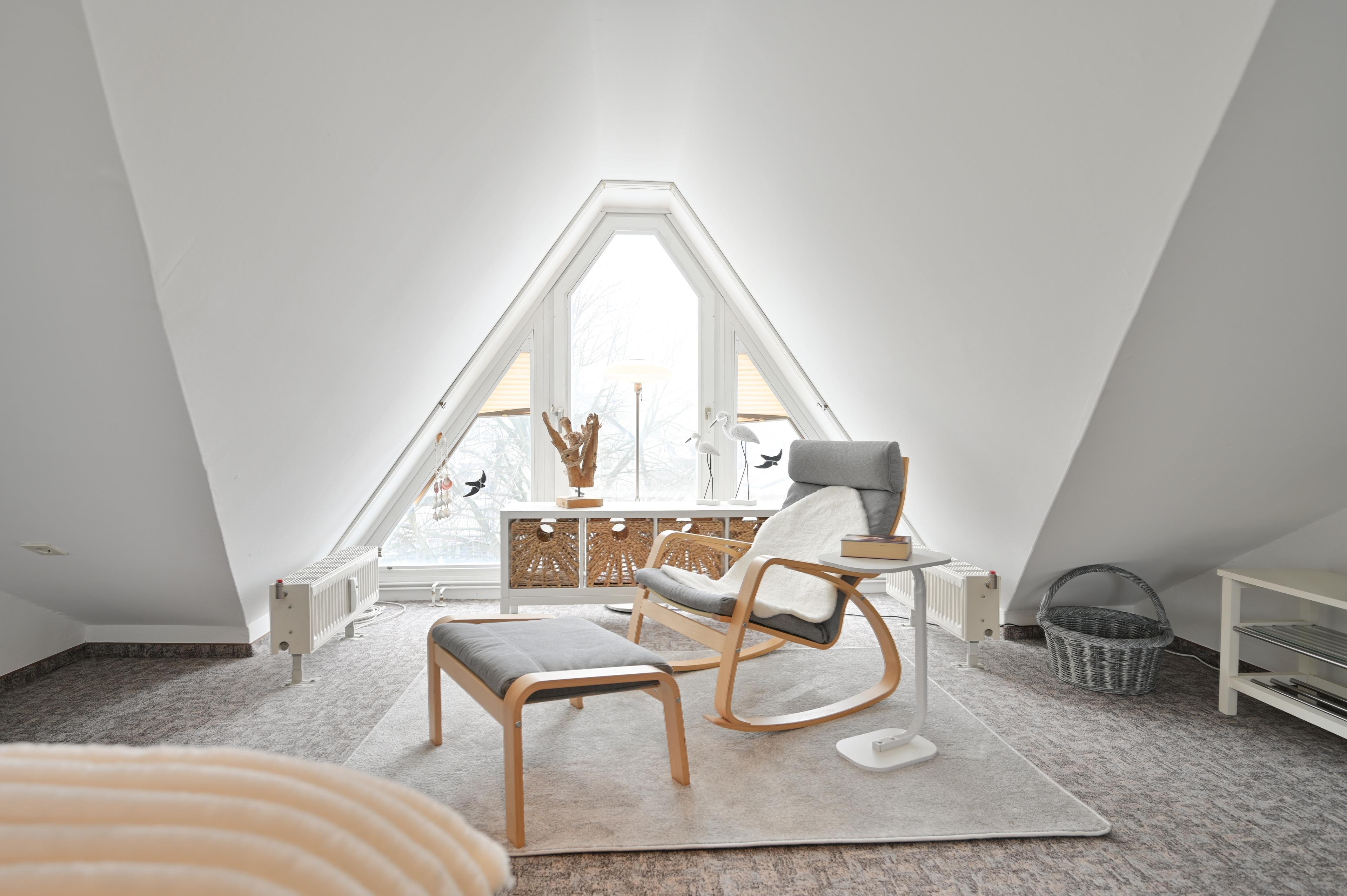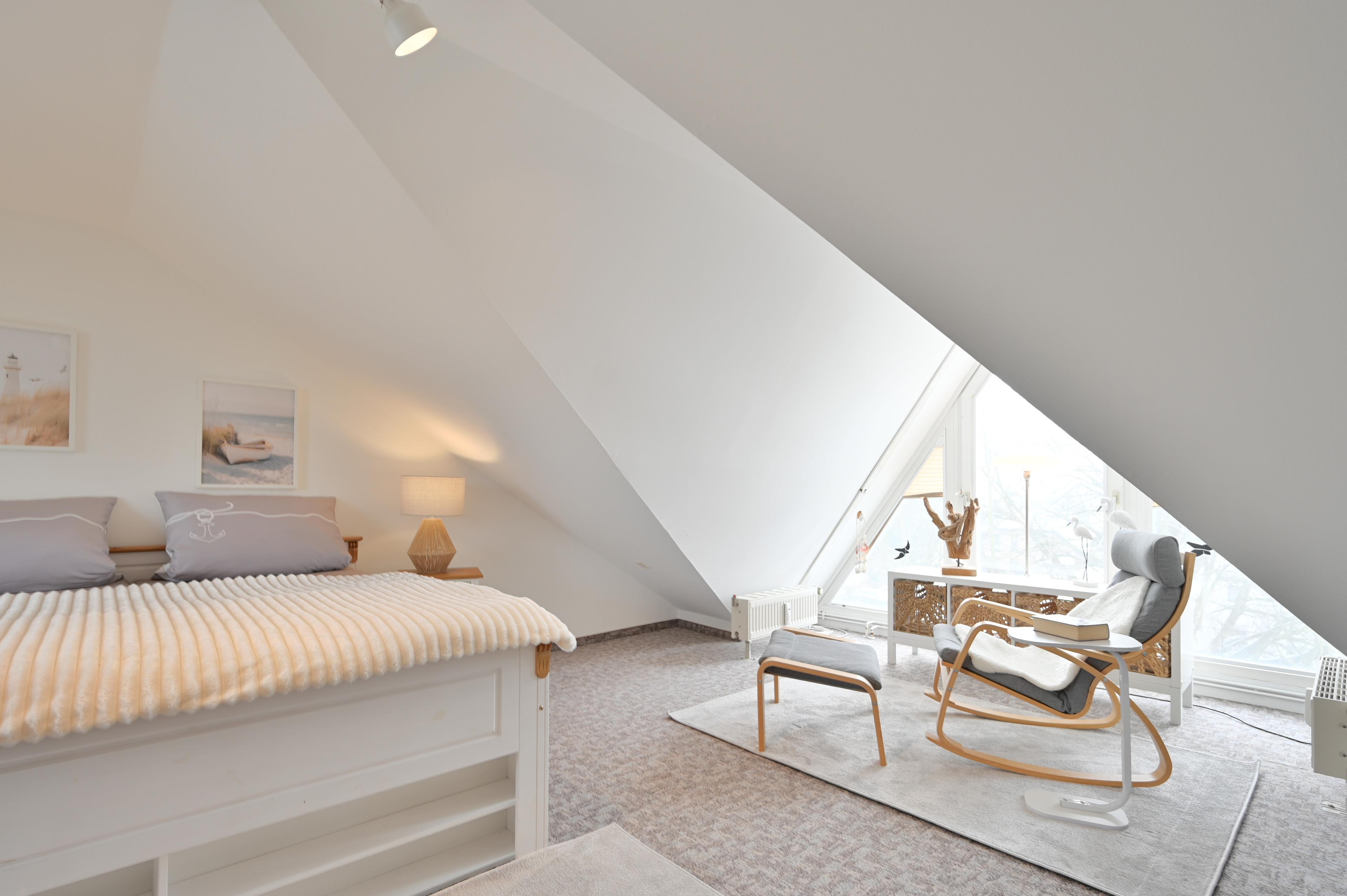 Einen weiteren Rückzugsort bietet das Studio-Schlafzimmer im Dachgeschoss, ob Sie sich im Schaukelstuhl mit Fußhocker vor dem bodentiefen Dreiecksfenster ausruhen möchten oder ein gutes Buch lesen - hier fängt Ihre Auszeit an. Das große Bett (2 x 90x200 cm) mit ergonomischen 7-Zonen Lattenrosten bietet Ihnen zudem einen erholsamen und gesunden Schlaf.