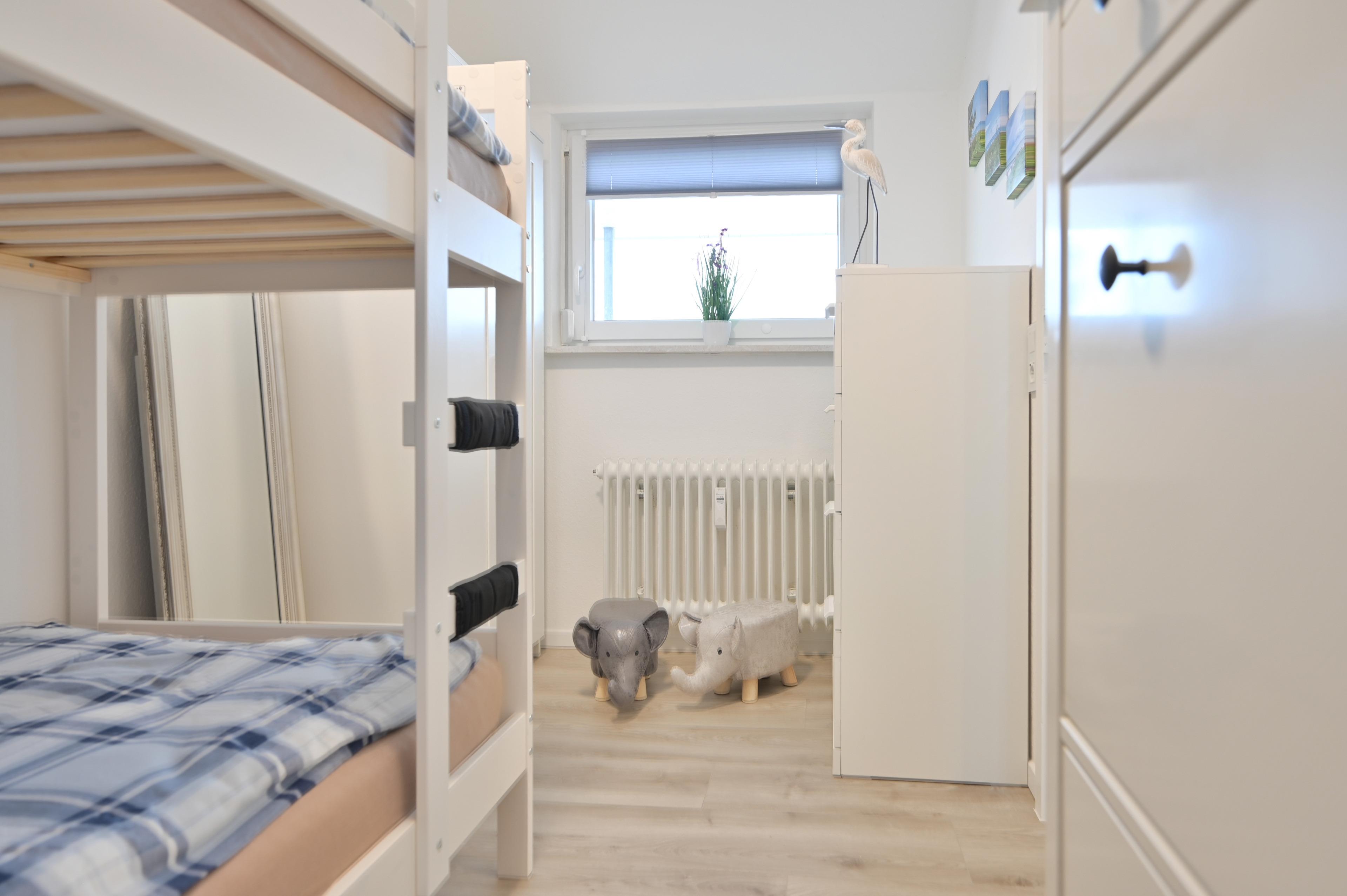 Schlafzimmer: Etagenbett (2 x 90x200 cm), Verdunkelung: Rollladen, Kleiderschrank