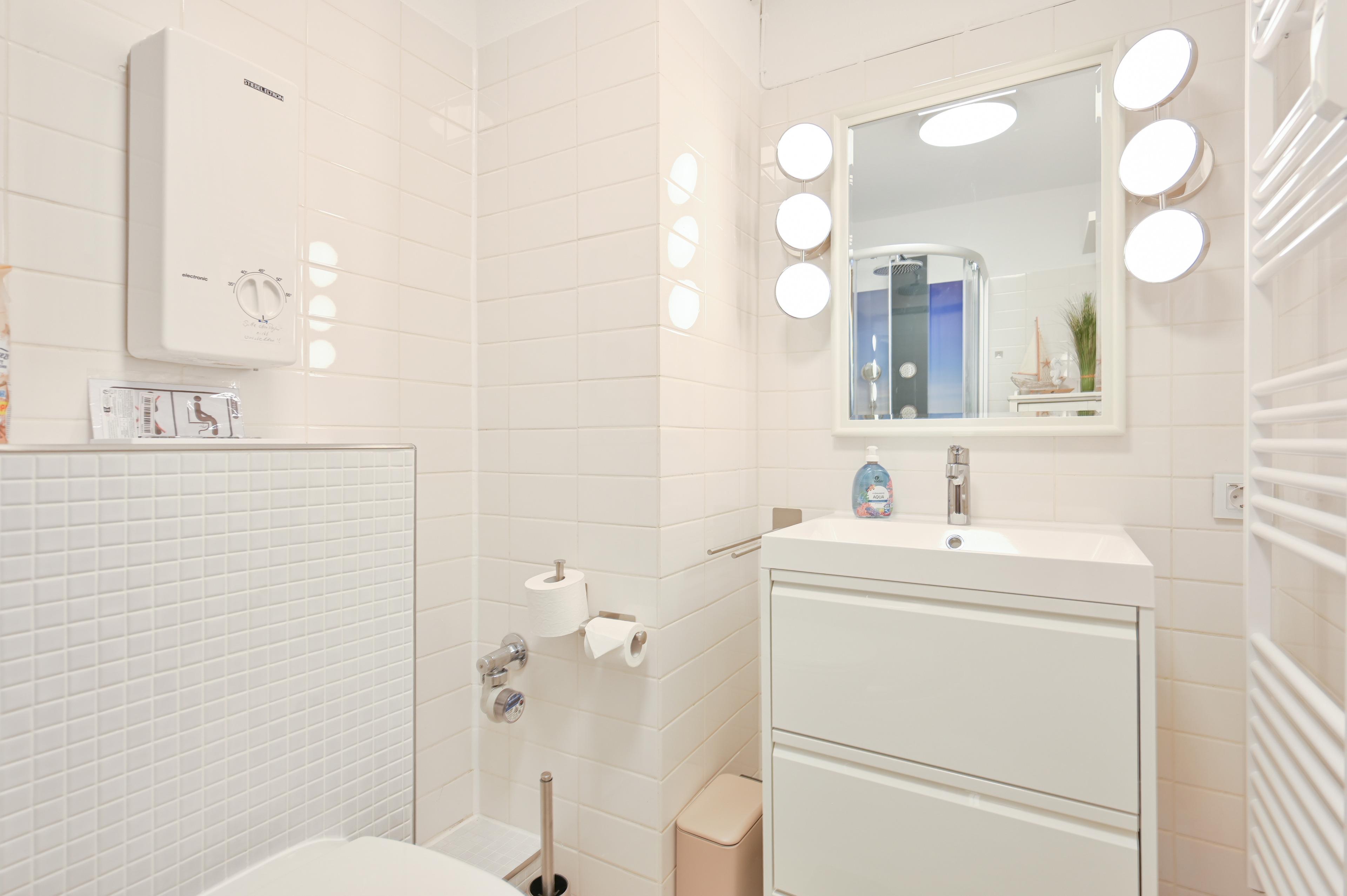 Das Duschbad im maritimen Stil ist innenliegend, lässt Vorfreude auf "Meer" entfachen und macht Sie frisch für den nächsten Strandtag ... die Ostsee ist nur rund 350 Meter entfernt.