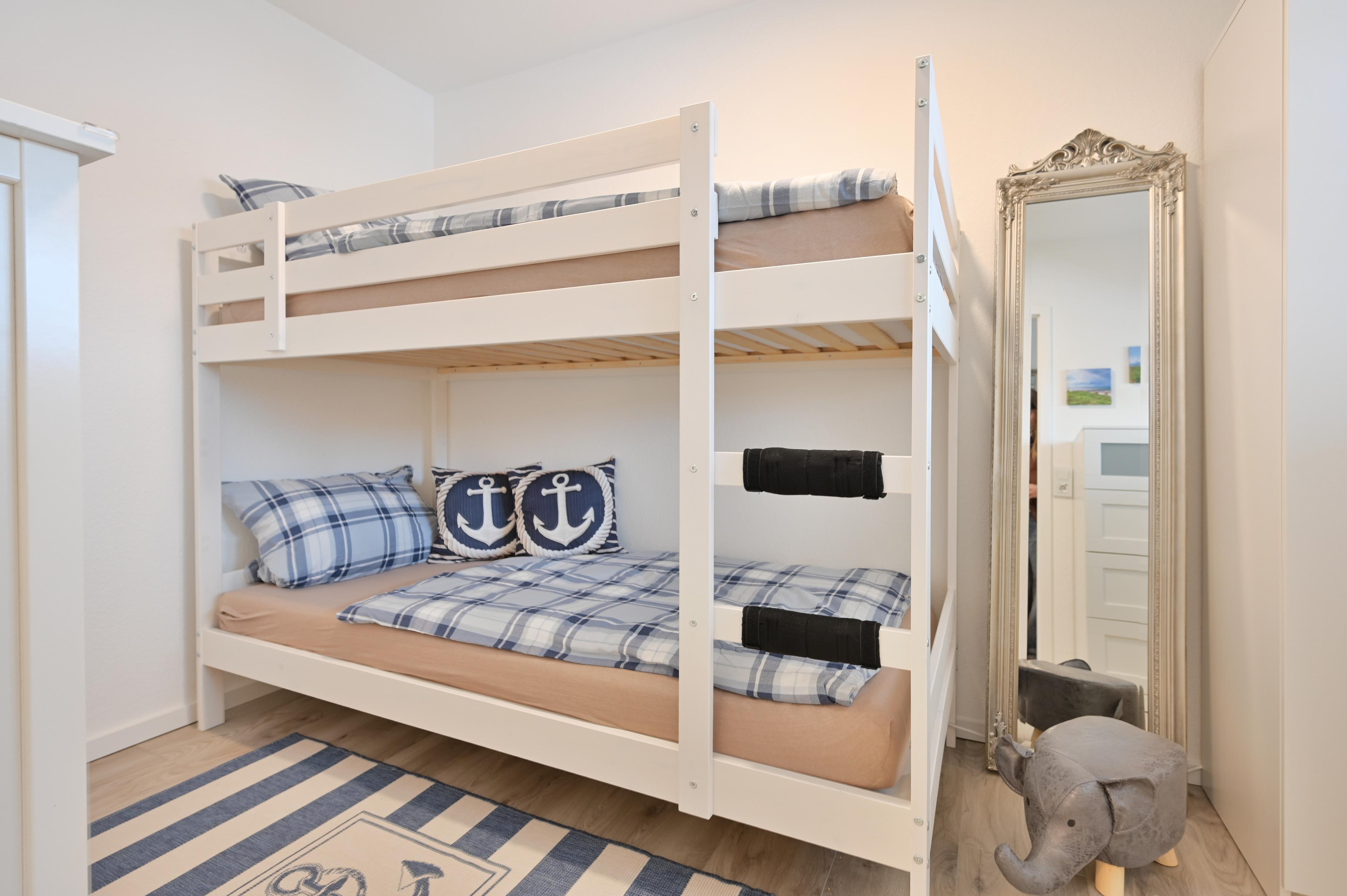 Ein zweites Schlafzimmer mit einem Etagenbett (2 x 90x200 cm) befindet sich im UG, hier können sich max. 1 Erwachsener + 1 Kind durch den Schutz der Rollladen auf ruhige und angenehme Nächte freuen.