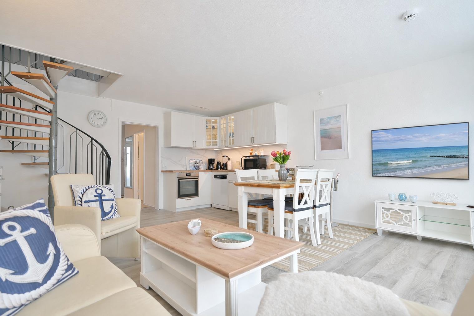 Im schönen Kellenhusen erwartet Sie diese charmante 2 1/2-Zimmer-Ferienwohnung mit einer Wohnfläche von 61 m² über 2 Ebenen im 2. Stock mit Süd-Balkon/Loggia.