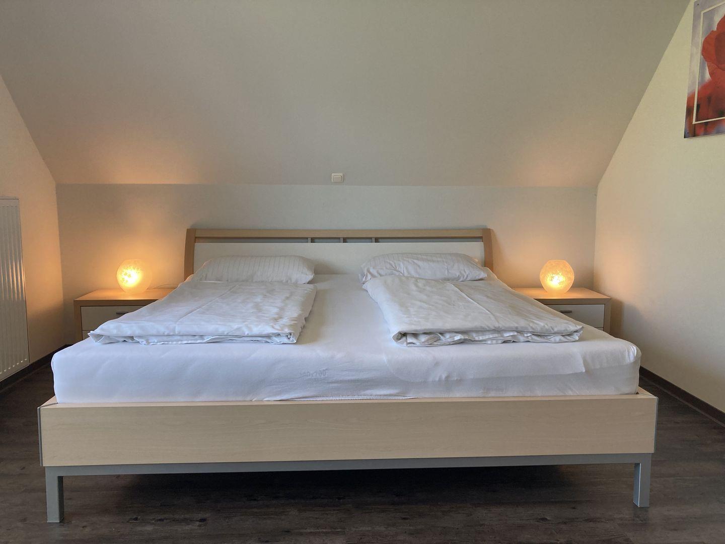 - Schlafraum mit Doppelbett (2 Matratzen á, 100 x 200 cm), Kleiderschrank TV und französischem Balkon