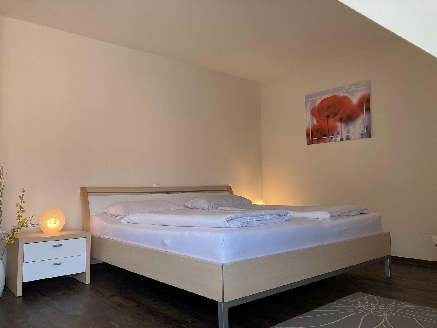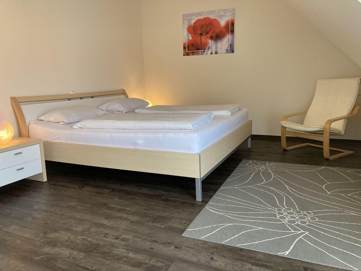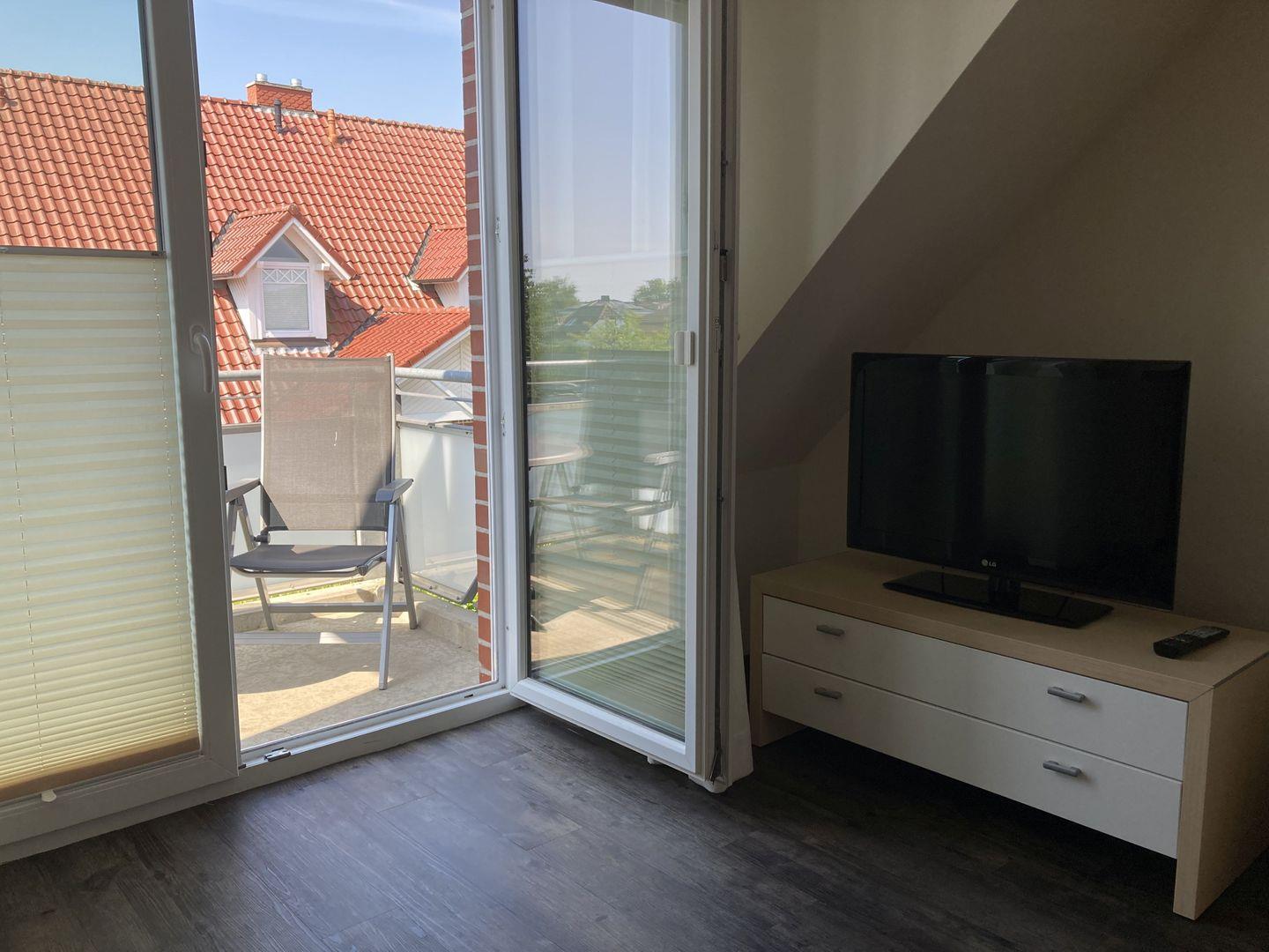 - Schlafraum mit Doppelbett (2 Matratzen á, 100 x 200 cm), Kleiderschrank, TV und Ausgang zum Balkon