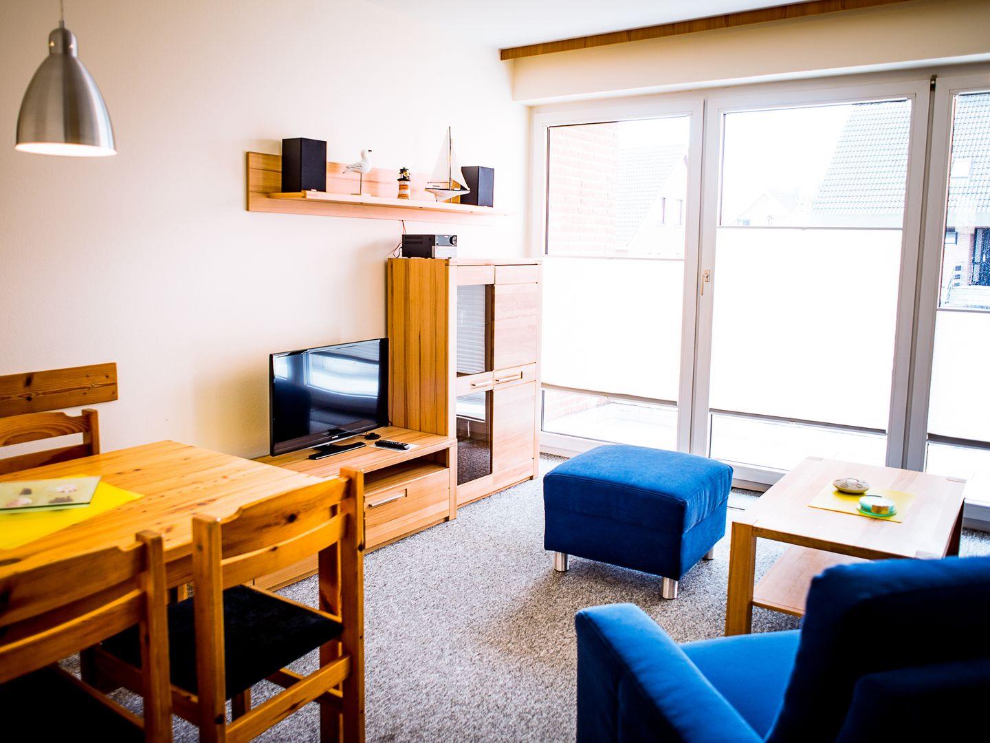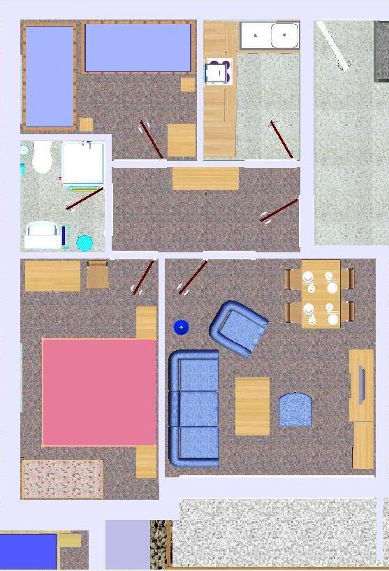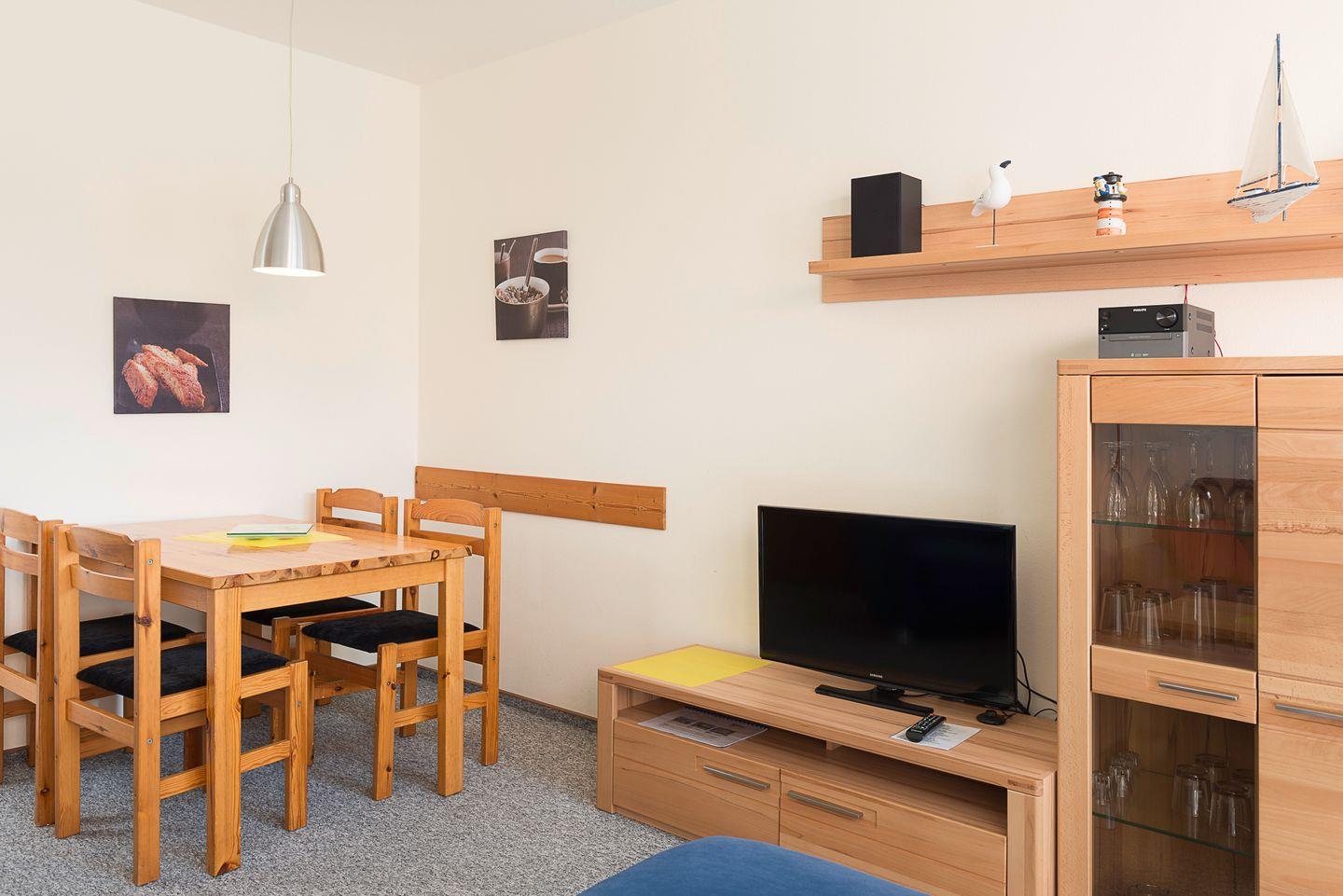 Die Wohnung ist über wenige Stufen zu erreichen und besteht aus einem Wohn-/Esszimmer, 2 Schlafzimmern (eins mit Doppelbett, eins mit zwei Einzelbetten), einer separaten Küche und einem Duschbad. In der Wohnung gibt es eine Fußbodenheizung.
